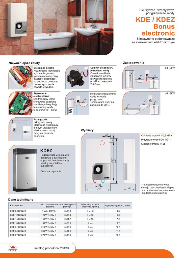 Elektryczne przepływowe podgrzewacze wody KDE / KDEZ Bonus electronic Niezawodne podgrzewacze ze sterowaniem elektronicznym Zastosowanie Najważniejsze zalety Miedziane grzałki Niezawodna technologia wykonania grzałek gwarantuje najwyższą trwałość, odporność na pęcherze powietrza i zanieczyszczenia zawarte w wodzie. Czujnik do pomiaru przepływu wody Czujnik umożliwia załączanie już przy niewielkim ciśnieniu 0,1MPa i przepływie 2,5 l/min. od 12kW Sterowanie elektroniczne Elektroniczny układ sterowania zapewnia stabilizację i regulację temperatury wody w zakresie 30 – 60OC. Możliwość dogrzewania wody wstępnie podgrzanej. Temperatura wody na zasilaniu do 70OC. od 18kW Przełącznik priorytetu pracy Możliwość współpracy z innym urządzeniem elektrycznym dużej mocy na zasadzie priorytetu. Wymiary 82 Ciśnienie wody 0,1-0,6 MPa 34 Przyłącze wodne Gw 1/2" * Stopień ochrony IP 25 KDEZ ~367 440 Podgrzewacz w metalowej obudowie o zwiększonej odporności na dewastację. Idealny do obiektów publicznych. Cena na zapytanie. ~100 120 245 Dane techniczne Kod produktu Moc znamionowa Nominalny pobór / zasilanie prądu (A) Minimalny przekrój przewodów (mm2) Wydajność (Δt=30O) (l/min.) 4 x 1,5 4,3 KDE-09 BONUS 9 kW / 400V 3~ KDE-12 BONUS 12 kW / 400V 3~ 3x17,3 4 x 2,5 5,8 KDE-15 BONUS 15 kW / 400V 3~ 3x21,7 4 x 2,5 7,2 KDE-18 BONUS 18 kW / 400V 3~ 3x26,0 4x4 8,7 KDE-21 BONUS 21 kW / 400V 3~ 3x30,3 4x4 10,1 KDE-24 BONUS 24 kW / 400V 3~ 3x34,6 4x6 11,6 KDE-27 BONUS 27 kW / 400V 3~ 3x39,0 4x6 13,0 3x13,0 katalog produktów 2013/1 * Na doprowadzeniu wody zimnej i odprowadzeniu ciepłej należy stosować rury metalowe (miedziane lub stalowe)