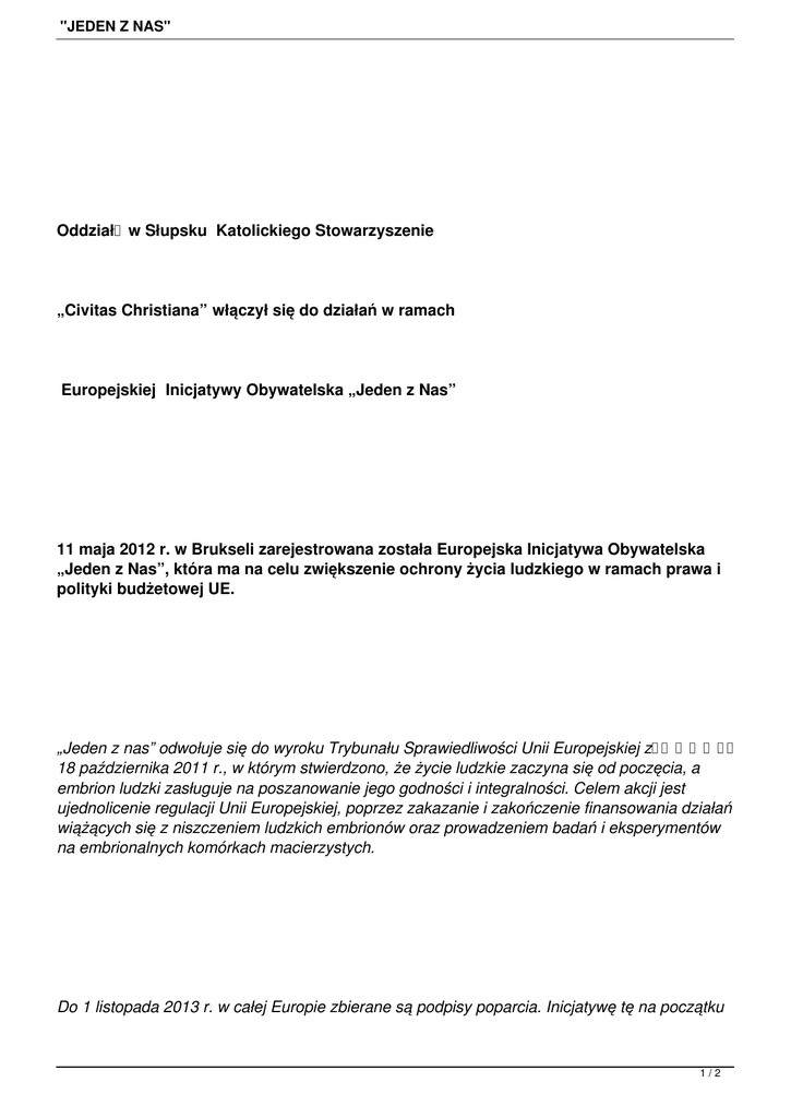 "JEDEN Z NAS" Oddział w Słupsku Katolickiego Stowarzyszenie „Civitas Christiana” włączył się do działań w ramach Europejskiej Inicjatywy Obywatelska „Jeden z Nas” 11 maja 2012 r. w Brukseli zarejestrowana została Europejska Inicjatywa Obywatelska „Jeden z Nas”, która ma na celu zwiększenie ochrony życia ludzkiego w ramach prawa i polityki budżetowej UE. „Jeden z nas” odwołuje się do wyroku Trybunału Sprawiedliwości Unii Europejskiej z 18 października 2011 r., w którym stwierdzono, że życie ludzkie zaczyna się od poczęcia, a embrion ludzki zasługuje na poszanowanie jego godności i integralności. Celem akcji jest ujednolicenie regulacji Unii Europejskiej, poprzez zakazanie i zakończenie finansowania działań wiążących się z niszczeniem ludzkich embrionów oraz prowadzeniem badań i eksperymentów na embrionalnych komórkach macierzystych. Do 1 listopada 2013 r. w całej Europie zbierane są podpisy poparcia. Inicjatywę tę na początku 1/2 "JEDEN Z NAS" lutego br. poparł papież Benedykt XVI a w marcu Episkopat Polski (komunikat z 361. zebrania Plenarnego Konferencji Episkopatu Polski) . Podpisy popierające inicjatywę „Jeden z nas” można składać zarówno w formie tradycyjnej „papierowej”, jak i wypełniając odpowiedni formularz na stronie internetowej www.jedenznas.e u lub www.jeden znas.pl . W niedzielę 5 maja, w Słupsku po Mszach Św., członkowie Stowarzyszenia „Civitas Christiana”, Akcji Katolickiej, parafialnych oddziałów „Caritas”, Rycerze Kolumba będą zbierać podpisy pod formularzami deklaracji poparcia dla Europejskiej Inicjatywy Obywatelskiej JEDEN Z NAS. Wszystkich pragnących poprzeć inicjatywę prosimy o zabranie ze sobą Dowodów Osobistych, na których znajduje się nr PESEL. Jednocześnie wszystkich posiadających dostęp do internetu zachęcamy do poparcia tej inicjatywy poprzez stronę www.jedenznas.pl . 2/2