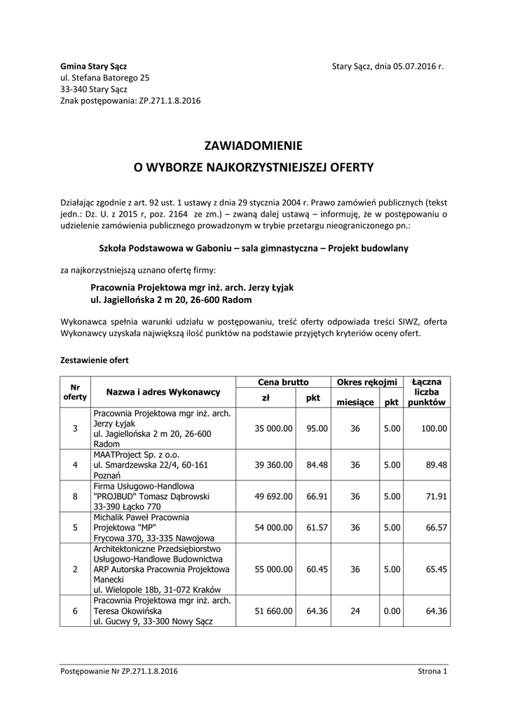 Gmina Stary Sącz ul. Stefana Batorego 25 33-340 Stary Sącz Znak postępowania: ZP.271.1.8.2016 Stary Sącz, dnia 05.07.2016 r. ZAWIADOMIENIE O WYBORZE NAJKORZYSTNIEJSZEJ OFERTY Działając zgodnie z art. 92 ust. 1 ustawy z dnia 29 stycznia 2004 r. Prawo zamówień publicznych (tekst jedn.: Dz. U. z 2015 r, poz. 2164 ze zm.) – zwaną dalej ustawą – informuję, że w postępowaniu o udzielenie zamówienia publicznego prowadzonym w trybie przetargu nieograniczonego pn.: Szkoła Podstawowa w Gaboniu – sala gimnastyczna – Projekt budowlany za najkorzystniejszą uznano ofertę firmy: Pracownia Projektowa mgr inż. arch. Jerzy Łyjak ul. Jagiellońska 2 m 20, 26-600 Radom Wykonawca spełnia warunki udziału w postępowaniu, treść oferty odpowiada treści SIWZ, oferta Wykonawcy uzyskała największą ilość punktów na podstawie przyjętych kryteriów oceny ofert. Zestawienie ofert Nr oferty 3 4 8 5 2 6 Nazwa i adres Wykonawcy Pracownia Projektowa mgr inż. arch. Jerzy Łyjak ul. Jagiellońska 2 m 20, 26-600 Radom MAATProject Sp. z o.o. ul. Smardzewska 22/4, 60-161 Poznań Firma Usługowo-Handlowa "PROJBUD" Tomasz Dąbrowski 33-390 Łącko 770 Michalik Paweł Pracownia Projektowa "MP" Frycowa 370, 33-335 Nawojowa Architektoniczne Przedsiębiorstwo Usługowo-Handlowe Budownictwa ARP Autorska Pracownia Projektowa Manecki ul. Wielopole 18b, 31-072 Kraków Pracownia Projektowa mgr inż. arch. Teresa Okowińska ul. Gucwy 9, 33-300 Nowy Sącz Postępowanie Nr ZP.271.1.8.2016 Cena brutto zł pkt miesiące pkt Łączna liczba punktów Okres rękojmi 35 000.00 95.00 36 5.00 100.00 39 360.00 84.48 36 5.00 89.48 49 692.00 66.91 36 5.00 71.91 54 000.00 61.57 36 5.00 66.57 55 000.00 60.45 36 5.00 65.45 51 660.00 64.36 24 0.00 64.36 Strona 1 Nr oferty 1 7 Nazwa i adres Wykonawcy Przedsiębiorstwo ProjektowoBudowlane "EKOBUD" s.c. Ewa i Remigiusz Owczarek Dmosin Drugi nr 89B, 95-061 Dmosin ETA Sp. z o.o. Biuro Projektów ul. Śniadeckich 8, 33-300 Nowy Sącz Postępowanie Nr ZP.271.1.8.2016 Cena brutto zł pkt miesiące pkt Łączna liczba punktów 61.32 Okres rękojmi 59 040.00 56.32 36 5.00 49 200.00 --- 36 --- --- Strona 2