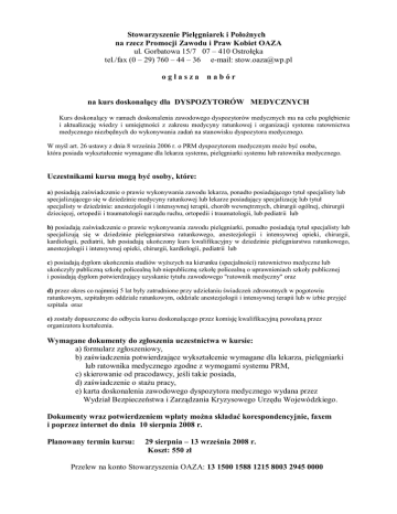 Stowarzyszenie Pielęgniarek i Położnych na rzecz Promocji Zawodu i Praw Kobiet OAZA ul. Gorbatowa 15/7 07 – 410 Ostrołęka tel./fax (0 – 29) 760 – 44 – 36 e-mail: [email protected] ogłasza nabór na kurs doskonalący dla DYSPOZYTORÓW MEDYCZNYCH Kurs doskonalący w ramach doskonalenia zawodowego dyspozytorów medycznych ma na celu pogłębienie i aktualizację wiedzy i umiejętności z zakresu medycyny ratunkowej i organizacji systemu ratownictwa medycznego niezbędnych do wykonywania zadań na stanowisku dyspozytora medycznego. W myśl art. 26 ustawy z dnia 8 września 2006 r. o PRM dyspozytorem medycznym może być osoba, która posiada wykształcenie wymagane dla lekarza systemu, pielęgniarki systemu lub ratownika medycznego. Uczestnikami kursu mogą być osoby, które: a) posiadają zaświadczenie o prawie wykonywania zawodu lekarza, ponadto posiadającego tytuł specjalisty lub specjalizującego się w dziedzinie medycyny ratunkowej lub lekarze posiadający specjalizację lub tytuł specjalisty w dziedzinie: anestezjologii i intensywnej terapii, chorób wewnętrznych, chirurgii ogólnej, chirurgii dziecięcej, ortopedii i traumatologii narządu ruchu, ortopedii i traumatologii, lub pediatrii lub b) posiadają zaświadczenie o prawie wykonywania zawodu pielęgniarki, ponadto posiadają tytuł specjalisty lub specjalizują się w dziedzinie pielęgniarstwa ratunkowego, anestezjologii i intensywnej opieki, chirurgii, kardiologii, pediatrii, lub posiadają ukończony kurs kwalifikacyjny w dziedzinie pielęgniarstwa ratunkowego, anestezjologii i intensywnej opieki, chirurgii, kardiologii, pediatrii lub c) posiadają dyplom ukończenia studiów wyższych na kierunku (specjalności) ratownictwo medyczne lub ukończyły publiczną szkołę policealną lub niepubliczną szkołę policealną o uprawnieniach szkoły publicznej i posiadają dyplom potwierdzający uzyskanie tytułu zawodowego "ratownik medyczny" oraz d) przez okres co najmniej 5 lat były zatrudnione przy udzielaniu świadczeń zdrowotnych w pogotowiu ratunkowym, szpitalnym oddziale ratunkowym, oddziale anestezjologii i intensywnej terapii lub w izbie przyjęć szpitala oraz e) zostały dopuszczone do odbycia kursu doskonalącego przez komisję kwalifikacyjną powołaną przez organizatora kształcenia. Wymagane dokumenty do zgłoszenia uczestnictwa w kursie: a) formularz zgłoszeniowy, b) zaświadczenia potwierdzające wykształcenie wymagane dla lekarza, pielęgniarki lub ratownika medycznego zgodne z wymogami systemu PRM, c) skierowanie od pracodawcy, jeśli takie posiada, d) zaświadczenie o stażu pracy, e) karta doskonalenia zawodowego dyspozytora medycznego wydana przez Wydział Bezpieczeństwa i Zarządzania Kryzysowego Urzędu Wojewódzkiego. Dokumenty wraz potwierdzeniem wpłaty można składać korespondencyjnie, faxem i poprzez internet do dnia 10 sierpnia 2008 r. Planowany termin kursu: 29 sierpnia – 13 września 2008 r. Koszt: 550 zł Przelew na konto Stowarzyszenia OAZA: 13 1500 1588 1215 8003 2945 0000 Informacje dla dyspozytorów medycznych z CMKP Dyspozytor medyczny zgłasza się po odbiór karty przebiegu doskonalenia zawodowego do odpowiedniego podmiotu, któremu w danym województwie powierzono zadania związane z wydawaniem kart doskonalenia zawodowego (patrz wykaz poniżej) Dyspozytor medyczny potwierdza w karcie doskonalenia zawodowego ukończony i zaliczony kurs doskonalący oraz ukończone seminarium a następnie przedstawia kartę dysponentowi jednostki celem zaliczenia doskonalenia zawodowego. L. p. Województwo 1. Dolnośląskie 2. Kujawsko-Pomorskie 3. Lubelskie 4. Lubuskie 5. Łódzkie 6. Małopolskie 7. Mazowieckie 8. Opolskie 9. Podlaskie 10. Podkarpackie 11. Pomorskie 12. Śląskie 13. Świętokrzyskie 14. Warmińsko-Mazurskie 15. Wielkopolskie 16. Zachodniopomorskie Podmioty, którym powierzono zadania związane z wydawaniem kart doskonalenia zawodowego dla ratowników medycznych i dyspozytorów medycznych Wydział Polityki Społecznej Dolnośląskiego Urzędu Wojewódzkiego we Wrocławiu, pl. Powstańców Warszawy 1 Oddział – Państwowe Ratownictwo Medyczne – Wydziału Zarządzania Kryzysowego Kujawsko-Pomorskiego Urzędu Wojewódzkiego w Bydgoszczy, ul. Jagiellońska 3 Lubelskie Centrum Zdrowia Publicznego – Zakład Doskonalenia Kadr Medycznych, ul. Weteranów 13 Lubuskie Centrum Zdrowia Publicznego w Gorzowie Wielkopolskim, ul. Teatralna 30 Wojewódzkie Centrum Zdrowia Publicznego w Łodzi, ul. Roosevelta 18 Małopolskie Centrum Zdrowia Publicznego w Krakowie, ul. Krupnicza 11a Wydział Bezpieczeństwa i Zarządzania Kryzysowego Mazowieckiego Urzędu Wojewódzkiego, Pl. Bankowy 3/5 Opolskie Centrum Zdrowia Publicznego – Ośrodek Doskonalenia Kadr Medycznych, ul. Mickiewicza 1 Podlaskie Centrum Zdrowia Publicznego,ul. Dojlidy Fabryczne 23 Podkarpackie Centrum Zdrowia Publicznego w Rzeszowie, ul. Warzywna 3a Pomorskie Centrum Zdrowia Publicznego w Gdańsku – Dział Doskonalenia Kadr Medycznych w Gdańsku, ul. Na Stoku 50 Oddział Ratownictwa Medycznego Wydziału Bezpieczeństwa i Zarządzania Kryzysowego Śląskiego Urzędu Wojewódzkiego w Katowicach, ul. Jagiellońska 25 Świętokrzyskie Centrum Monitorowania Ochrony Zdrowia w Kielcach, Al. IX Wieków Kielc 3 Warmińsko-Mazurskie Centrum Zdrowia Publicznego w Olsztynie, ul. Dworcowa 60 Wydział Zarządzania Kryzysowego Wielkopolskiego Urzędu Wojewódzkiego w Poznaniu, al. Niepodległości 16/18 Zachodniopomorskie Centrum Organizacji i Promocji Zdrowia w Szczecinie – Dział Doskonalenia Kadr Medycznych, ul. Odzieżowa 33 Miejsce szkolenia: Ostrołęka ul. Gorbatowa 15 tel./fax (0 – 29) 760 – 44 – 36 Osoba odpowiedzialna: Alicja Palczewska Informacja dotycząca bazy hotelowej w Ostrołęce 1. SZP ZOZ – Pokoje gościnne AL. Jana Pawła II 120 07 – 410 Ostrołęka Tel. (0 – 29) 760 – 58 – 62 Pokój 1 – osobowy – cena: 55 zł/doba Pokój 2 – osobowy – cena: 69 zł/doba Pokój 3 – osobowy –