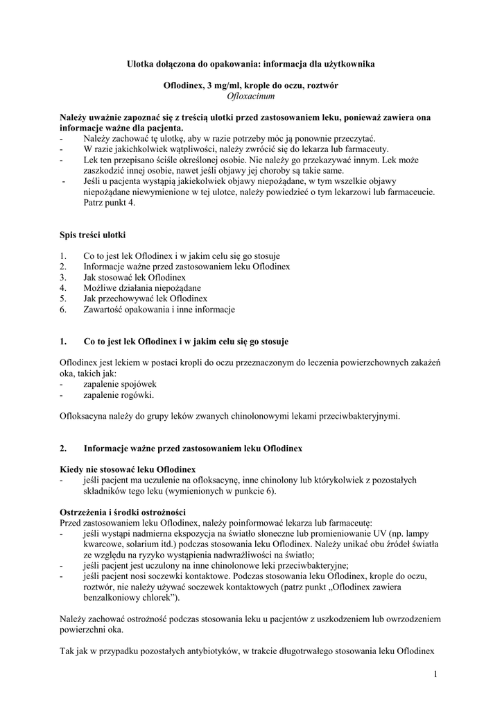 Ulotka dołączona do opakowania: informacja dla użytkownika Oflodinex, 3 mg/ml, krople do oczu, roztwór Ofloxacinum Należy uważnie zapoznać się z treścią ulotki przed zastosowaniem leku, ponieważ zawiera ona informacje ważne dla pacjenta. Należy zachować tę ulotkę, aby w razie potrzeby móc ją ponownie przeczytać. W razie jakichkolwiek wątpliwości, należy zwrócić się do lekarza lub farmaceuty. Lek ten przepisano ściśle określonej osobie. Nie należy go przekazywać innym. Lek może zaszkodzić innej osobie, nawet jeśli objawy jej choroby są takie same. Jeśli u pacjenta wystąpią jakiekolwiek objawy niepożądane, w tym wszelkie objawy niepożądane niewymienione w tej ulotce, należy powiedzieć o tym lekarzowi lub farmaceucie. Patrz punkt 4. Spis treści ulotki 1. 2. 3. 4. 5. 6. Co to jest lek Oflodinex i w jakim celu się go stosuje Informacje ważne przed zastosowaniem leku Oflodinex Jak stosować lek Oflodinex Możliwe działania niepożądane Jak przechowywać lek Oflodinex Zawartość opakowania i inne informacje 1. Co to jest lek Oflodinex i w jakim celu się go stosuje Oflodinex jest lekiem w postaci kropli do oczu przeznaczonym do leczenia powierzchownych zakażeń oka, takich jak: zapalenie spojówek zapalenie rogówki. Ofloksacyna należy do grupy leków zwanych chinolonowymi lekami przeciwbakteryjnymi. 2. Informacje ważne przed zastosowaniem leku Oflodinex Kiedy nie stosować leku Oflodinex jeśli pacjent ma uczulenie na ofloksacynę, inne chinolony lub którykolwiek z pozostałych składników tego leku (wymienionych w punkcie 6). Ostrzeżenia i środki ostrożności Przed zastosowaniem leku Oflodinex, należy poinformować lekarza lub farmaceutę: jeśli wystąpi nadmierna ekspozycja na światło słoneczne lub promieniowanie UV (np. lampy kwarcowe, solarium itd.) podczas stosowania leku Oflodinex. Należy unikać obu źródeł światła ze względu na ryzyko wystąpienia nadwrażliwości na światło; jeśli pacjent jest uczulony na inne chinolonowe leki przeciwbakteryjne; jeśli pacjent nosi soczewki kontaktowe. Podczas stosowania leku Oflodinex, krople do oczu, roztwór, nie należy używać soczewek kontaktowych (patrz punkt „Oflodinex zawiera benzalkoniowy chlorek”). Należy zachować ostrożność podczas stosowania leku u pacjentów z uszkodzeniem lub owrzodzeniem powierzchni oka. Tak jak w przypadku pozostałych antybiotyków, w trakcie długotrwałego stosowania leku Oflodinex 1 może dojść do namnożenia się niewrażliwych drobnoustrojów chorobotwórczych. W razie wystąpienia tego typu infekcji w trakcie leczenia, lekarz podejmie odpowiednie środki. Dzieci i młodzież Istnieje ograniczone doświadczenie w stosowaniu kropli do oczu zawierających ofloksacynę u dzieci. Przed zastosowaniem leku u dzieci, należy skontaktować się z lekarzem. Oflodinex a inne leki Należy powiedzieć lekarzowi o wszystkich lekach przyjmowanych przez pacjenta obecnie lub ostatnio, a także o lekach, które pacjent planuje przyjmować. W przypadku jednoczesnego stosowania innych kropli/maści do oczu, należy zachować przynajmniej 15-minutową przerwę pomiędzy podaniem poszczególnych leków. Maści do oczu należy zawsze stosować na końcu. Ciąża i karmienie piersią Należy poinformować lekarza, jeśli pacjentka jest w ciąży lub karmi piersią. Lekarz poradzi pacjentce czy może stosować ten lek. Prowadzenie pojazdów i obsługiwanie maszyn Stosowanie leku Oflodinex może wywołać nieostre widzenie. Objawy te mogą utrzymywać się przez kilka minut. W tym czasie nie należy obsługiwać maszyn, pracować bez mocnego oparcia lub prowadzić pojazdów. Oflodinex zawiera benzalkoniowy chlorek Benzalkoniowy chlorek może powodować podrażnienie oczu i zmieniać zabarwienie miękkich soczewek kontaktowych. Należy unikać kontaktu z miękkimi soczewkami kontaktowymi. Stosowanie soczewek kontaktowych w trakcie leczenia zakażeń oka nie jest zalecane. 3. Jak stosować lek Oflodinex Ten lek należy zawsze stosować zgodnie z zaleceniami lekarza. W razie wątpliwości należy zwrócić się do lekarza lub farmaceuty. U pacjentów we wszystkich grupach wiekowych zalecana dawka wynosi: 1 kropla leku Oflodinex co 2 - 4 godziny do worka spojówkowego zainfekowanego oka (oczu) przez pierwsze dwa dni a następnie 4 razy na dobę. W przypadku nasilenia infekcji lub braku poprawy po kilku dniach, należy skontaktować się z lekarzem. Czas trwania leczenia Leku nie należy stosować dłużej niż przez 14 dni. Zastosowanie większej niż zalecana dawki leku Oflodinex Dotychczas nie zgłoszono żadnego przypadku przedawkowania. W przypadku zakroplenia zbyt dużej ilości kropli do oka (oczu), przemyć oko czystą wodą. W przypadku wystąpienia ogólnych działań niepożądanych po nieprawidłowym zastosowaniu leku lub przypadkowym przedawkowaniu lub spożyciu, należy wdrożyć leczenie systemowe. W tym przypadku należy skontaktować się z lekarzem. Pominięcie zastosowania leku Oflodinex Nie należy stosować dawki podwójnej w celu uzupełnienia pominiętej dawki. Należy zastosować 2 kolejną dawkę niezwłocznie po przypomnieniu sobie. Następnie, należy stosować lek zgodnie ze schematem dawkowania podanym powyżej lub zgodnie z zaleceniami lekarza. W razie jakichkolwiek dalszych wątpliwości związanych ze stosowaniem tego leku, należy zwrócić się do lekarza lub farmaceuty. 4. Możliwe działania niepożądane Jak każdy lek, ten lek może powodować działania niepożądane, chociaż nie u każdego one wystąpią. Częstość nieznana (nie może być określona na podstawie dostępnych danych): Podczas stosowania ofloksacyny w postaci kropli do oczu zgłaszano wystąpienie mogących zagrażać życiu wysypek skórnych (zespół Stevensa-Johnsona, toksyczne martwicze oddzielanie się naskórka), występujących początkowo w postaci czerwonawych plamek lub owalnych plam na tułowiu, często z pęcherzami po środku. W razie wyst