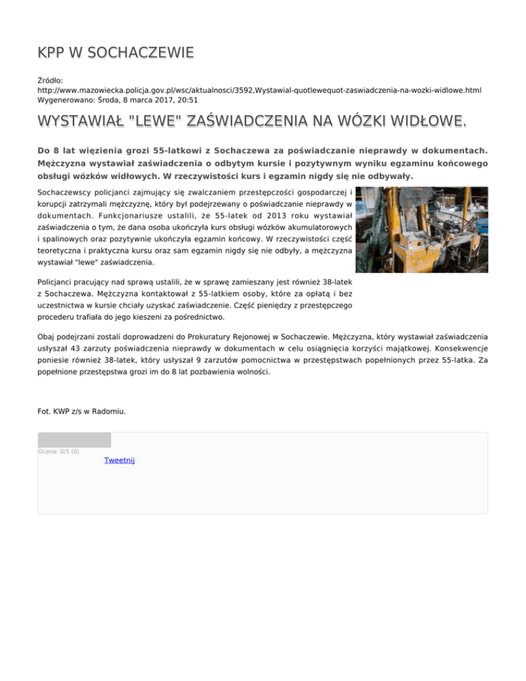 KPP W SOCHACZEWIE Źródło: http://www.mazowiecka.policja.gov.pl/wsc/aktualnosci/3592,Wystawial-quotlewequot-zaswiadczenia-na-wozki-widlowe.html Wygenerowano: Środa, 8 marca 2017, 20:51 WYSTAWIAŁ "LEWE" ZAŚWIADCZENIA NA WÓZKI WIDŁOWE. Do 8 lat więzienia grozi 55-latkowi z Sochaczewa za poświadczanie nieprawdy w dokumentach. Mężczyzna wystawiał zaświadczenia o odbytym kursie i pozytywnym wyniku egzaminu końcowego obsługi wózków widłowych. W rzeczywistości kurs i egzamin nigdy się nie odbywały. Sochaczewscy policjanci zajmujący się zwalczaniem przestępczości gospodarczej i korupcji zatrzymali mężczyznę, który był podejrzewany o poświadczanie nieprawdy w dokumentach. Funkcjonariusze ustalili, że 55-latek od 2013 roku wystawiał zaświadczenia o tym, że dana osoba ukończyła kurs obsługi wózków akumulatorowych i spalinowych oraz pozytywnie ukończyła egzamin końcowy. W rzeczywistości część teoretyczna i praktyczna kursu oraz sam egzamin nigdy się nie odbyły, a mężczyzna wystawiał "lewe" zaświadczenia. Policjanci pracujący nad sprawą ustalili, że w sprawę zamieszany jest również 38-latek z Sochaczewa. Mężczyzna kontaktował z 55-latkiem osoby, które za opłatą i bez uczestnictwa w kursie chciały uzyskać zaświadczenie. Część pieniędzy z przestępczego procederu trafiała do jego kieszeni za pośrednictwo. Obaj podejrzani zostali doprowadzeni do Prokuratury Rejonowej w Sochaczewie. Mężczyzna, który wystawiał zaświadczenia usłyszał 43 zarzuty poświadczenia nieprawdy w dokumentach w celu osiągnięcia korzyści majątkowej. Konsekwencje poniesie również 38-latek, który usłyszał 9 zarzutów pomocnictwa w przestępstwach popełnionych przez 55-latka. Za popełnione przestępstwa grozi im do 8 lat pozbawienia wolności. Fot. KWP z/s w Radomiu. Ocena: 0/5 (0) Tweetnij