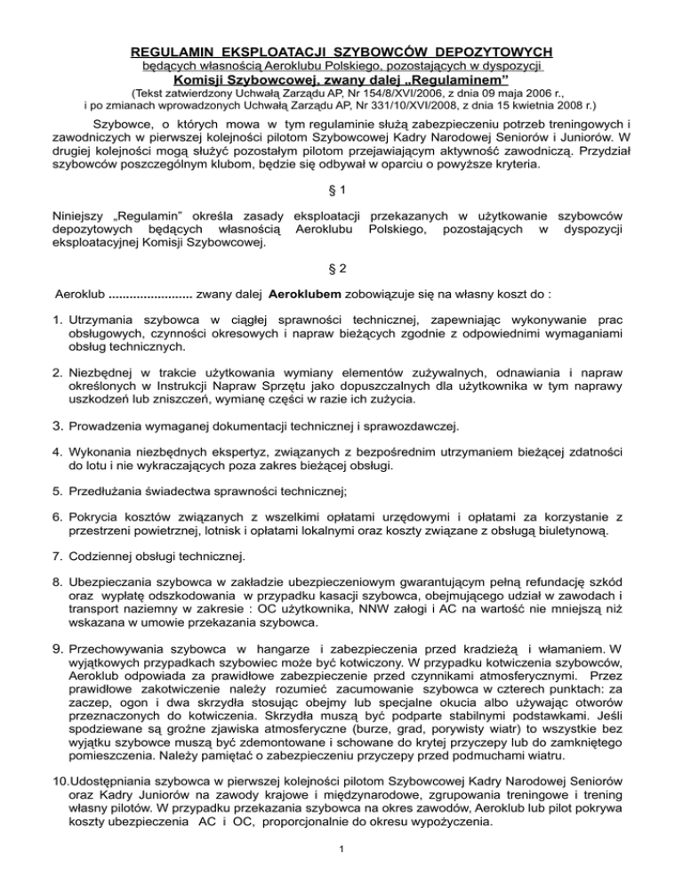 REGULAMIN EKSPLOATACJI SZYBOWCÓW DEPOZYTOWYCH będących własnością Aeroklubu Polskiego, pozostających w dyspozycji Komisji Szybowcowej, zwany dalej „Regulaminem” (Tekst zatwierdzony Uchwałą Zarządu AP, Nr 154/8/XVI/2006, z dnia 09 maja 2006 r., i po zmianach wprowadzonych Uchwałą Zarządu AP, Nr 331/10/XVI/2008, z dnia 15 kwietnia 2008 r.) Szybowce, o których mowa w tym regulaminie służą zabezpieczeniu potrzeb treningowych i zawodniczych w pierwszej kolejności pilotom Szybowcowej Kadry Narodowej Seniorów i Juniorów. W drugiej kolejności mogą służyć pozostałym pilotom przejawiającym aktywność zawodniczą. Przydział szybowców poszczególnym klubom, będzie się odbywał w oparciu o powyższe kryteria. §1 Niniejszy „Regulamin” określa zasady eksploatacji przekazanych w użytkowanie szybowców depozytowych będących własnością Aeroklubu Polskiego, pozostających w dyspozycji eksploatacyjnej Komisji Szybowcowej. §2 Aeroklub ........................ zwany dalej Aeroklubem zobowiązuje się na własny koszt do : 1. Utrzymania szybowca w ciągłej sprawności technicznej, zapewniając wykonywanie prac obsługowych, czynności okresowych i napraw bieżących zgodnie z odpowiednimi wymaganiami obsług technicznych. 2. Niezbędnej w trakcie użytkowania wymiany elementów zużywalnych, odnawiania i napraw określonych w Instrukcji Napraw Sprzętu jako dopuszczalnych dla użytkownika w tym naprawy uszkodzeń lub zniszczeń, wymianę części w razie ich zużycia. 3. Prowadzenia wymaganej dokumentacji technicznej i sprawozdawczej. 4. Wykonania niezbędnych ekspertyz, związanych z bezpośrednim utrzymaniem bieżącej zdatności do lotu i nie wykraczających poza zakres bieżącej obsługi. 5. Przedłużania świadectwa sprawności technicznej; 6. Pokrycia kosztów związanych z wszelkimi opłatami urzędowymi i opłatami za korzystanie z przestrzeni powietrznej, lotnisk i opłatami lokalnymi oraz koszty związane z obsługą biuletynową. 7. Codziennej obsługi technicznej. 8. Ubezpieczania szybowca w zakładzie ubezpieczeniowym gwarantującym pełną refundację szkód oraz wypłatę odszkodowania w przypadku kasacji szybowca, obejmującego udział w zawodach i transport naziemny w zakresie : OC użytkownika, NNW załogi i AC na wartość nie mniejszą niż wskazana w umowie przekazania szybowca. 9. Przechowywania szybowca w hangarze i zabezpieczenia przed kradzieżą i włamaniem. W wyjątkowych przypadkach szybowiec może być kotwiczony. W przypadku kotwiczenia szybowców, Aeroklub odpowiada za prawidłowe zabezpieczenie przed czynnikami atmosferycznymi. Przez prawidłowe zakotwiczenie należy rozumieć zacumowanie szybowca w czterech punktach: za zaczep, ogon i dwa skrzydła stosując obejmy lub specjalne okucia albo używając otworów przeznaczonych do kotwiczenia. Skrzydła muszą być podparte stabilnymi podstawkami. Jeśli spodziewane są groźne zjawiska atmosferyczne (burze, grad, porywisty wiatr) to wszystkie bez wyjątku szybowce muszą być zdemontowane i schowane do krytej przyczepy lub do zamkniętego pomieszczenia. Należy pamiętać o zabezpieczeniu przyczepy przed podmuchami wiatru. 10.Udostępniania szybowca w pierwszej kolejności pilotom Szybowcowej Kadry Narodowej Seniorów oraz Kadry Juniorów na zawody krajowe i międzynarodowe, zgrupowania treningowe i trening własny pilotów. W przypadku przekazania szybowca na okres zawodów, Aeroklub lub pilot pokrywa koszty ubezpieczenia AC i OC, proporcjonalnie do okresu wypożyczenia. 1 11.Zgłaszania do Sekretarza Komisji Szybowcowej faktu niesprawności (powyżej 7 dni), wraz z przyczyną, przesyłając również zgłoszenie o aktualnym stanie technicznym szybowca do specjalisty ds. zaplecza technicznego AP. 12.Informowania Nadzoru Lotniczego i posiadacza Świadectwa Typu oraz Aeroklubu Polskiego o zaistniałych usterkach i niesprawnościach mogących mieć wpływ na bezpieczeństwo eksploatacji innych statków powietrznych danego typu. §3 1. Aeroklub przed rozpoczęciem sezonu – nie później niż do 15 kwietnia przekaże na konto Aeroklubu Polskiego opłatę określoną w umowie użytkowania - 1.500 zł. netto, tytułem refundacji zużytego resursu. Pozyskane środki będą przeznaczane na odtworzeniu zdolności technicznej, wynikającej z normalnej eksploatacji przez wykonywanie przeglądów 1000 h i w ramach określonej przepisami żywotności. 2. Aeroklub Polski w ramach opłaty eksploatacyjnej finansuje koszty przeglądu 1000 godzinnego w ramach resursu technicznego do 3000 godzin (Jantar 2B), w odniesieniu do godzin wylatanych, w okresie od 01.01.2006 roku. Koszty związane z odtworzeniem resursu technicznego wylatanego do 31.12.2005 roku ponosi Aeroklub. §4 1. W przypadku uszkodzenia szybowca wykluczającego możliwość naprawy (szkoda całkowita z decyzją o kasacji), kradzieży, środki finansowe z ubezpieczenia Aero-Casco lub Cargo, które powinny wpłynąć na konto Aeroklubu Polskiego, jako właściciela, będą przeznaczane na zakup nowego szybowca lub przegląd między-resursowy odtwarzający zdolność techniczną posiadanych szybowców depozytowych. 2. W przypadku powstania konieczności uiszczenia udziału własnego wynikającego z ubezpieczenia Aero-Casco, kwotę pokryje Aeroklub, który spowodował szkodę. §5 1. W przypadku konieczności wykorzystania szybowca przez pilota z innego aeroklubu regionalnego, przekazanie szybowca następuje na podstawie decyzji trenera SKN. Wszelkie obowiązki wynikające z ustaleń w § 2 oraz koszty, proporcjonalnie do okresu użytkowania ponosi Aeroklub wypożyczający czasowo szybowiec. 2. Przekazanie szybowca musi być udokumentowane protokołem czasowego przekazania (zd- odb), z wyszczególnieniem stanu technicznego, aktualnych resursów i okresu wypożyczenia. Wraz z szybowcem Aeroklub musi przekazać niniejszy regulamin co musi być potwierdzone podpisem dyrektora na protokóle czasowego przekazania. 3. Szybowiec musi być e