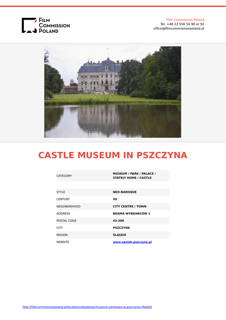 Film Commission Poland Tel. +48 22 556 54 90 or 92 office@filmcommissionpoland.pl CASTLE MUSEUM IN PSZCZYNA CATEGORY MUSEUM / PARK / PALACE / STATELY HOME / CASTLE STYLE NEO-BAROQUE CENTURY XII NEIGHBORHOOD CITY CENTRE / TOWN ADDRESS BRAMA WYBRAŃCÓW 1 POSTAL CODE 43-200 CITY PSZCZYNA REGION ŚLĄSKIE WEBSITE www.zamek-pszczyna.pl http://filmcommissionpoland.pl/locations/database/muzeum-zamkowe-w-pszczynie-f4wkkd Film Commission Poland Tel. +48 22 556 54 90 or 92 office@filmcommissionpoland.pl ABOUT LOCATION The museum in Pszczyna is located at the place of a former fortified castle built in the the 11th or 12th century. Between 1870 and 1876 the residence in Pszczyna was converted according to designs of the French architect Aleksander Hipolit Destailleur. Elevations of the two floor high castle on a quadrangle plan were changed according to the style of the 17th century French architecture. At the town side of the castle were built a vestibule with a three flight staircase, monumental dining room with a table to seat 32 people, two large 19thcentury mirrors with a surface of 14 m2 each and the Mirror Hall. Together with the historic landscape park in the English style (the area of 156 ha), it makes up a palace and park complex. In 1946 it was converted into a museum – today under the name of the Castle Museum in Pszczyna.There are permanent exhibitions in the Museum: 19th-20th century interiors, The Emperor’s Apartments, The Miniatures Room, armoury. http://filmcommissionpoland.pl/locations/database/muzeum-zamkowe-w-pszczynie-f4wkkd