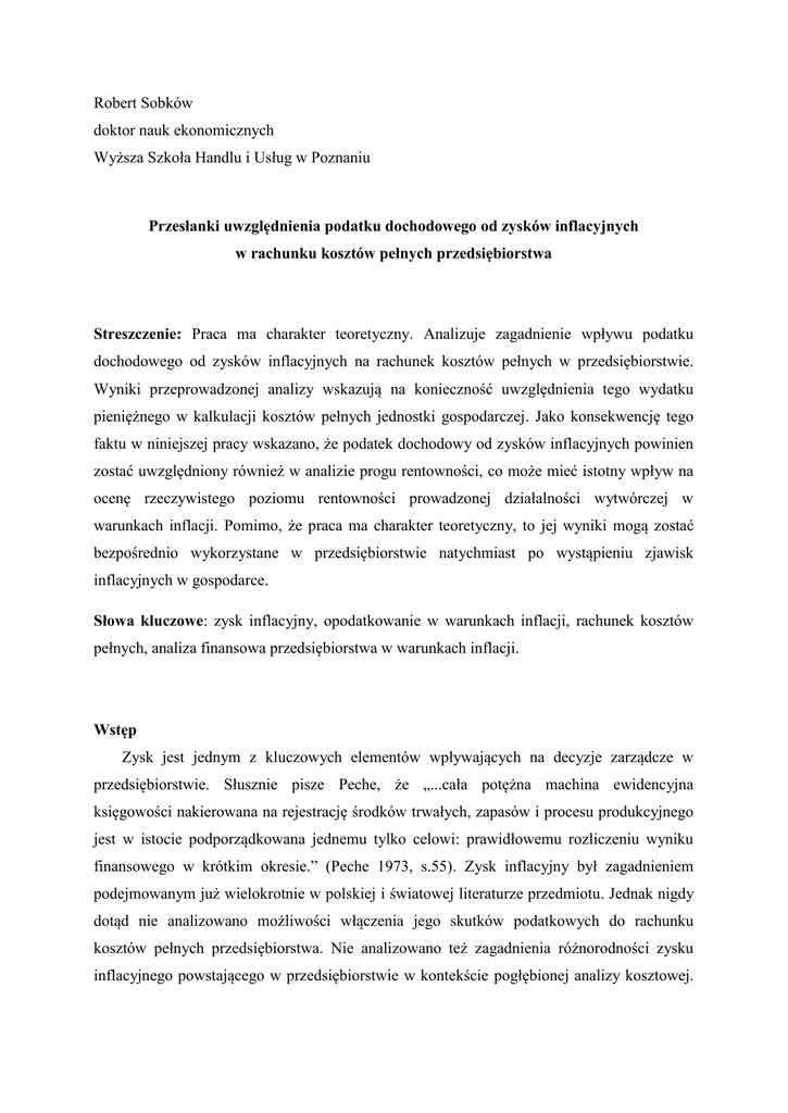 Robert Sobków doktor nauk ekonomicznych Wyższa Szkoła Handlu i Usług w Poznaniu Przesłanki uwzględnienia podatku dochodowego od zysków inflacyjnych w rachunku kosztów pełnych przedsiębiorstwa Streszczenie: Praca ma charakter teoretyczny. Analizuje zagadnienie wpływu podatku dochodowego od zysków inflacyjnych na rachunek kosztów pełnych w przedsiębiorstwie. Wyniki przeprowadzonej analizy wskazują na konieczność uwzględnienia tego wydatku pieniężnego w kalkulacji kosztów pełnych jednostki gospodarczej. Jako konsekwencję tego faktu w niniejszej pracy wskazano, że podatek dochodowy od zysków inflacyjnych powinien zostać uwzględniony również w analizie progu rentowności, co może mieć istotny wpływ na ocenę rzeczywistego poziomu rentowności prowadzonej działalności wytwórczej w warunkach inflacji. Pomimo, że praca ma charakter teoretyczny, to jej wyniki mogą zostać bezpośrednio wykorzystane w przedsiębiorstwie natychmiast po wystąpieniu zjawisk inflacyjnych w gospodarce. Słowa kluczowe: zysk inflacyjny, opodatkowanie w warunkach inflacji, rachunek kosztów pełnych, analiza finansowa przedsiębiorstwa w warunkach inflacji. Wstęp Zysk jest jednym z kluczowych elementów wpływających na decyzje zarządcze w przedsiębiorstwie. Słusznie pisze Peche, że „...cała potężna machina ewidencyjna księgowości nakierowana na rejestrację środków trwałych, zapasów i procesu produkcyjnego jest w istocie podporządkowana jednemu tylko celowi: prawidłowemu rozliczeniu wyniku finansowego w krótkim okresie.” (Peche 1973, s.55). Zysk inflacyjny był zagadnieniem podejmowanym już wielokrotnie w polskiej i światowej literaturze przedmiotu. Jednak nigdy dotąd nie analizowano możliwości włączenia jego skutków podatkowych do rachunku kosztów pełnych przedsiębiorstwa. Nie analizowano też zagadnienia różnorodności zysku inflacyjnego powstającego w przedsiębiorstwie w kontekście pogłębionej analizy kosztowej. Autorom dotychczas prezentującym swoje prace wydawało się to zbędne lub nawet niezasadne. Celem niniejszego artykułu jest analiza zasadności włączenia do kosztów pełnych przedsiębiorstwa wydatków związanych z podatkiem dochodowym od zysków inflacyjnych. Artykuł składa się z sześciu rozdziałów. W rozdziale pierwszym omówiono podstawy teoretyczne dotyczące pojęcia zysku inflacyjnego i sposobów jego powstawania w przedsiębiorstwie. W rozdziale drugim wskazano skutki podatkowe zysku inflacyjnego. W rozdziale trzecim wskazano relację pomiędzy poziomem zobowiązań a skalą powstającego zysku inflacyjnego. W rozdziale czwartym przedstawiono podobieństwa pomiędzy definicją kosztu a skutkami podatkowymi zysków inflacyjnych. W rozdziale szóstym dokonano klasyfikacji podatku dochodowego od zysków inflacyjnych w zależności od ich korelacji z poziomem przychodów przedsiębiorstwa. W podsumowaniu przedstawiono wyniki prac badawczych i wskazano możliwe kierunki dalszych badań nad analizowanym zagadnieniem. 1. Pojęcie zysku inflacyjnego i sposoby jego powstawania w przedsiębiorstwie Mimo, że inflacja jest trwałym zjawiskiem w gospodarce światowej, naukowcy nie mają wciąż wypracowanej jednej opinii na temat wielu efektów wywoływanych przez inflację. Jednym z takich zagadnień jest zysk inflacyjny. Przede wszystkim naukowcy nie są zgodni, co należy nazywać zyskiem inflacyjnym, gdzie są wszystkie źródła jego powstawania, nie ma ujednoliconego nazewnictwa dla podobnie postrzeganych procesów tworzenia zysku inflacyjnego, a także skutków zysku inflacyjnego dla analizy finansowej przedsiębiorstwa. Rozsądnym byłoby nazwać zyskiem inflacyjnym tę część zysku przedsiębiorstwa, która nie jest efektem rentownie prowadzonej działalności (operacyjnej, finansowej, a nawet wynikającej z incydentalnych zdarzeń), lecz której źródło tkwi wyłącznie w procesach inflacyjnych w gospodarce (NBP, 2016). Jednak niektórzy naukowcy ograniczyli się do nazwania tych zysków „zyskami pozornymi” lub „fikcyjnymi” (Jagiełło 1984, Szejna 1991, Hazlitt 1977) zatem określeniami, które można używać równie dobrze do pewnych zysków powstających w warunkach bezinflacyjnych. Inni naukowcy jednym pojęciem zyski inflacyjne nazywają wszystkie rodzaje różnorodnych zysków powstających w wyniku inflacji bez dalszej ich klasyfikacji. Jeszcze inni uważają, że zyski inflacyjne powstawać mogą wyłącznie z tzw. aktywów niepieniężnych (Alchian i Kessel 1959, Sojak 1996), podczas gdy inni wskazują również na tzw. aktywa pieniężne jako źródła tego zjawiska (Philips, 1990). Opisywanie czym jest zysk inflacyjny będzie zatem różnić się w zależności od autora prezentującego wyniki swoich prac badawczych. W niniejszym artykule wykorzystane zostaną nazewnictwo i klasyfikacja zysku inflacyjnego zawarte się w opracowaniu „Zysk inflacyjny a wartość poznawcza wyników analizy finansowej przedsiębiorstw” (Sobków 2008). Takie podejście autora artykułu wynika jedynie z przekonania, że w tej właśnie przywołanej pracy zagadnienie zysku inflacyjnego przeanalizowane zostało w sposób najbardziej dogłębny i wyczerpujący wobec dostępnej literatury przedmiotu. Wyróżnić możemy dwa rodzaje zysków inflacyjnych: pierwszy – krótkookresowy, sporadyczny, wynikający z braku wiedzy przedsiębiorców odnośnie zmian w poziomie przyszłej inflacji oraz drugi – długookresowy, trwale powstający w przedsiębiorstwie, bez względu na wiedzę bądź niewiedzę odnośnie poziomu obecnej, czy też przyszłej inflacji w gospodarce. Przykładem pierwszego rodzaju zysku inflacyjnego jest sytuacja, w której posiadając określone zobowiązanie, np. kredyt bankowy, ustalony poziom jego oprocentowania nie uwzględnia inflacji, a zatem nie uwzględnia spadku realnej wartości zobowiązania w warunkach inflacji, gdyż jego poziom i oprocentowanie określone zostały jeszcze w warunkac