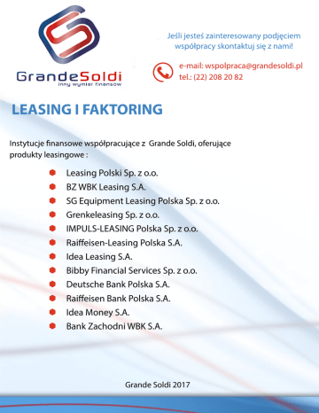 Leasing Polski Sp. z o.o. BZ WBK Leasing S.A. SG Equipment Leasing Polska Sp. z o.o. Grenkeleasing Sp. z o.o. IMPULS-LEASING Polska Sp. z o.o. Raiffeisen-Leasing Polska S.A. Idea Leasing S.A. Bibby Financial Services Sp. z o.o. Deutsche Bank Polska S.A. Raiffeisen Bank Polska S.A. Idea Money S.A. Bank Zachodni WBK S.A. Grande Soldi 2017