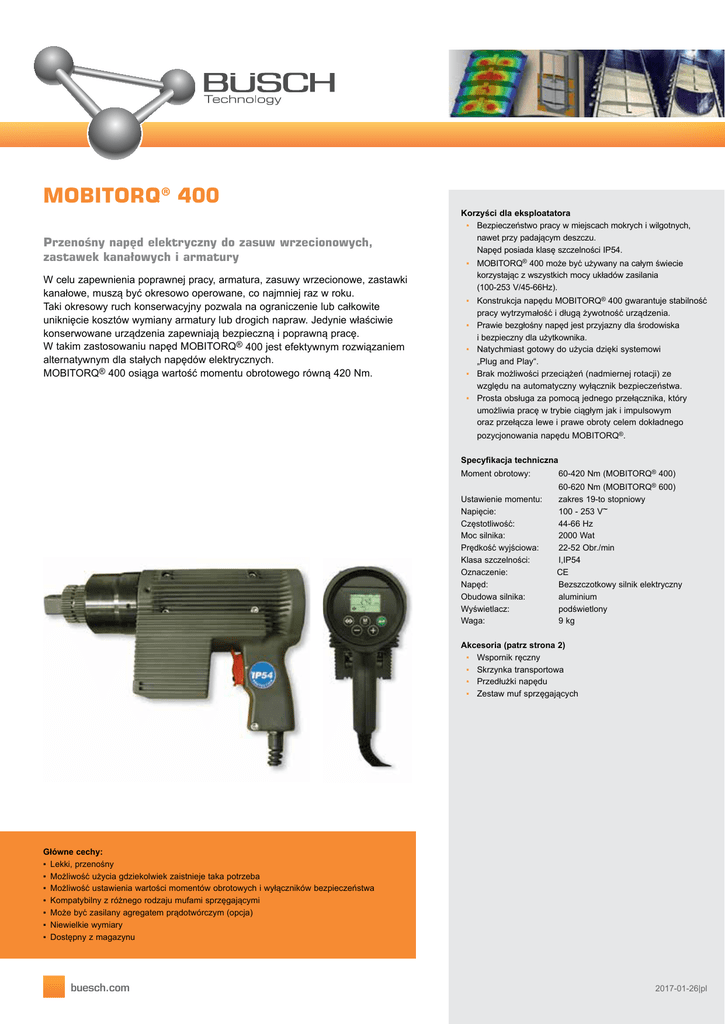 MOBITORQ® 400 Przenośny napęd elektryczny do zasuw wrzecionowych, zastawek kanałowych i armatury W celu zapewnienia poprawnej pracy, armatura, zasuwy wrzecionowe, zastawki kanałowe, muszą być okresowo operowane, co najmniej raz w roku. Taki okresowy ruch konserwacyjny pozwala na ograniczenie lub całkowite uniknięcie kosztów wymiany armatury lub drogich napraw. Jedynie właściwie konserwowane urządzenia zapewniają bezpieczną i poprawną pracę. W takim zastosowaniu napęd MOBITORQ® 400 jest efektywnym rozwiązaniem alternatywnym dla stałych napędów elektrycznych. MOBITORQ® 400 osiąga wartość momentu obrotowego równą 420 Nm. Korzyści dla eksploatatora ▪ Bezpieczeństwo pracy w miejscach mokrych i wilgotnych, nawet przy padającym deszczu. Napęd posiada klasę szczelności IP54. ▪ MOBITORQ® 400 może być używany na całym świecie korzystając z wszystkich mocy układów zasilania (100-253 V/45-66Hz). ▪ ▪ ▪ ▪ ▪ Konstrukcja napędu MOBITORQ® 400 gwarantuje stabilność pracy wytrzymałość i długą żywotność urządzenia. Prawie bezgłośny napęd jest przyjazny dla środowiska i bezpieczny dla użytkownika. Natychmiast gotowy do użycia dzięki systemowi „Plug and Play“. Brak możliwości przeciążeń (nadmiernej rotacji) ze względu na automatyczny wyłącznik bezpieczeństwa. Prosta obsługa za pomocą jednego przełącznika, który umożliwia pracę w trybie ciągłym jak i impulsowym oraz przełącza lewe i prawe obroty celem dokładnego pozycjonowania napędu MOBITORQ®. Specyfikacja techniczna Moment obrotowy: 60-420 Nm (MOBITORQ® 400) 60-620 Nm (MOBITORQ® 600) Ustawienie momentu: zakres 19-to stopniowy Napięcie: 100 - 253 V~ Częstotliwość: 44-66 Hz Moc silnika: 2000 Wat Prędkość wyjściowa: 22-52 Obr./min Klasa szczelności: I,IP54 Oznaczenie: CE Napęd: Bezszczotkowy silnik elektryczny Obudowa silnika: aluminium Wyświetlacz: podświetlony Waga: 9 kg Akcesoria (patrz strona 2) ▪ Wspornik ręczny ▪ Skrzynka transportowa ▪ Przedłużki napędu ▪ Zestaw muf sprzęgających Główne cechy: ▪ Lekki, przenośny ▪ Możliwość użycia gdziekolwiek zaistnieje taka potrzeba ▪ Możliwość ustawienia wartości momentów obrotowych i wyłączników bezpieczeństwa ▪ Kompatybilny z różnego rodzaju mufami sprzęgającymi ▪ Może być zasilany agregatem prądotwórczym (opcja) ▪ Niewielkie wymiary ▪ Dostępny z magazynu buesch.com 2017-01-26|pl MOBITORQ® 400 Przenośny napęd elektryczny do zasuw wrzecionowych, zastawek kanałowych i armatury Akcesoria Wspornik ręczny ▪ Wyposażenie standardowe ▪ Wysuwany uchwyt wspornika w zakresie 60 - 120 mm ▪ Wyposażony w zębaty otwór dla bezpiecznego montażu Skrzynia transportowa ▪ Wyposażenie standardowe ▪ Praktyczne, wytrzymałe i odporne na zniszczenie- kolor czarny ▪ Zawartość : napęd MOBITORQ® 400 wspornik ręczny Przedłużki napędu ▪ ▪ ▪ ▪ ▪ ▪ ▪ ▪ ▪ Teleskopowe lub sztywne, ze sprzęgłem zabezpieczającym w pozycjach krańcowych armatury Długość 200-3250 mm Wszystkie przedłużenia są wykonane ze stali nierdzewnej Dla armatury w zabudowie podziemnej oraz dla instalacji w komorze Dostępne również z przegubami Standardowa mufa 27 mm Dla wszystkich typów armatury Z redukcją zużycia i zabezpieczeniem przed nadmiernymi wartościami momentu obrotowego Inne długości dostępne na zapytanie Zestaw muf sprzęgających Zestaw nie jest objęty zakresem dostawy. Dostępny na indywidualne zamówienie ▪ Dla trzpieni kwadratowych: 12, 14, 17, 24, 27 mm ▪ Dla trzpieni okrągłych 16, 20, 30 mm ▪ Praktyczna obudowa w kolorze szarym ▪ Inne wymiary muf sprzęgających dostępne na indywidualne zamówienia BUESCH Technologie Polska Sp. z o.o. ul. Cieplarniana 44 piętro 1 05-077 Warszawa-Wesoła Polska E-Mail [email protected] Tel +48 661 241 928 buesch.com 2017-01-26|pl