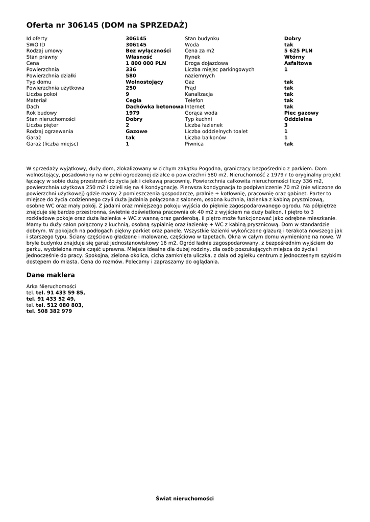Oferta nr 306145 (DOM na SPRZEDAŻ) Id oferty SWO ID Rodzaj umowy Stan prawny Cena Powierzchnia Powierzchnia działki Typ domu Powierzchnia użytkowa Liczba pokoi Materiał Dach Rok budowy Stan nieruchomości Liczba pięter Rodzaj ogrzewania Garaż Garaż (liczba miejsc) 306145 Stan budynku 306145 Woda Bez wyłączności Cena za m2 Własność Rynek 1 800 000 PLN Droga dojazdowa 336 Liczba miejsc parkingowych 580 naziemnych Wolnostojący Gaz 250 Prąd 9 Kanalizacja Cegła Telefon Dachówka betonowa Internet 1979 Gorąca woda Dobry Typ kuchni 2 Liczba łazienek Gazowe Liczba oddzielnych toalet tak Liczba balkonów 1 Piwnica Dobry tak 5 625 PLN Wtórny Asfaltowa 1 tak tak tak tak tak Piec gazowy Oddzielna 3 1 1 tak W sprzedaży wyjątkowy, duży dom, zlokalizowany w cichym zakątku Pogodna, graniczący bezpośrednio z parkiem. Dom wolnostojący, posadowiony na w pełni ogrodzonej działce o powierzchni 580 m2. Nieruchomość z 1979 r to oryginalny projekt łączący w sobie dużą przestrzeń do życia jak i ciekawą pracownię. Powierzchnia całkowita nieruchomości liczy 336 m2, powierzchnia użytkowa 250 m2 i dzieli się na 4 kondygnację. Pierwsza kondygnacja to podpiwniczenie 70 m2 (nie wliczone do powierzchni użytkowej) gdzie mamy 2 pomieszczenia gospodarcze, pralnie + kotłownię, pracownię oraz gabinet. Parter to miejsce do życia codziennego czyli duża jadalnia połączona z salonem, osobna kuchnia, łazienka z kabiną prysznicową, osobne WC oraz mały pokój. Z jadalni oraz mniejszego pokoju wyjścia do pięknie zagospodarowanego ogrodu. Na półpiętrze znajduje się bardzo przestronna, świetnie doświetlona pracownia ok 40 m2 z wyjściem na duży balkon. I piętro to 3 rozkładowe pokoje oraz duża łazienka + WC z wanną oraz garderobą. II piętro może funkcjonować jako odrębne mieszkanie. Mamy tu duży salon połączony z kuchnią, osobną sypialnię oraz łazienkę + WC z kabiną prysznicową. Dom w standardzie dobrym. W pokojach na podłogach piękny parkiet oraz panele. Wszystkie łazienki wykończone glazurą i terakota nowszego jak i starszego typu. Ściany częściowo gładzone i malowane, częściowo w tapetach. Okna w całym domu wymienione na nowe. W bryle budynku znajduje się garaż jednostanowiskowy 16 m2. Ogród ładnie zagospodarowany, z bezpośrednim wyjściem do parku, wydzielona mała część uprawna. Miejsce idealne dla dużej rodziny, dla osób poszukujących miejsca do życia i jednocześnie do pracy. Spokojna, zielona okolica, cicha zamknięta uliczka, z dala od zgiełku centrum z jednoczesnym szybkim dostępem do miasta. Cena do rozmów. Polecamy i zapraszamy do oglądania. Dane maklera Arka Nieruchomości tel. tel. 91 433 59 85, tel. 91 433 52 49, tel. tel. 512 080 803, tel. 508 382 979 Świat nieruchomości Powered by TCPDF (www.tcpdf.org)