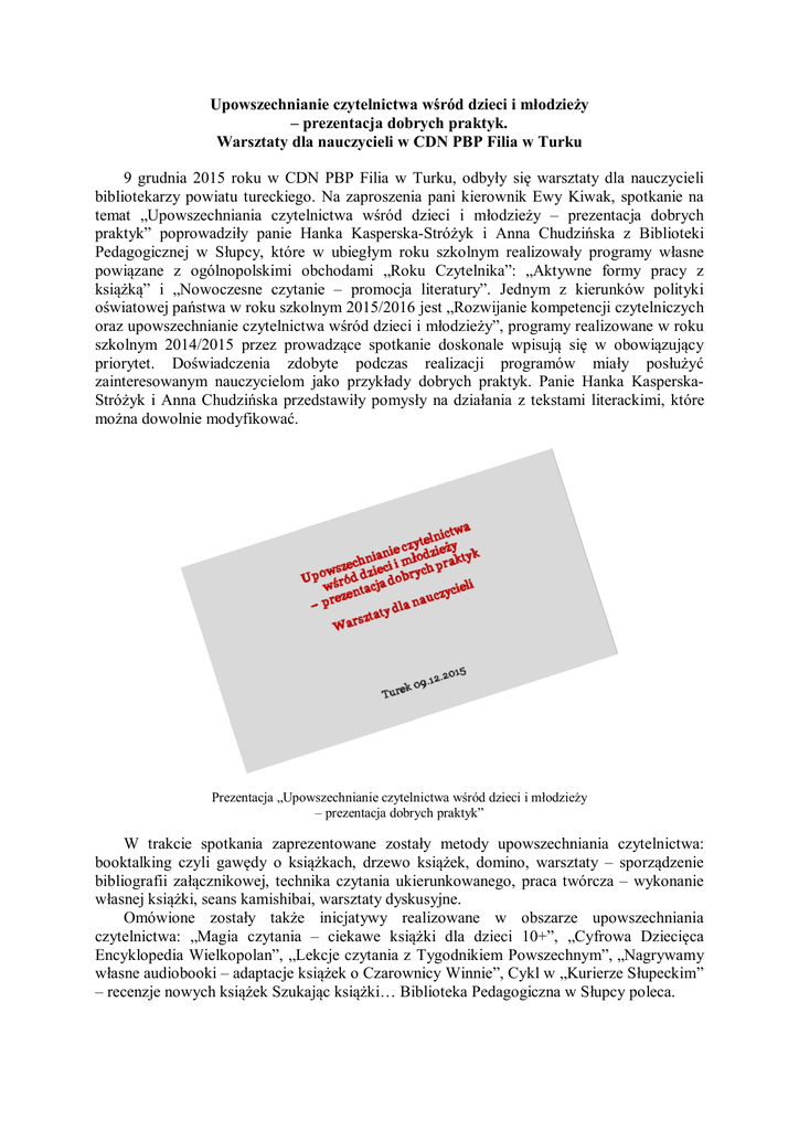 Upowszechnianie czytelnictwa wśród dzieci i młodzieży – prezentacja dobrych praktyk. Warsztaty dla nauczycieli w CDN PBP Filia w Turku 9 grudnia 2015 roku w CDN PBP Filia w Turku, odbyły się warsztaty dla nauczycieli bibliotekarzy powiatu tureckiego. Na zaproszenia pani kierownik Ewy Kiwak, spotkanie na temat „Upowszechniania czytelnictwa wśród dzieci i młodzieży – prezentacja dobrych praktyk” poprowadziły panie Hanka Kasperska-Stróżyk i Anna Chudzińska z Biblioteki Pedagogicznej w Słupcy, które w ubiegłym roku szkolnym realizowały programy własne powiązane z ogólnopolskimi obchodami „Roku Czytelnika”: „Aktywne formy pracy z książką” i „Nowoczesne czytanie – promocja literatury”. Jednym z kierunków polityki oświatowej państwa w roku szkolnym 2015/2016 jest „Rozwijanie kompetencji czytelniczych oraz upowszechnianie czytelnictwa wśród dzieci i młodzieży”, programy realizowane w roku szkolnym 2014/2015 przez prowadzące spotkanie doskonale wpisują się w obowiązujący priorytet. Doświadczenia zdobyte podczas realizacji programów miały posłużyć zainteresowanym nauczycielom jako przykłady dobrych praktyk. Panie Hanka KasperskaStróżyk i Anna Chudzińska przedstawiły pomysły na działania z tekstami literackimi, które można dowolnie modyfikować. Prezentacja „Upowszechnianie czytelnictwa wśród dzieci i młodzieży – prezentacja dobrych praktyk” W trakcie spotkania zaprezentowane zostały metody upowszechniania czytelnictwa: booktalking czyli gawędy o książkach, drzewo książek, domino, warsztaty – sporządzenie bibliografii załącznikowej, technika czytania ukierunkowanego, praca twórcza – wykonanie własnej książki, seans kamishibai, warsztaty dyskusyjne. Omówione zostały także inicjatywy realizowane w obszarze upowszechniania czytelnictwa: „Magia czytania – ciekawe książki dla dzieci 10+”, „Cyfrowa Dziecięca Encyklopedia Wielkopolan”, „Lekcje czytania z Tygodnikiem Powszechnym”, „Nagrywamy własne audiobooki – adaptacje książek o Czarownicy Winnie”, Cykl w „Kurierze Słupeckim” – recenzje nowych książek Szukając książki… Biblioteka Pedagogiczna w Słupcy poleca. Szczegółowo zaprezentowana została innowacyjna forma zajęć prowadzonych przez pracowników Biblioteki Pedagogicznej w Słupcy, we współpracy z panią psycholog Marią Jaśniewką-Krawczyk z Poradni Psychologiczno-Pedagogicznej w Słupcy, zajęcia z psychoedukacji z wykorzystaniem literatury biblioterapeutycznej. Prowadzące podkreślały, że główną zaletą przedstawionych metod jest ich różnorodność. Warsztaty stały się doskonałą okazją do zaprezentowania w jaki sposób samemu można przygotować, ciekawe materiały edukacyjne. Eksperymentowanie, tworzenie nowych koncepcji, twórcze działania, innowacje – to wszystko powoduje, że uczniowie chętnie wykonują polecenia, są aktywni. Stosując ciekawe metody zachęcamy dzieci i młodzież do sięgania po książkę. Uczestnicy spotkania. Fot. Ewa Kiwak Prowadzące podkreślały, że główną zaletą przedstawionych metod jest ich różnorodność. Warsztaty stały się doskonałą okazją do zaprezentowania w jaki sposób samemu można przygotować, ciekawe materiały edukacyjne. Eksperymentowanie, tworzenie nowych koncepcji, twórcze działania, innowacje – to wszystko powoduje, że uczniowie chętnie wykonują polecenia, są aktywni. Stosując ciekawe metody zachęcamy dzieci i młodzież do sięgania po książkę. Oprac. Anna Chudzińska