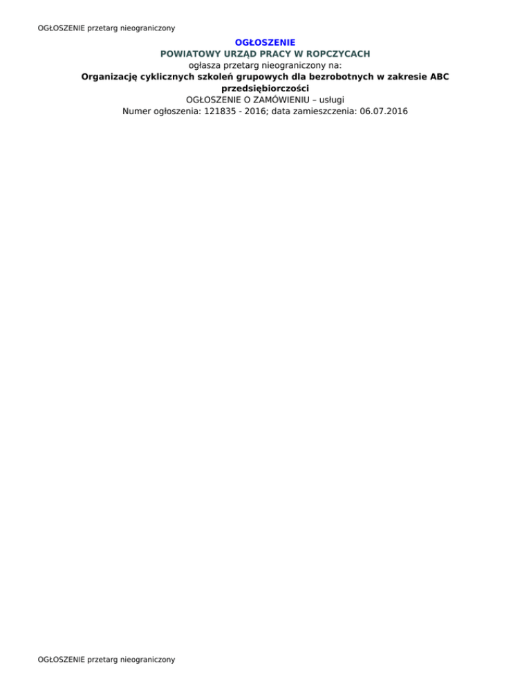 OGŁOSZENIE przetarg nieograniczony OGŁOSZENIE POWIATOWY URZĄD PRACY W ROPCZYCACH ogłasza przetarg nieograniczony na: Organizację cyklicznych szkoleń grupowych dla bezrobotnych w zakresie ABC przedsiębiorczości OGŁOSZENIE O ZAMÓWIENIU – usługi Numer ogłoszenia: 121835 - 2016; data zamieszczenia: 06.07.2016 OGŁOSZENIE przetarg nieograniczony