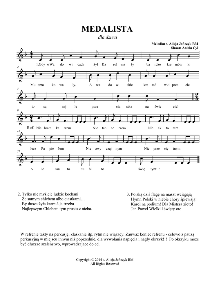 MEDALISTA dla dzieci & b 44 j œ œ j œ œ 1.Gdy wWa j œ b œ & 4 Mu sma j &b œ 7 to do ko œ wi j œ œ cach œ j œ są naj ły. A œ Ref. Nie bram ka j œ œ & b œ. œ 27 lecz Pa pie rzem żem œ œ œ A le san to œ œ J do Nie tan ce œ œ J su bi 2. Tylko nie myślcie ludzie kochani Że samym chlebem albo ciastkami… By dusza żyła karmić ją trzeba Najlepszym Chlebem tym prosto z nieba. zwy czaj œ J œ kre na j œ œ kre mów wki prze cie œ œ świe cie! ak œ J Nie świę prze œ. tym!!! ki œ œ . œj œj œ . Nie œ j œ œ to rem œ . œj œ œ œœœ to mó œ J œœœ j œ œ œ œ rdzo j œ œ stka rzem nym ba œ ckie œ . œj œ œ Nie ły wi cia j œ œ œ ma œ . œj œj œ . œœœ œœœ &b œ rol psze 9 18 wa j œ œ œ le j j 2 . b œ & 4 œ œ œ. Ka żył œ œ J œ wa j œ œ Melodia: s. Alicja Jończyk RM Słowa: Aniela Cyl cię tnym 2 4 œœœ œœœ œ œ œ 3. Polską dziś flagę na maszt wciągają Hymn Polski w niebie chóry śpiewają! Karol na podium! Dla Mistrza złoto! Jan Paweł Wielki i święty oto. W refrenie takty na perkusję, klaskanie itp. rytm nie wiążący. Zauważ koniec refrenu - celowo z pauzą perkusyjną w miejscu innym niż poprzednie, dla wywołania napięcia i nagły okrzyk!!! Po okrzyku może być dłuższe szaleństwo, wprowadzające do cd. Copyright © 2014 s. Alicja Jończyk RM All Rights Reserved MEDALISTA dla dzieci ## 4 & 4 ## j & œ œ 4 j œ œ j j œ œ œ œ œ 1.Gdy wWa do wi cach j œ œ Mu sma ko # & # œj œ to j œ œ œ wa ły. A j œ œ 7 są naj ## 2 & 4 œ . œj œj œ . Ref. & 27 & ## ## Nie bram ka j œ œ œ. œ lecz Pa œ œ A le pie żem œ san rzem le do psze wi tan ce œ j œ œ to su bi 2. Tylko nie myślcie ludzie kochani Że samym chlebem albo ciastkami… By dusza żyła karmić ją trzeba Najlepszym Chlebem tym prosto z nieba. zwy czaj kre j œ stka rzem œ . œj œ œ Nie j œ œ j œ œ cia Nie j j œ œ œba rdzo œ kreœ mów ki ckie œ . œj œj œ . œœœ œœœ wa j œ œ œ rol ma ły j œ œ œ œ 9 18 Ka żył Melodia: s. Alicja Jończyk RM Słowa: Aniela Cyl nym j œ œ œ œ to cie œ œœœ œ . œj œ œ œœœ ak prze œ. tym!!! 2 4 cie! œ . œj œj œ . Nie świę wki prze świe Nie j œ œ œ na œœœ œœœ mó j œ œ to cię rem tnym œ œ œ 3. Polską dziś flagę na maszt wciągają Hymn Polski w niebie chóry śpiewają! Karol na podium! Dla Mistrza złoto! Jan Paweł Wielki i święty oto. W refrenie takty na perkusję, klaskanie itp. rytm nie wiążący. Zauważ koniec refrenu - celowo z pauzą perkusyjną w miejscu innym niż poprzednie, dla wywołania napięcia i nagły okrzyk!!! Po okrzyku może być dłuższe szaleństwo, wprowadzające do cd. Copyright © 2014 s. Alicja Jończyk RM All Rights Reserved