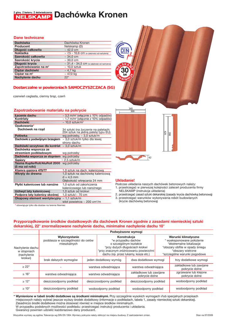 Dachówka Kronen Dane techniczne w lat aranc ja Dachówka Kronen Nelskamp (D) ~ 42,0 cm ~ 7,5 - 10,6 cm (w zależności od nachylenia) ~ 34,0 cm ~ 30,0 cm ~ 31,4 - 34,5 cm (w zależności od nachylenia) ~ 10,0 sztuk ~ 4,7 kg ~ 47,0 kg 22° G Dachówka Producent Długość całkowita Nakładka Szerokość całkowita Szerokość krycia Długość krycia Zapotrzebowanie na m2 Ciężar dachówki Ciężar na m2 Nachylenie dachu Dostarczalne w powierzniach SAMOCZYSZCZACA (SG) czerwień ceglasta, ciemny brąz, czerń 340 300 Zapotrzebowanie materiału na pokrycie ~ 3,3 m/m2 (włącznie z 10% odpadów) ~ 1,7 m/m2 (włącznie z 10% odpadów) ~ 10,0 sztuk/m2 398 34 sztuki (na życzenie na paletach: 204 sztuk na jedną paletę typu EU) Połówka wg potrzeby, ~ 3,0 sztuk/m Dachówki z podwójnym brzegiem ~ 3,0 sztuk/m tylko dla lewej strony dachu Dachówki szczytowe dla kontrlat ~ 3,0 sztuk/m Dachówka wsporcza ze strzemiem podkładowym wg potrzeby Dachówka wsporcza ze stopniem wg potrzeby ~ 2,5 sztuk/m Gąsiory Tasma KupferRoll/AluRoll 2000 wg potrzeby (5 ma od rolki) Klamra gąsiora 470/77 1,0 sztuk na dach. kalenicową Wkręty do drewna 1,0 sztuk na dachówkę kalenicową d = 4,5 mm Głębokość wkręcania 24 mm Płytki kalenicowe lub narożne 1,0 sztuk od zakończenia kalenicowego lub narożnego Uchwyt laty kalenicowej 1,0 sztuk od krokwi Podpora laty kalenicy skośnej 1,0 sztuk/~ 70 cm Okapowy element wentylacyjny ~ 1,1 sztuk/m wlot powietrza ~ 200 cm2/m 420 Łacenie dachu Kontrlaty Dachówki Opakowania* Dachówek na rząd 62 Układanie! Podczas układania naszych dachówek betonowych należy: 1. przestrzegać w pierwszej kolejności zaleceń producenta firmy NELSKAMP (instrukcja układania) 2. przestrzegać zasad sztuki dekarskiej (zasady krycia dachówką betonową) 3. przestrzegać warunków wykonywania robót budowlanych (krycie dachówką betonową) * obowiązuje tylko dla dostaw na terenie Niemiec Przyporządkowanie środków dodatkowych dla dachówek Kronen zgodnie z zasadami niemieckiej sztuki dekarskiej, 22° znormalizowane nachylenie dachu, minimalne nachylenie dachu 10° Podwyższone wymogi Wykorzystanie poddasza w szczególności do celów mieszkalnych Nachylenie dachu w stopniach (nachylenie krokwi) Konstrukcja *w przypadku dachów o szczególnym kształcie *przy dużych długościach krokwi *przy znacznym zróżnicowaniu powierzchni dachu (np. przez lukarny, kosze etc.) Warunki klimatyczne * wyeksponowane położenie *ekstremalne lokalizacje *obszary obfite w opady śniegu *obszary wietrzne *szczególne warunki pogodowe brak dalszych wymogów jeden dodatkowy wymóg dwa dodatkowe wymogi trzy dodatkowe wymogi ≥ 22° - warstwa odwadniająca warstwa odwadniająca ≥ 16° warstwa odwadniająca warstwa odwadniająca zakładkowe lub zawijane pokrycie dolne zakładkowe lub zawijane pokrycie dolne zgrzewane lub klejone pokrycie dolne ≥ 12° deszczoodporny podkład deszczoodporny podkład deszczoodporny podkład wodoodporny podkład ≥ 10° deszczoodporny podkład wodoodporny podkład wodoodporny podkład wodoodporny podkład * Wymienione w tabeli środki dodatkowe są środkami minimalnymi. Przy szczególnie wysokich wymogach i/lub specjalnych przepisach miejscowych należy wybrać jeszcze wyższy środek dodatkowy (informacje o podkładach, tabela 1, zasady niemieckiej sztuki dekarskiej). Zasadniczo środki dodatkowe można stosować również w miejsce środków minimalnych. W przypadku podobnych możliwości podkładu: przestrzegać instrukcji producenta i układania. Gwarancji powinien udzielić każdorazowo dany producent. Wszystkie wymiary są ogólne. Tolerancja wg DIN EN 1304. Wymiary pokrycia należy obliczyć na miejscu budowy. Z zastrzeżeniem zmian. Stan na 07/2009 Dachówka Kronen Łacenie powierzchni dachu z użyciem taśmy kalenicowej (kalenica układana na sucho) Łaty nośne: Należy stosować następujące przekroje minimalne: (zalecenia dla pokryć dachowych, wskazówki dla drewna i materiałów drewnianych) Przekrój nominalny łat nośnych 30 x 50 mm 40 x 60 mm Odległość krokwi Klasa asortymentu (wymiar osiowy) ≤ 80 cm S 10 Łata okapowa ≤ 100 cm S 10 końca krokwi Kontrłaty: Zalecane grubości kontrłat zgodnie z zaleceniami dla pokryć dachowych (wskazówki dla drewna i materiałów drewnianych): Długość krokwi do 8m do 12 m powyżej 12 m Zalecana grubość 24 mm 30 mm 40 mm ~ 40 cm do 1,4 ~ 3 ,5 cmrycia* 4 3 ść k o ług i 1,4 m a* D rokw 3 k ~ ,5 c ryci ć 34 ść k ugoś dł go Dłu *Długość krycia w zależności od nachylenia dachu powyżej 30° 31,4 - 34,5 cm długości krycia 22 - 30° 31,4 - 33,5 cm długości krycia poniżej 22° 31,4 - 32,0 cm długości krycia X Odległość najwyższej łaty nośnej do wierzchołka kalenicy (patrz tabela) ND ≤ 30° > 30° - ≤ 45° > 45° X ~ 40 mm ~ 35 mm ~ 30 mm Dane wymiarowe służą planowaniu i należy je sprawdzić przed ułożeniem. Kształtowanie okapu - szczegóły Dane wymiarowe służą planowaniu i należy je sprawdzić przed ułożeniem w zależności od konstrukcji i warunków miejscowych. 1 Z rynną i elementem wentylacyjnym a pow oka a t Ła 2 Rynna wysokopodwieszana (zalecana do dachów płaskich < 22°) wi rok ak ońc k o md 0c ~4 Występ dachówki w rynnę maks. 1/3 szerokości rynny do 32 cm wa ~ kapo o ta Ła kwi a kro końc Element wentylacyjny Blacha okapowa Wlot powietrza Ściekacz Kalenica/naroże Klamra gąsiora nr 470/77 Wysokość łaty kalenicowej/ narożnej ustalić w miejscu montażu. Przekrój nominalny min. 24 x 48 mm Dachówka szczytowa 0,6 kN/m Każdy gąsior: Wkręt do drewna, d = 4,5 mm Głębokość wkręcania: 24 mm 0,6 kN/m Dotyczy również dachówek z podwójnym brzegiem! Taśma KupferRoll/AluRoll 2000: Zalecana szerokość taśmy: 290 mm - wąskie pokrycie dolne 330 mm - szerokie pokrycie dolne Każda dachówka krawędziowa: Wkręt do drewna, d = 4,5 mm Głębokość wkręcania: 24 mm Mocowanie śrubami dachówki krawędziowej szczególnie przy płaskich
