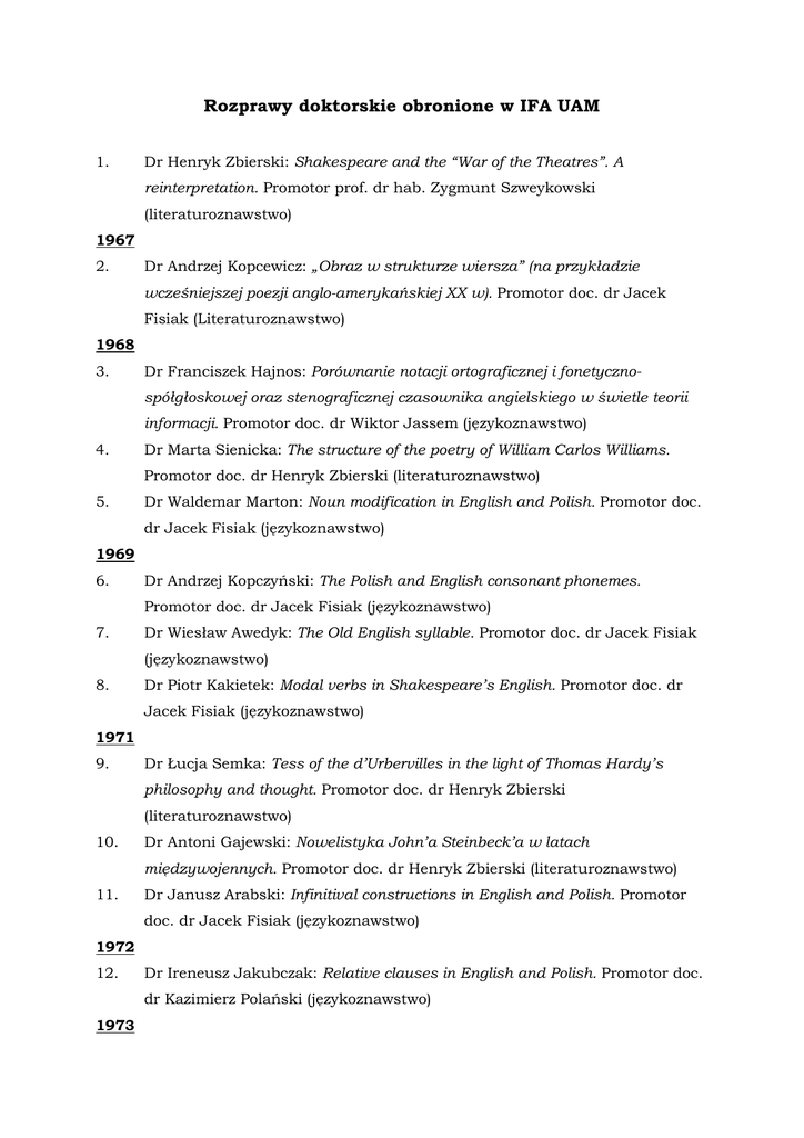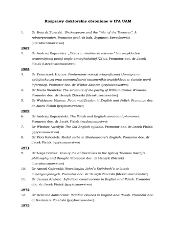Rozprawy doktorskie obronione w IFA UAM 1. Dr Henryk Zbierski: Shakespeare and the “War of the Theatres”. A reinterpretation. Promotor prof. dr hab. Zygmunt Szweykowski (literaturoznawstwo) 1967 2. Dr Andrzej Kopcewicz: „Obraz w strukturze wiersza” (na przykładzie wcześniejszej poezji anglo-amerykańskiej XX w). Promotor doc. dr Jacek Fisiak (Literaturoznawstwo) 1968 3. Dr Franciszek Hajnos: Porównanie notacji ortograficznej i fonetycznospółgłoskowej oraz stenograficznej czasownika angielskiego w świetle teorii informacji. Promotor doc. dr Wiktor Jassem (językoznawstwo) 4. Dr Marta Sienicka: The structure of the poetry of William Carlos Williams. Promotor doc. dr Henryk Zbierski (literaturoznawstwo) 5. Dr Waldemar Marton: Noun modification in English and Polish. Promotor doc. dr Jacek Fisiak (językoznawstwo) 1969 6. Dr Andrzej Kopczyński: The Polish and English consonant phonemes. Promotor doc. dr Jacek Fisiak (językoznawstwo) 7. Dr Wiesław Awedyk: The Old English syllable. Promotor doc. dr Jacek Fisiak (językoznawstwo) 8. Dr Piotr Kakietek: Modal verbs in Shakespeare’s English. Promotor doc. dr Jacek Fisiak (językoznawstwo) 1971 9. Dr Łucja Semka: Tess of the d’Urbervilles in the light of Thomas Hardy’s philosophy and thought. Promotor doc. dr Henryk Zbierski (literaturoznawstwo) 10. Dr Antoni Gajewski: Nowelistyka John’a Steinbeck’a w latach międzywojennych. Promotor doc. dr Henryk Zbierski (literaturoznawstwo) 11. Dr Janusz Arabski: Infinitival constructions in English and Polish. Promotor doc. dr Jacek Fisiak (językoznawstwo) 1972 12. Dr Ireneusz Jakubczak: Relative clauses in English and Polish. Promotor doc. dr Kazimierz Polański (językoznawstwo) 1973 13. Dr Maria Grala: Active participles in Polish and English: a contrastive study. Promotor doc. dr Kazimierz Polański (językoznawstwo) 14. Dr Lucjan Benisz: Wpływ filmu dydaktycznego na kształtowanie się nawyków mowy (obraz fonologiczny języka) u studentów. Promotor prof. dr hab. Jacek Fisiak (językoznawstwo) 15. Dr Tadeusz Zabrocki: Attitudinal sentence adverbs in English and their equivalents in Polish. Promotor prof. dr hab. Jacek Fisiak (językoznawstwo) 1974 16. Dr Mirosław Nowakowski: Old English nominalizations. Promotor prof. dr hab. Jacek Fisiak (językoznawstwo) 17. Dr Stefan Makowiecki: Malcolm Lowry and the lyrical convention of fiction. Promotor doc. dr Henryk Zbierski (literaturoznawstwo) 18. Dr Bogdan Krakowian: An attempt to analyze the efficiency of communication in teaching faster reading in English. Promotor prof. dr hab. Jacek Fisiak (językoznawstwo) 19. Dr Roman Kalisz: The syntax of the clauses of result in English and Polish. Promotor prof. dr hab. Kazimierz Polański (językoznawstwo) 20. Dr Krystyna Kapitułka: Structural principles of Gerald Manley Hopkins’ poetry. Promotor prof. dr hab. Henryk Zbierski (literaturoznawstwo) 21. Dr Jerzy Wełna: Linguistic analysis of borrowings in Old English. Promotor prof. dr hab. Jacek Fisiak (językoznawstwo) 22. Dr Jadwiga Fisiak: The –er derived nominal in English. Promotor prof. dr hab. Ludwik Zabrocki (językoznawstwo) 23. Dr Sharwood Smith, M. : Aspects of future reference in a pedagogical grammar of English. Promotor prof. dr hab. Jacek Fisiak (językoznawstwo) 24. Dr Alicja Wegner: Infinitive structures in Festial by John Mirk. Promotor prof. dr hab. Jacek Fisiak (językoznawstwo) 25. Dr Maria Lipińska-Grzegorek: Some problems of contrastive analysis: sentences with verbs and nouns of sensual perception in English and Polish Promotor prof. dr hab. Jacek Fisiak (językoznawstwo) 26. Dr Jerzy Staszewski: Ways of expressing purpose in English and Polish. Promotor prof. dr hab. Kazimierz Polański (językoznawstwo) 27. Dr Andrzej Kaznowski: The development of phrasal verbs in English. Promotor prof. dr hab. Jacek Fisiak (językoznawstwo) 1975 28. Dr Anna Kaznowska: Ben Johnson’s grammar in theory and practice. Promotor prof. dr hab. Jacek Fisiak (językoznawstwo) 29. Dr Maria Nowakowska: Language of poetry and generative grammar – toward generative poetics. Promotor prof. dr hab. Jacek Fisiak (językoznawstwo) 1976 30. Dr Daniela Zacharzewska: Kształtowanie się wizji artystycznej we współczesnych powieściach D. H. Lawrence’a. Promotor prof. dr hab. Henryk Zbierski (literaturoznawstwo) 31. Dr Bernard Buchwald: Polish translation equivalents of English determiners. Promotor prof. dr hab. Jacek Fisiak (językoznawstwo) 1977 32. Dr Ewa Siarkiewicz-Bivand: The efficiency of language laboratory use in university departments of English in Poland. Promotor prof. dr hab. Waldemar Marton (językoznawstwo) 33. Dr Karol Janicki: Toward contrasting communicative competence: an analysis of style. Promotor prof. dr hab. Waldemar Marton (językoznawstwo) 34. Dr Wiesław Oleksy: Interrogative constructions in English and Polish. Promotor prof. dr hab. Kazimierz Polański (językoznawstwo) 35. Dr Wiesława Wysiecka: Ways of expressing condition in English and Polish. Promotor prof. dr hab. Kazimierz Polański (językoznawstwo) 36. Dr Magdalena Jakólczyk-Rakowska: Ways of expressing accessory circumstances in Polish and English. Promotor prof. dr hab. Kazimierz Polański (językoznawstwo) 1978 37. Dr Teresa Bałazy: Structural patterns in Flannery O'Connor's fiction Promotor prof. dr hab. Andrzej Kopcewicz (literaturoznawstwo) 38. Dr Grzegorz Dogil: Some aspects of emphasis in English and Polish phonology. Promotor prof. dr hab. Jacek Fisiak (językoznawstwo) 39. Dr Andrzej Ceynowa: Thornton Wilder’s dramatic art. Promotor prof. dr hab. Henryk Zbierski (literaturoznawstwo) 40. Dr Konrad Majchrzak: The structure of the noun phrase in English and Polish: a contrastive study. Promotor prof. dr hab. Kazimierz Polański (językoznawstwo) 41. Dr Aleksandra Mieszek-Horn: Cleft and pseudo-cleft constructions in English and Polish. Promotor prof. dr hab. Jacek Fisiak (językoznawstwo) 1979 42. Dr Teresa Retelewska: The grammar of