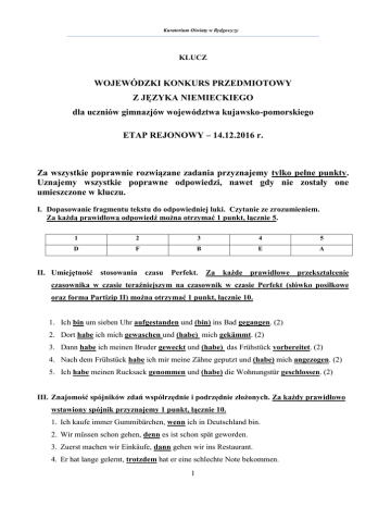 Kuratorium Oświaty w Bydgoszczy KLUCZ WOJEWÓDZKI KONKURS PRZEDMIOTOWY Z JĘZYKA NIEMIECKIEGO dla uczniów gimnazjów województwa kujawsko-pomorskiego ETAP REJONOWY – 14.12.2016 r. Za wszystkie poprawnie rozwiązane zadania przyznajemy tylko pełne punkty. Uznajemy wszystkie poprawne odpowiedzi, nawet gdy nie zostały one umieszczone w kluczu. I. Dopasowanie fragmentu tekstu do odpowiedniej luki. Czytanie ze zrozumieniem. Za każdą prawidłową odpowiedź można otrzymać 1 punkt, łącznie 5. 1 2 3 4 5 D F B E A II. Umiejętność stosowania czasu Perfekt. Za każde prawidłowe przekształcenie czasownika w czasie teraźniejszym na czasownik w czasie Perfekt (słówko posiłkowe oraz forma Partizip II) można otrzymać 1 punkt, łącznie 10. 1. Ich bin um sieben Uhr aufgestanden und (bin) ins Bad gegangen. (2) 2. Dort habe ich mich gewaschen und (habe) mich gekämmt. (2) 3. Dann habe ich meinen Bruder geweckt und (habe) das Frühstück vorbereitet. (2) 4. Nach dem Frühstück habe ich mir meine Zähne geputzt und (habe) mich angezogen. (2) 5. Ich habe meinen Rucksack genommen und (habe) die Wohnungstür geschlossen. (2) III. Znajomość spójników zdań współrzędnie i podrzędnie złożonych. Za każdy prawidłowo wstawiony spójnik przyznajemy 1 punkt, łącznie 10. 1. Ich kaufe immer Gummibärchen, wenn ich in Deutschland bin. 2. Wir müssen schon gehen, denn es ist schon spät geworden. 3. Zuerst machen wir Einkäufe, dann gehen wir ins Restaurant. 4. Er hat lange gelernt, trotzdem hat er eine schlechte Note bekommen. 1 Kuratorium Oświaty w Bydgoszczy 5. Ich möchte in diesem Monat nach Berlin fahren, aber es ist nicht so einfach. 6. Ich bin müde, deshalb gehe ich heute früher schlafen. 7. Heute werde ich lerne, oder ich werde ins Kino gehen. 8. Ich weiß, dass du seine beste Freundin bist. 9. Obwohl sie gestern keine Lust zum Lernen hatte, hat sie 3 Stunden gepaukt. 10. Als ich gestern meine Oma besucht habe, habe ich meinen alten Onkel Egon getroffen. IV. Umiejętność właściwego reagowania w określonych kontekstach sytuacyjnych z zastosowaniem struktur leksykalno-gramatycznych niezbędnych do skutecznej komunikacji. Za każdą prawidłowo i logicznie sformułowaną reakcję językową można uzyskać 1 punkt, łącznie 5. Za każdy błąd gramatyczny w zdaniu odejmujemy 1 punkt. Za całe zdanie można odjąć maksymalnie 1 punkt. Za błędy ortograficzne nie odejmujemy punktów. Propozycje rozwiązań: 1. Pociesz swoją koleżankę lub kolegę! Kopf hoch!/Mach dir keine Sorgen!/ Das schaffst du schon./Keine Panik! 2. Wyraź żal! Oh, wie schade!/ So ein Pech!/Es tut mir leid. 3. Wyraź brak zainteresowania! Das interessiert mich nicht./Das geht mich nichts an./Es ist mir egal./ Es ist mir Wurst./ 4. Zapytaj o samopoczucie kolegi lub koleżanki! Wie geht es dir?/ Wie geht’s?/Wie fühlst du dich?/ Was fehlt dir? 5. Zgódź się! Einverstanden!/Ich bin damit einverstanden!/In Ordnung! Gut, das mache ich. . V. Sprawdzenie wiedzy z zakresu realioznawstwa (Niemcy). Za każdą prawidłową odpowiedź można otrzymać 1 punkt, łącznie 5. 1. Którego z kompozytorów nazywa się królem walca? o J. Haydn o J. Strauss o W. A. Mozart 2. Gustaw Klimt jest przedstawicielem o Secesji wiedeńskiej o Kubizmu 2 o Naturalizmu Kuratorium Oświaty w Bydgoszczy 3. Jakiego koloru jest flaga Austrii? o Czerwono-biało-czerwona o Czarno-biało-czerwona o Pałac o Biało-czerwono-biała 4. Wiener Prater to: o Muzeum o Park rozrywki 5. Najwyższy szczyt Niemiec to: o VI. Großglockner o Zugspitze o Alpspitze Znajomość deklinacji przymiotnika po rodzajniku określonym i nieokreślonym Wstawianie odpowiedniej końcówki przymiotnika. Za każdą prawidłowo wstawioną końcówkę przyznajemy jeden punkt, łącznie 7. 1. Meine Schwester hat schicke Lackschuhe. 2. Martin gibt dem kleinen Mädchen einen roten Luftballon. 3. Martin liest ein langweiliges Buch. 4. Ich fahre mit dem blauen Auto. 5. Thomas hilft einem alten Mann. 6. Die neuen Klassenkameraden sind nett. VII. Umiejętność tworzenia liczby mnogiej rzeczowników. Wpisywanie w luki rzeczowników z nawiasu w liczbie mnogiej. Za każdą prawidłowo utworzoną liczbę mnogą przyznajemy jeden punkt, łącznie 10. 1. Meine Oma hat zwei Brüder (Bruder) und zwei Schwestern (Schwester). 2. Ich möchte in Zukunft einen tollen Mann, zwei Häuser (Haus) und zwei Wagen (Wagen) haben. 3. In meinem Wohnzimmer gibt es einen Tisch, vier Stühle (Stuhl), zwei Sessel (Sessel) und vier Bilder (Bild). 4. In meinem Rucksack habe ich fünf Bücher (Buch), fünf Hefte (Heft) und drei Lineale (Lineal). VIII. Umiejętność stosowania przyimków z biernikiem i celownikiem - podkreślanie właściwego przyimka. Za każde prawidłowe rozwiązanie przyznajemy jeden punkt, łącznie 10. 1. Seit/nach/ohne der Schule gehe ich nach/zu/bei meiner Tante. 2. Wir gehen zu/durch/für den Wald. 3 Kuratorium Oświaty w Bydgoszczy 3. Gehen Sie die Goethestraße gegenüber/gegen/entlang und dann links. 4. Ich muss ein Geschenk für/um/zu die Oma kaufen. 5. Ich fahre jeden Tag aus/mit/von dem Bus zu/nach/um dem Altmarkt. 6. Der Arzt hat mir Tropfen für/zu/gegen Schnupfen verschrieben. 7. In den Winterferien fahre ich bei/gegen/ohne meine Schwester zu/nach/bis Österreich. IX. Znajomość odmiany czasowników modalnych oraz „haben“ i „sein“ w czasie Präteritum Wstawianie czasownika we właściwej formie w czasie Präteritum. Za każdy poprawnie wstawiony czasownik można otrzymać 1 punkt, łącznie 6. 1. Wo wart ihr in den Ferien? (sein) 2. Hattest du gestern keine Zeit? (haben) 3. Als Kind durfte er kein Eis essen. (dürfen) 4. Wir mochten unseren Mathelehrer nicht. (mögen) 5. Ich konnte schon mit 5 lesen. (können) 6. Wir wollten am Wochenende ins Kino gehen. (wollen) X. Znajomość przyimków lokalnych łączących się z biernikiem lub celownikiem. Wstawianie odpowiedniego przyimka i rodzajnika we właściwym przypadku. Za każdą poprawnie uzupełnioną 