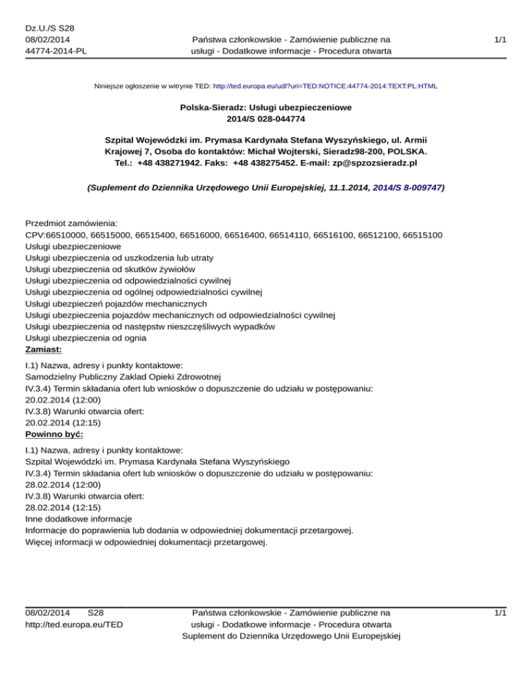 Dz.U./S S28 08/02/2014 44774-2014-PL Państwa członkowskie - Zamówienie publiczne na usługi - Dodatkowe informacje - Procedura otwarta 1/1 Niniejsze ogłoszenie w witrynie TED: http://ted.europa.eu/udl?uri=TED:NOTICE:44774-2014:TEXT:PL:HTML Polska-Sieradz: Usługi ubezpieczeniowe 2014/S 028-044774 Szpital Wojewódzki im. Prymasa Kardynała Stefana Wyszyńskiego, ul. Armii Krajowej 7, Osoba do kontaktów: Michał Wojterski, Sieradz98-200, POLSKA. Tel.: +48 438271942. Faks: +48 438275452. E-mail: [email protected] (Suplement do Dziennika Urzędowego Unii Europejskiej, 11.1.2014, 2014/S 8-009747) Przedmiot zamówienia: CPV:66510000, 66515000, 66515400, 66516000, 66516400, 66514110, 66516100, 66512100, 66515100 Usługi ubezpieczeniowe Usługi ubezpieczenia od uszkodzenia lub utraty Usługi ubezpieczenia od skutków żywiołów Usługi ubezpieczenia od odpowiedzialności cywilnej Usługi ubezpieczenia od ogólnej odpowiedzialności cywilnej Usługi ubezpieczeń pojazdów mechanicznych Usługi ubezpieczenia pojazdów mechanicznych od odpowiedzialności cywilnej Usługi ubezpieczenia od następstw nieszczęśliwych wypadków Usługi ubezpieczenia od ognia Zamiast: I.1) Nazwa, adresy i punkty kontaktowe: Samodzielny Publiczny Zaklad Opieki Zdrowotnej IV.3.4) Termin składania ofert lub wniosków o dopuszczenie do udziału w postępowaniu: 20.02.2014 (12:00) IV.3.8) Warunki otwarcia ofert: 20.02.2014 (12:15) Powinno być: I.1) Nazwa, adresy i punkty kontaktowe: Szpital Wojewódzki im. Prymasa Kardynała Stefana Wyszyńskiego IV.3.4) Termin składania ofert lub wniosków o dopuszczenie do udziału w postępowaniu: 28.02.2014 (12:00) IV.3.8) Warunki otwarcia ofert: 28.02.2014 (12:15) Inne dodatkowe informacje Informacje do poprawienia lub dodania w odpowiedniej dokumentacji przetargowej. Więcej informacji w odpowiedniej dokumentacji przetargowej. 08/02/2014 S28 http://ted.europa.eu/TED Państwa członkowskie - Zamówienie publiczne na usługi - Dodatkowe informacje - Procedura otwarta Suplement do Dziennika Urzędowego Unii Europejskiej 1/1