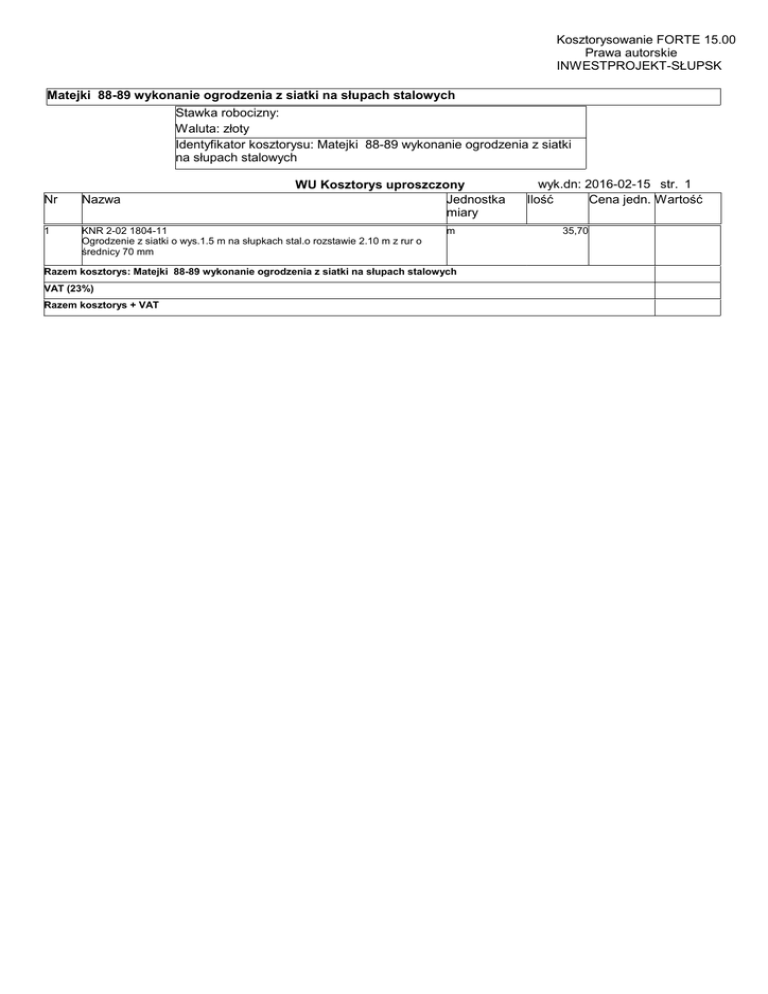 Kosztorysowanie FORTE 15.00 Prawa autorskie INWESTPROJEKT-SŁUPSK Matejki 88-89 wykonanie ogrodzenia z siatki na słupach stalowych Stawka robocizny: Waluta: złoty Identyfikator kosztorysu: Matejki 88-89 wykonanie ogrodzenia z siatki na słupach stalowych WU Kosztorys uproszczony Jednostka miary Nr Nazwa 1 KNR 2-02 1804-11 Ogrodzenie z siatki o wys.1.5 m na słupkach stal.o rozstawie 2.10 m z rur o średnicy 70 mm m Razem kosztorys: Matejki 88-89 wykonanie ogrodzenia z siatki na słupach stalowych VAT (23%) Razem kosztorys + VAT wyk.dn: 2016-02-15 str. 1 Ilość Cena jedn. Wartość 35,70