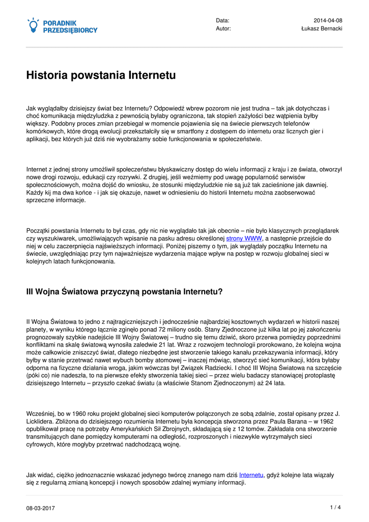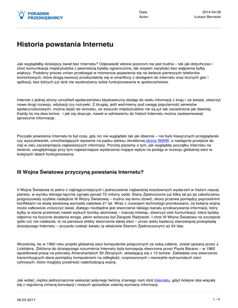 Data: Autor: 2014-04-08 Łukasz Bernacki Historia powstania Internetu Jak wyglądałby dzisiejszy świat bez Internetu? Odpowiedź wbrew pozorom nie jest trudna – tak jak dotychczas i choć komunikacja międzyludzka z pewnością byłaby ograniczona, tak stopień zażyłości bez wątpienia byłby większy. Podobny proces zmian przebiegał w momencie pojawienia się na świecie pierwszych telefonów komórkowych, które drogą ewolucji przekształciły się w smartfony z dostępem do internetu oraz licznych gier i aplikacji, bez których już dziś nie wyobrażamy sobie funkcjonowania w społeczeństwie. Internet z jednej strony umożliwił społeczeństwu błyskawiczny dostęp do wielu informacji z kraju i ze świata, otworzył nowe drogi rozwoju, edukacji czy rozrywki. Z drugiej, jeśli weźmiemy pod uwagę popularność serwisów społecznościowych, można dojść do wniosku, że stosunki międzyludzkie nie są już tak zacieśnione jak dawniej. Każdy kij ma dwa końce - i jak się okazuje, nawet w odniesieniu do historii Internetu można zaobserwować sprzeczne informacje. Początki powstania Internetu to był czas, gdy nic nie wyglądało tak jak obecnie – nie było klasycznych przeglądarek czy wyszukiwarek, umożliwiających wpisanie na pasku adresu określonej strony WWW, a następnie przejście do niej w celu zaczerpnięcia najświeższych informacji. Poniżej piszemy o tym, jak wyglądały początku Internetu na świecie, uwzględniając przy tym najważniejsze wydarzenia mające wpływ na postęp w rozwoju globalnej sieci w kolejnych latach funkcjonowania. III Wojna Światowa przyczyną powstania Internetu? II Wojna Światowa to jedno z najtragiczniejszych i jednocześnie najbardziej kosztownych wydarzeń w historii naszej planety, w wyniku którego łącznie zginęło ponad 72 miliony osób. Stany Zjednoczone już kilka lat po jej zakończeniu prognozowały szybkie nadejście III Wojny Światowej – trudno się temu dziwić, skoro przerwa pomiędzy poprzednimi konfliktami na skalę światową wynosiła zaledwie 21 lat. Wraz z rozwojem technologii prorokowano, że kolejna wojna może całkowicie zniszczyć świat, dlatego niezbędne jest stworzenie takiego kanału przekazywania informacji, który byłby w stanie przetrwać nawet wybuch bomby atomowej – inaczej mówiąc, stworzyć sieć komunikacji, która byłaby odporna na fizyczne działania wroga, jakim wówczas był Związek Radziecki. I choć III Wojna Światowa na szczęście (póki co) nie nadeszła, to na pierwsze efekty stworzenia takiej sieci – przez wielu badaczy stanowiącej protoplastę dzisiejszego Internetu – przyszło czekać światu (a właściwie Stanom Zjednoczonym) aż 24 lata. Wcześniej, bo w 1960 roku projekt globalnej sieci komputerów połączonych ze sobą zdalnie, został opisany przez J. Licklidera. Zbliżona do dzisiejszego rozumienia Internetu była koncepcja stworzona przez Paula Barana – w 1962 opublikował pracę na potrzeby Amerykańskich Sił Zbrojnych, składającą się z 12 tomów. Zakładała ona stworzenie transmitujących dane pomiędzy komputerami na odległość, rozproszonych i niezwykle wytrzymałych sieci cyfrowych, które mogłyby przetrwać nadchodzącą wojnę. Jak widać, ciężko jednoznacznie wskazać jedynego twórcę znanego nam dziś Internetu, gdyż kolejne lata wiązały się z regularną zmianą koncepcji i nowych sposobów zdalnej wymiany informacji. 08-03-2017 1/4 Data: Autor: 2014-04-08 Łukasz Bernacki ARPANET początkiem globalnego Internetu Przyjmuje się, że historia Internetu wiąże swój początek z powstaniem pierwszych węzłów sieci nazywanych ARPANET. Ich powstanie datowane jest na 29 października 1969 roku. Wtedy to na Uniwersytecie Kalifornijskim rozpoczęto eksperyment, mający na celu stworzenie sieci komputerowej nieposiadającej punktu centralnego, który mógłby dowodzić pozostałymi podpiętymi komputerami. Chodziło o stworzenie takiej sieci, która będzie funkcjonować nawet w przypadku zepsucia lub odłączenia określonych części. Było to o tyle istotne, że dotychczas wszystkie sieci sterowane były przez jeden komputer główny – w przypadku jego uszkodzenia cała sieć narażona była na wyłączenie. Co ciekawe, już wtedy pracowano nad takim rozwojem sieci, aby połączenia wychodzące oraz przychodzące były maskowane – bezpieczne i zaszyfrowane połączenia są znane i używane do dziś – przed ewentualnym wrogiem (ZSRR) w momencie rozpętania III Wojny Światowej. Stany Zjednoczone, zdając sobie sprawę z faktu, że w przypadku ataku w pierwszej kolejności zniszczony byłby centralny komputer, wykorzystały koncepcję sieci rozproszonej Paula Barana. Metoda okazała się na tyle skuteczna, że stopniowo zatrudniano coraz liczniejsze grono naukowców do opracowywania nowej technologii. Już po kilku latach udało się dokonywać zdalnych obliczeń matematycznych pomiędzy komputerami oraz stworzyć pierwsze – na potrzeby wojska – aplikacje służące do komunikowania się. Nie trzeba chyba dodawać, że to właśnie dążenie do obustronnej komunikacji do dziś stanowi główny motor napędowy rozwoju Internetu - obok celów poznawczych. Nadejście TCP/IP oraz DNS Dotychczasowe działanie sieci ARPANET dotyczyło zamkniętej struktury komputerów rządowych. Rosnący każdego dnia potencjał i możliwości drzemiące w sieci rozproszonej nie mogły zostać ograniczone wyłącznie do celów państwowych. Z drugiej strony wciąż brakowało rozbudowanych algorytmów, odpowiadających za identyfikację poszczególnych komputerów w obrębie danej sieci – brak tych mechanizmów utrudniał rozwój Internetu w kierunku globalnym, co już wkrótce miało się odmienić. Na początku lat 70-tych powstał protokół internetowy o nazwie TCP/IP. Zadaniem TCP była kontrola transmisji danych przesyłanych w Internecie, które miały odtąd trafiać bezpośrednio z punktu A do punktu B (pomiędzy wybranym nadaw