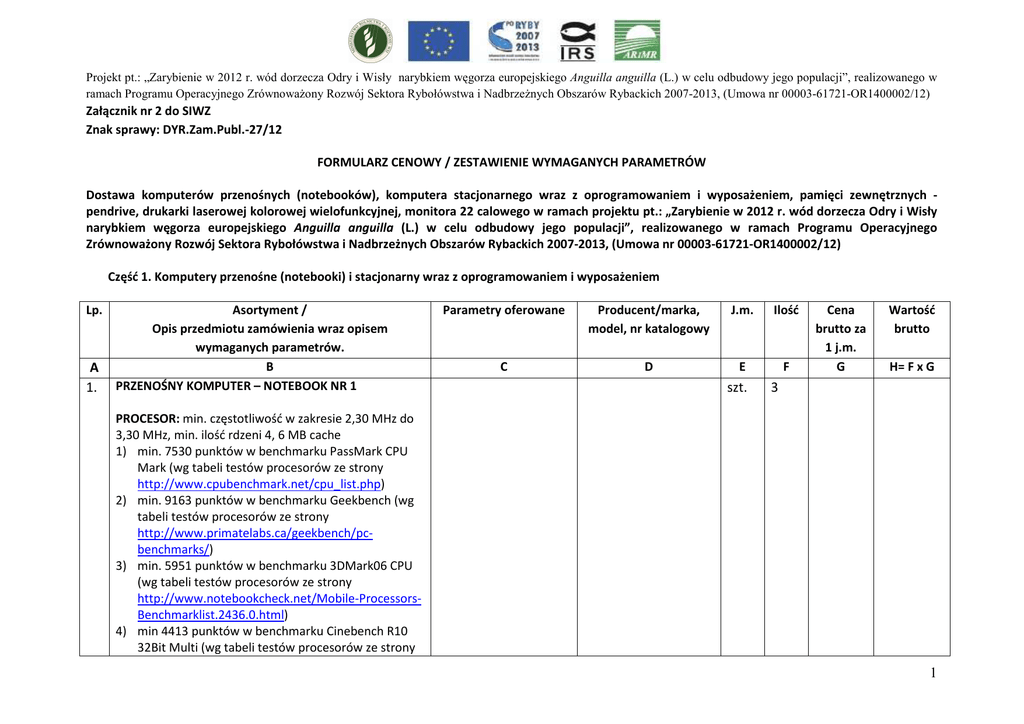 Projekt pt.: „Zarybienie w 2012 r. wód dorzecza Odry i Wisły narybkiem węgorza europejskiego Anguilla anguilla (L.) w celu odbudowy jego populacji”, realizowanego w ramach Programu Operacyjnego ZrównowaŜony Rozwój Sektora Rybołówstwa i NadbrzeŜnych Obszarów Rybackich 2007-2013, (Umowa nr 00003-61721-OR1400002/12) Załącznik nr 2 do SIWZ Znak sprawy: DYR.Zam.Publ.-27/12 FORMULARZ CENOWY / ZESTAWIENIE WYMAGANYCH PARAMETRÓW Dostawa komputerów przenośnych (notebooków), komputera stacjonarnego wraz z oprogramowaniem i wyposażeniem, pamięci zewnętrznych pendrive, drukarki laserowej kolorowej wielofunkcyjnej, monitora 22 calowego w ramach projektu pt.: „Zarybienie w 2012 r. wód dorzecza Odry i Wisły narybkiem węgorza europejskiego Anguilla anguilla (L.) w celu odbudowy jego populacji”, realizowanego w ramach Programu Operacyjnego Zrównoważony Rozwój Sektora Rybołówstwa i Nadbrzeżnych Obszarów Rybackich 2007-2013, (Umowa nr 00003-61721-OR1400002/12) Część 1. Komputery przenośne (notebooki) i stacjonarny wraz z oprogramowaniem i wyposażeniem Lp. A 1. Asortyment / Opis przedmiotu zamówienia wraz opisem wymaganych parametrów. B PRZENOŚNY KOMPUTER – NOTEBOOK NR 1 Parametry oferowane Producent/marka, model, nr katalogowy J.m. Ilość C D E F szt. Cena brutto za 1 j.m. G Wartość brutto H= F x G 3 PROCESOR: min. częstotliwość w zakresie 2,30 MHz do 3,30 MHz, min. ilość rdzeni 4, 6 MB cache 1) min. 7530 punktów w benchmarku PassMark CPU Mark (wg tabeli testów procesorów ze strony http://www.cpubenchmark.net/cpu_list.php) 2) min. 9163 punktów w benchmarku Geekbench (wg tabeli testów procesorów ze strony http://www.primatelabs.ca/geekbench/pcbenchmarks/) 3) min. 5951 punktów w benchmarku 3DMark06 CPU (wg tabeli testów procesorów ze strony http://www.notebookcheck.net/Mobile-ProcessorsBenchmarklist.2436.0.html) 4) min 4413 punktów w benchmarku Cinebench R10 32Bit Multi (wg tabeli testów procesorów ze strony 1 http://www.notebookcheck.net/Mobile-ProcessorsBenchmarklist.2436.0.html) (lub równoważny) RAM: min. 8 GB DDR3, 1600 MHz PIERWSZY DYSK HDD NA SYSTEM: pojemność - min. 250 GB, Typ – SSD, interfece – serial ATA III, szybkość odczytu - min. 540 MB/s , szybkość zapisu - min. 250 MB/s, średni czas dostępu – 0 ms DRUGI DYSK NA DANE: pojemność - min. 750 GB, typ – SATA III, 7200 obr./min, zamontowany wewnątrz w drugiej zatoce na dysk twardy MONITOR: matowy lub z powłoką antyrefleksyjną, full HD, 17,3”, rozdzielczość natywna 1920 x 1080 pikseli NAPĘD OPTYCZNY: nagrywarka Blu-ray + oprogramowanie do nagrywania INTERFEJSY: min. 4 x USB 3.0, 1 x D-Sub, 1 x HDMI GRAFIKA: pamięć wideo min. 2048 MB stałej pamięci GDDR 3 1) min. 1318 punktów w benchmarku PassMark G3D (wg tabeli testów kart graficznych ze strony http://www.videocardbenchmark.net/gpu_list.php) 2) min. 21266 punktów w benchmarku 3DMark05 (wg tabeli testów kart graficznych ze strony http://www.notebookcheck.net/Mobile-GraphicsCards-Benchmark-List.844.0.html) 3) min. 13827 punków w benchmarku 3DMark06 (wg tabeli testów kart graficznych ze strony http://www.notebookcheck.net/Mobile-GraphicsCards-Benchmark-List.844.0.html) (lub równoważna) KOMUNIKACJA: WLAN IEEE 802.11 b/g/n, LAN 10/100/1000 Mbps, Bluetooth 2 MULTIMEDIA: wbudowany mikrofon, kamera min. 1.0 MPix TYP BATERII: litowo-jonowo, min. 6-komorowa OBUDOWA: aluminiowa DODATKOWE INFORMACJE: wydzielona klawiatura numeryczna, podświetlana klawiatura WAGA – do 3,50 kg z baterią SYSTEM OPERACYJNY (zainstalowany) Windows 7 Ultimate BOX (wersja 64-bitowa) lub równoważny OPROGRAMOWANIE: pakiet biurowy Microsoft Office 2010 wersja jednostanowiskowa (nośnik) - lub równoważny GWARANCJA: min. 24 m-ce 2. DODATKI: myszka bezprzewodowa w technologii Bluetooth, torba na laptop z nieprzemakalną podszewką PRZENOŚNY KOMPUTER – NOTEBOOK NR 2 szt. 1 PROCESOR: min. częstotliwość w zakresie 2,5 MHz do 3,1 MHz, min. ilość rdzeni 2, 3 MB cache 1) min. 3883 punktów w benchmarku PassMark CPU Mark (wg tabeli testów procesorów ze strony http://www.cpubenchmark.net/cpu_list.php) 2) min. 5762 punktów w benchmarku Geekbench (wg tabeli testów procesorów ze strony http://www.primatelabs.ca/geekbench/pcbenchmarks/) 3) min. 3489 punktów w benchmarku 3DMark06 CPU (wg tabeli testów procesorów ze strony http://www.notebookcheck.net/Mobile-Processors- 3 Benchmarklist.2436.0.html) 4) min 4158 punktów w benchmarku Cinebench R10 32Bit Multi (wg tabeli testów procesorów ze strony http://www.notebookcheck.net/Mobile-ProcessorsBenchmarklist.2436.0.html) (lub równoważny) RAM: min. 6 GB DDR3, 1600 MHz DYSK HDD: pojemność - min. 1000 GB, interfece – serial ATA III, typ – SATA III, 5400 obr./min MONITOR: z powłoką antyrefleksyjną, 15,6”, rozdzielczość natywna 1366 x 768 pikseli NAPĘD OPTYCZNY: nagrywarka DVD+/-RW DL + oprogramowanie do nagrywania INTERFEJSY: min. 2x USB 3.0, 2x USB 2.0, 1 x D-Sub, 1x HDMI GRAFIKA: pamięć wideo min. 2048 MB stałej pamięci GDDR 3 1) min. 786 punktów w benchmarku PassMark G3D (wg tabeli testów kart graficznych ze strony http://www.videocardbenchmark.net/gpu_list.php) 2) min. 16182 punktów w benchmarku 3DMark05 (wg tabeli testów kart graficznych ze strony http://www.notebookcheck.net/Mobile-GraphicsCards-Benchmark-List.844.0.html) 3) min. 8571 punków w benchmarku 3DMark06 (wg tabeli testów kart graficznych ze strony http://www.notebookcheck.net/Mobile-GraphicsCards-Benchmark-List.844.0.html) (lub równoważna) KOMUNIKACJA: WLAN IEEE 802.11 a/b/g/n, LAN 10/100/1000 Mbps, Bluetooth MULTIMEDIA: wbudowany mikrofon, kamera min. 1.3 MPix 4 TYP BATERII: litowo-jonowo, min. 6-komorowa OBUDOWA: aluminiowa WAGA – do 2,50 kg z baterią SYSTEM OPERACYJNY (zainstalowany) Windows 7 Home Premium (wersja 64-bitowa) lub równoważny GWARANCJA: min 24 m-ce 3. DODATKI: myszka bezprzewodowa w technologii Bluetooth, torba na laptop z nieprzemakalną podszewką KOMPUTER STACJONARN