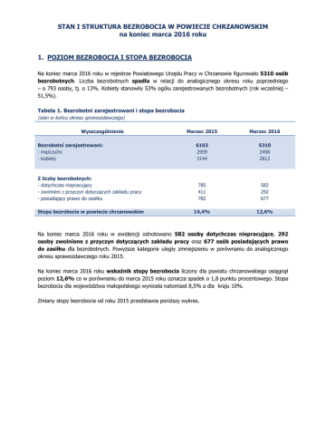STAN I STRUKTURA BEZROBOCIA W POWIECIE CHRZANOWSKIM na koniec marca 2016 roku 1. POZIOM BEZROBOCIA I STOPA BEZROBOCIA Na koniec marca 2016 roku w rejestrze Powiatowego Urzędu Pracy w Chrzanowie figurowało 5310 osób bezrobotnych. Liczba bezrobotnych spadła w relacji do analogicznego okresu roku poprzedniego – o 793 osoby, tj. o 13%. Kobiety stanowiły 53% ogółu zarejestrowanych bezrobotnych (rok wcześniej – 51,5%). Tabela 1. Bezrobotni zarejestrowani i stopa bezrobocia (stan w końcu okresu sprawozdawczego) Wyszczególnienie Marzec 2015 Marzec 2016 6103 2959 3144 5310 2498 2812 Z liczby bezrobotnych: - dotychczas niepracujący - zwolnieni z przyczyn dotyczących zakładu pracy - posiadający prawo do zasiłku 785 411 782 582 292 677 Stopa bezrobocia w powiecie chrzanowskim 14,4% 12,6% Bezrobotni zarejestrowani: - mężczyźni - kobiety Na koniec marca 2016 roku w ewidencji odnotowano 582 osoby dotychczas niepracujące, 292 osoby zwolnione z przyczyn dotyczących zakładu pracy oraz 677 osób posiadających prawo do zasiłku dla bezrobotnych. Powyższe kategorie uległy zmniejszeniu w porównaniu do analogicznego okresu sprawozdawczego roku 2015. Na koniec marca 2016 roku wskaźnik stopy bezrobocia liczony dla powiatu chrzanowskiego osiągnął poziom 12,6% co w porównaniu do marca 2015 roku oznacza spadek o 1,8 punktu procentowego. Stopa bezrobocia dla województwa małopolskiego wyniosła natomiast 8,5% a dla kraju 10%. Zmiany stopy bezrobocia od roku 2015 przedstawia poniższy wykres. Wykres 1. Zmiany stopy bezrobocia w latach 2015 – 2016 2. PŁYNNOŚĆ BEZROBOCIA Stan płynności poziomu bezrobocia zależy od dwóch czynników: napływu czyli osób rejestrujących się jako bezrobotne w danym okresie (tzn. osoby nowo zarejestrowane) oraz odpływu czyli liczby osób tracących status bezrobotnego w tym samym czasie (tzn. osoby wyrejestrowane). Jeżeli w pewnym okresie czasu napływ osób do bezrobocia przewyższa odpływ to wówczas mamy do czynienia z przyrostem bezrobocia, gdy sytuacja jest odwrotna - ze zmniejszaniem się bezrobocia. Od początku 2016 roku do rejestru Powiatowego Urzędu Pracy w Chrzanowie napłynęło łącznie 2141 osób, które uzyskały status osoby bezrobotnej. Udział kobiet w tej grupie ukształtował się na poziomie 50,2 % (1074 kobiety). Do dnia rejestracji 243 osoby rejestrujące się, nigdy nie pracowały zawodowo tj. 11,4 % ogółu napływu. Niepokojącym zjawiskiem był bardzo wysoki udział bezrobotnych powracających do rejestrów po raz kolejny. Na dzień 31.03.2016 roku liczba osób w tej kategorii wyniosła 1856, tj. 86,7% ogółu nowo zarejestrowanych. Sytuacja ta świadczy o nietrwałości podejmowanego zatrudnienia. Natomiast osoby rejestrujące się po raz pierwszy w liczbie 285 stanowiły niespełna 13,3%. Wskaźnik ten utrzymuje się od wielu lat na zbliżonym poziomie. W porównaniu z analogicznym okresem 2015 roku, gdzie w Urzędzie zarejestrowało się 2192 osoby, liczba rejestrujących się bezrobotnych zmalała w badanym roku o 51 osób, tj. spadek o 2,3%. Tabela 2. Bezrobotni nowo zarejestrowani i wyrejestrowani (stan w ciągu okresu) Wyszczególnienie I - III.2015 I - III.2016 Bezrobotni nowo zarejestrowani ogółem z liczby ogółem: - zarejestrowani po raz pierwszy - zarejestrowani po raz kolejny 2192 2141 314 1878 285 1856 Bezrobotni wyrejestrowani ogółem w tym m. in.: - podjęcia pracy subsydiowanej - podjęcia pracy niesubsydiowanej 1789 1682 48 969 70 679 Od początku 2016 roku z ewidencji Powiatowego Urzędu Pracy w Chrzanowie wyłączono ogółem 1682 osób bezrobotnych, w tym 470 kobiet. Głównym powodem wyłączeń bezrobotnych z rejestru bezrobotnych było podjęcie pracy, które w omawianym okresie stanowiło 44,5% wszystkich wyłączeń (749 osób). W porównaniu z rokiem wcześniejszym liczba osób wyłączonych z tego powodu obniżyła się o 268 osób. Kategoria ta obejmuje wszystkie formy podejmowania przez bezrobotnych zatrudnienia tzn. prace subsydiowane (m.in. prace interwencyjne, roboty publiczne, podjęcie własnej działalności gospodarczej) oraz prace niesubsydiowane. Jak wynika z powyższego zestawienia podjęcia pracy niesubsydiowanej stanowiły 90,6% wszystkich podjęć pracy. Ponadto od początku 2016 roku z ewidencji wyłączono 70 osób, które podjęły pracę subsydiowaną, z tego: - 14 osób podjęło prace interwencyjne, - 5 osób podjęło roboty publiczne, - 5 osób otrzymało środki na podjęcie działalności gospodarczej, - 19 osób podjęło pracę w ramach refundacji kosztów zatrudnienia bezrobotnego, - 2 osoby podjęły pracę poza miejscem zamieszkania w ramach bonu na zasiedlenie, - 1 osoba podjęła pracę w ramach bonu zatrudnieniowego, - 4 osoby podjęły pracę w ramach dofinansowania wynagrodzenia za zatrudnienie skierowanego bezrobotnego powyżej 50 roku życia, - 20 osób podjęło pracę w ramach refundacji części kosztów poniesionych na wynagrodzenia, nagrody oraz składki na ubezpieczenie społeczne dla bezrobotnych do 30 roku życia. Drugą z najczęstszych przyczyn wyłączeń z rejestru było niepotwierdzenie gotowości do pracy. Od początku 2016 roku 220 osób zostało wyłączonych z ewidencji z tego powodu, co stanowiło 13,1% odpływu. Przyczyną pozbawienia statusu bezrobotnego była także dobrowolna rezygnacja ze statusu bezrobotnego (107 osób, tj. 6,4%) oraz odmowa bez uzasadnionej przyczyny przyjęcia propozycji odpowiedniej pracy lub innej formy pomocy (10 osób, tj. 0,6%). Utrata statusu bezrobotnego może mieć związek także z dezaktywacją zawodową. Od początku 2016 roku przyczynami tego typu wyłączeń z ewidencji bezrobotnych były: - osiągnięcie wieku emerytalnego – 10 osób, - nabycie praw emerytalnych lub rentowych – 6 osób, - nabycie praw do świadczenia przedemerytalnego – 19 osób Odpływ z ewidencji osób bezrobotnych w od początku 2016 roku związany był także z: - rozpoczęciem stażu – 129 osób, w tym 10 osób 