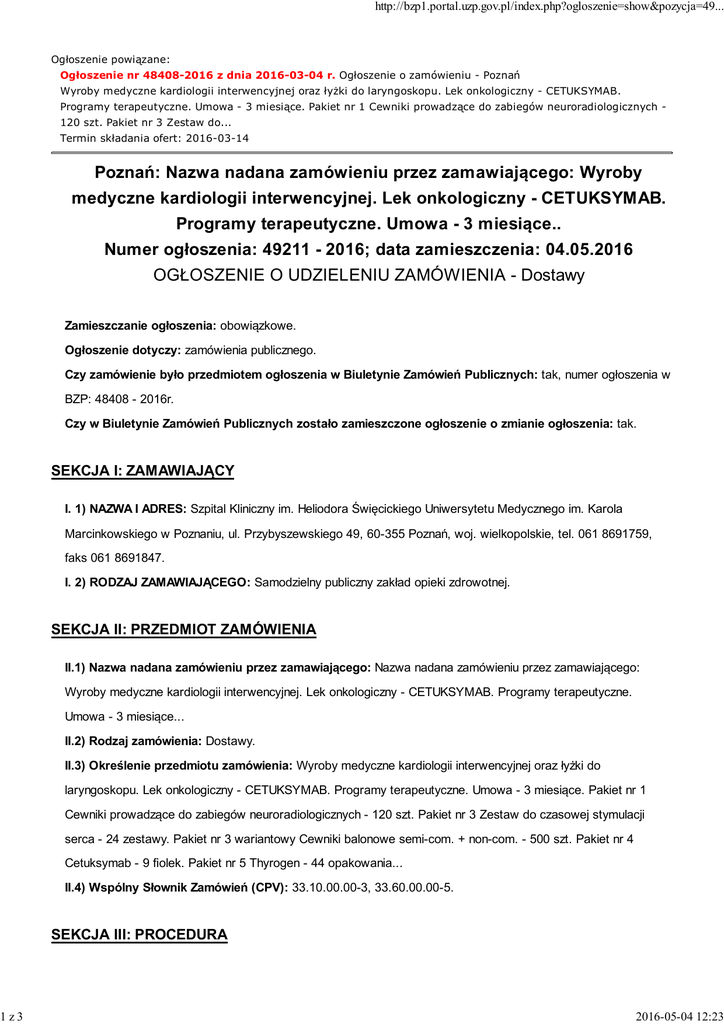 1z3 http://bzp1.portal.uzp.gov.pl/index.php?ogloszenie=show&pozycja=49... Ogłoszenie powiązane: Ogłoszenie nr 48408-2016 z dnia 2016-03-04 r. Ogłoszenie o zamówieniu - Poznań Wyroby medyczne kardiologii interwencyjnej oraz łyżki do laryngoskopu. Lek onkologiczny - CETUKSYMAB. Programy terapeutyczne. Umowa - 3 miesiące. Pakiet nr 1 Cewniki prowadzące do zabiegów neuroradiologicznych 120 szt. Pakiet nr 3 Zestaw do... Termin składania ofert: 2016-03-14 Poznań: Nazwa nadana zamówieniu przez zamawiającego: Wyroby medyczne kardiologii interwencyjnej. Lek onkologiczny - CETUKSYMAB. Programy terapeutyczne. Umowa - 3 miesiące.. Numer ogłoszenia: 49211 - 2016; data zamieszczenia: 04.05.2016 OGŁOSZENIE O UDZIELENIU ZAMÓWIENIA - Dostawy Zamieszczanie ogłoszenia: obowiązkowe. Ogłoszenie dotyczy: zamówienia publicznego. Czy zamówienie było przedmiotem ogłoszenia w Biuletynie Zamówień Publicznych: tak, numer ogłoszenia w BZP: 48408 - 2016r. Czy w Biuletynie Zamówień Publicznych zostało zamieszczone ogłoszenie o zmianie ogłoszenia: tak. SEKCJA I: ZAMAWIAJĄCY I. 1) NAZWA I ADRES: Szpital Kliniczny im. Heliodora Święcickiego Uniwersytetu Medycznego im. Karola Marcinkowskiego w Poznaniu, ul. Przybyszewskiego 49, 60-355 Poznań, woj. wielkopolskie, tel. 061 8691759, faks 061 8691847. I. 2) RODZAJ ZAMAWIAJĄCEGO: Samodzielny publiczny zakład opieki zdrowotnej. SEKCJA II: PRZEDMIOT ZAMÓWIENIA II.1) Nazwa nadana zamówieniu przez zamawiającego: Nazwa nadana zamówieniu przez zamawiającego: Wyroby medyczne kardiologii interwencyjnej. Lek onkologiczny - CETUKSYMAB. Programy terapeutyczne. Umowa - 3 miesiące... II.2) Rodzaj zamówienia: Dostawy. II.3) Określenie przedmiotu zamówienia: Wyroby medyczne kardiologii interwencyjnej oraz łyżki do laryngoskopu. Lek onkologiczny - CETUKSYMAB. Programy terapeutyczne. Umowa - 3 miesiące. Pakiet nr 1 Cewniki prowadzące do zabiegów neuroradiologicznych - 120 szt. Pakiet nr 3 Zestaw do czasowej stymulacji serca - 24 zestawy. Pakiet nr 3 wariantowy Cewniki balonowe semi-com. + non-com. - 500 szt. Pakiet nr 4 Cetuksymab - 9 fiolek. Pakiet nr 5 Thyrogen - 44 opakowania... II.4) Wspólny Słownik Zamówień (CPV): 33.10.00.00-3, 33.60.00.00-5. SEKCJA III: PROCEDURA 2016-05-04 12:23 2z3 http://bzp1.portal.uzp.gov.pl/index.php?ogloszenie=show&pozycja=49... III.1) TRYB UDZIELENIA ZAMÓWIENIA: Przetarg nieograniczony III.2) INFORMACJE ADMINISTRACYJNE Zamówienie dotyczy projektu/programu finansowanego ze środków Unii Europejskiej: nie SEKCJA IV: UDZIELENIE ZAMÓWIENIA Część NR: 2 Nazwa: Pakiet nr 2 IV.1) DATA UDZIELENIA ZAMÓWIENIA: 28.04.2016. IV.2) LICZBA OTRZYMANYCH OFERT: 2. IV.3) LICZBA ODRZUCONYCH OFERT: 0. IV.4) NAZWA I ADRES WYKONAWCY, KTÓREMU UDZIELONO ZAMÓWIENIA: Zakład Tworzyw Sztucznych Hagmed Zając i Tomaszewski Sp. J., Ul. Tomaszowska 32,, 96-200 Rawa Mazowiecka, kraj/woj. mazowieckie. IV.5) Szacunkowa wartość zamówienia (bez VAT): 5160,00 PLN. IV.6) INFORMACJA O CENIE WYBRANEJ OFERTY ORAZ O OFERTACH Z NAJNIŻSZĄ I NAJWYŻSZĄ CENĄ Cena wybranej oferty: 4795,20 Oferta z najniższą ceną: 3628,80 / Oferta z najwyższą ceną: 4795,20 Waluta: PLN . Część NR: 3 Nazwa: Pakiet 3 IV.1) DATA UDZIELENIA ZAMÓWIENIA: 08.04.2016. IV.2) LICZBA OTRZYMANYCH OFERT: 2. IV.3) LICZBA ODRZUCONYCH OFERT: 0. IV.4) NAZWA I ADRES WYKONAWCY, KTÓREMU UDZIELONO ZAMÓWIENIA: Medtronic Poland Sp. z o.o., Ul. Ostrobramska 101,, 04-041 Warszawa, kraj/woj. mazowieckie. IV.5) Szacunkowa wartość zamówienia (bez VAT): 71500,00 PLN. IV.6) INFORMACJA O CENIE WYBRANEJ OFERTY ORAZ O OFERTACH Z NAJNIŻSZĄ I NAJWYŻSZĄ CENĄ Cena wybranej oferty: 8090,00 Oferta z najniższą ceną: 8090,00 / Oferta z najwyższą ceną: 81000,00 Waluta: PLN . Część NR: 4 Nazwa: Pakiet 4 IV.1) DATA UDZIELENIA ZAMÓWIENIA: 08.04.2016. IV.2) LICZBA OTRZYMANYCH OFERT: 1. IV.3) LICZBA ODRZUCONYCH OFERT: 0. IV.4) NAZWA I ADRES WYKONAWCY, KTÓREMU UDZIELONO ZAMÓWIENIA: PGF Urtica Sp. z o.o. , Ul. Krzemieniecka 120, , 54-613 Wrocław , kraj/woj. dolnośląskie. Polska Grupa Farmaceutyczna S.A., Ul. Zbąszyńska 3,, 91-342 Łódź, kraj/woj. łódzkie. 2016-05-04 12:23 3z3 http://bzp1.portal.uzp.gov.pl/index.php?ogloszenie=show&pozycja=49... IV.5) Szacunkowa wartość zamówienia (bez VAT): 37327,50 PLN. IV.6) INFORMACJA O CENIE WYBRANEJ OFERTY ORAZ O OFERTACH Z NAJNIŻSZĄ I NAJWYŻSZĄ CENĄ Cena wybranej oferty: 40307,28 Oferta z najniższą ceną: 40307,28 / Oferta z najwyższą ceną: 40307,28 Waluta: PLN . Część NR: 5 Nazwa: Pakiet 5 IV.1) DATA UDZIELENIA ZAMÓWIENIA: 08.04.2016. IV.2) LICZBA OTRZYMANYCH OFERT: 1. IV.3) LICZBA ODRZUCONYCH OFERT: 0. IV.4) NAZWA I ADRES WYKONAWCY, KTÓREMU UDZIELONO ZAMÓWIENIA: Sanofi-Aventis Sp. z o.o., Ul. Bonifraterska 17,, 00-203 Warszawa, kraj/woj. mazowieckie. IV.5) Szacunkowa wartość zamówienia (bez VAT): 195228,00 PLN. IV.6) INFORMACJA O CENIE WYBRANEJ OFERTY ORAZ O OFERTACH Z NAJNIŻSZĄ I NAJWYŻSZĄ CENĄ Cena wybranej oferty: 210846,24 Oferta z najniższą ceną: 210846,24 / Oferta z najwyższą ceną: 210846,24 Waluta: PLN . 2016-05-04 12:23