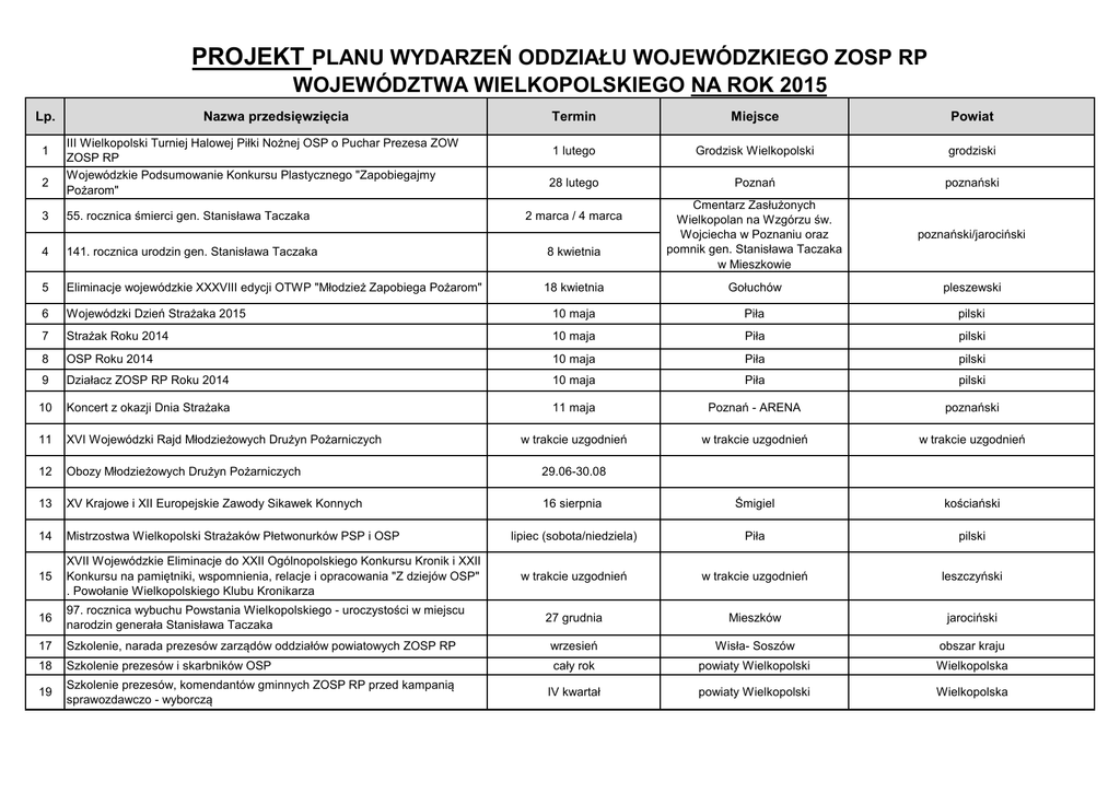 PROJEKT PLANU WYDARZEŃ ODDZIAŁU WOJEWÓDZKIEGO ZOSP RP WOJEWÓDZTWA WIELKOPOLSKIEGO NA ROK 2015 Nazwa przedsięwzięcia Lp. 1 2 3 III Wielkopolski Turniej Halowej Piłki Nożnej OSP o Puchar Prezesa ZOW ZOSP RP Wojewódzkie Podsumowanie Konkursu Plastycznego "Zapobiegajmy Pożarom" 55. rocznica śmierci gen. Stanisława Taczaka Termin Miejsce Powiat 1 lutego Grodzisk Wielkopolski grodziski 28 lutego Poznań poznański Cmentarz Zasłużonych Wielkopolan na Wzgórzu św. Wojciecha w Poznaniu oraz pomnik gen. Stanisława Taczaka w Mieszkowie poznański/jarociński 2 marca / 4 marca 4 141. rocznica urodzin gen. Stanisława Taczaka 8 kwietnia 5 Eliminacje wojewódzkie XXXVIII edycji OTWP "Młodzież Zapobiega Pożarom" 18 kwietnia Gołuchów pleszewski 6 Wojewódzki Dzień Strażaka 2015 10 maja Piła pilski 7 Strażak Roku 2014 10 maja Piła pilski 8 OSP Roku 2014 10 maja Piła pilski 9 Działacz ZOSP RP Roku 2014 10 maja Piła pilski 10 Koncert z okazji Dnia Strażaka 11 maja Poznań - ARENA poznański 11 XVI Wojewódzki Rajd Młodzieżowych Drużyn Pożarniczych w trakcie uzgodnień w trakcie uzgodnień w trakcie uzgodnień 12 Obozy Młodzieżowych Drużyn Pożarniczych 29.06-30.08 13 XV Krajowe i XII Europejskie Zawody Sikawek Konnych 16 sierpnia Śmigiel kościański 14 Mistrzostwa Wielkopolski Strażaków Płetwonurków PSP i OSP lipiec (sobota/niedziela) Piła pilski 15 XVII Wojewódzkie Eliminacje do XXII Ogólnopolskiego Konkursu Kronik i XXII Konkursu na pamiętniki, wspomnienia, relacje i opracowania "Z dziejów OSP" . Powołanie Wielkopolskiego Klubu Kronikarza w trakcie uzgodnień w trakcie uzgodnień leszczyński 16 97. rocznica wybuchu Powstania Wielkopolskiego - uroczystości w miejscu narodzin generała Stanisława Taczaka 27 grudnia Mieszków jarociński 17 Szkolenie, narada prezesów zarządów oddziałów powiatowych ZOSP RP wrzesień Wisła- Soszów obszar kraju 18 Szkolenie prezesów i skarbników OSP cały rok powiaty Wielkopolski Wielkopolska 19 Szkolenie prezesów, komendantów gminnych ZOSP RP przed kampanią sprawozdawczo - wyborczą IV kwartał powiaty Wielkopolski Wielkopolska Lp. Nazwa przedsięwzięcia Termin Miejsce Powiat Kursy kwalifikowanej pierwszej pomocy (podstawowe) Szkolenie Podstawowe: Kiry: 9-17 stycznia, 26 czerwca - 04 lipca, Pruszcz Gdański: 6-12 września Turawa: 7-12 września Kościelisko-Kiry / Pruszcz Gdański / Turawa małopolskie / pomorskie / opolskie 21 Kursy kwalifikowanej pierwszej pomocy (weryfikacyjne) Szkolenie Weryfikacyjne Kiry: 27 luty-1 marca, 8-10 maja, 21-23 sierpnia Turawa: 29-30 sierpnia Kościelisko-Kiry / Turawa małopolskie / opolskie 22 Kurs dla komendantów Gminnych ZOSP RP 2015 17-18.04.2015 r. Józefów mazowieckie 23 Manwery w Ratownictwie Medycznym 20 w trakcie uzgodnień w Dwóch Subregionach Wielkopolskiw trakcie uzgodnień Współudział w organizacji innych imprez propagujących działalność przeciwpożarową poznański (udział OSP i MDP z Wielkopolski) 1 EKOFORUM w ramach XIX Targów Edukacyjnych 20-22 marca Poznań (MTP) 2 VI Konkurs „Najlepsi z Najlepszych” na Wzorową Młodzieżową Drużynę Pożarniczą i jej Opiekuna luty/marzec 3 VI Ogólnopolski Turniej Halowej Piłki Nożnej Ochotniczych Straży Pożarnych o Puchar Prezesa ZG ZOSP RP w trakcie uzgodnień Żnin-Gąsawa (woj. kujawsko-pomorskie) Udział najlepszej drużyny OSP z Wielkopolski 4 XIV Regionalna Spartakiada UKS i MDP kwiecień / w trakcie uzgodnień Trzemeszno gnieźnieński (udział MDP i OSP z Wielkopolski) 5 XIV Indywidualne Mistrzostwa Polski Służb Mundurowych w Szachach 6 XVII Międzypowiatowy Przegląd Piosenki Strażackiej 7 Powiatowy Przegląd Orkiestr Dętych OSP 8 IX Mistrzostwa Polski Strażaków Ochotników w Ratownictwie Wodnym i Powodziowym 9 XII Mistrzostwa Polski Strażaków Ochotników Stihl® Timbersports® Series® 10 XV Ogólnopolskie Zawody MDP w Sportach Obronnych Udział MDP z Wielkopolski Udział OSP z Wielkopolski w trakcie uzgodnień czerwiec / w trakcie uzgodnień Witkowo 21 czerwca Kalisz 19-21 czerwca Sieraków Wielkopolski 4 lipca Kruszwica 19-26 lipca Opole gnieźnieński (udział OSP i MDP z Wielkopolski) kaliski (udział orkiestr OSP z powiatu kaliskiego) międzychodzki (udział OSP z Wielkopolski) woj. kujawsko-pomorskie (udział OSP z Wielkopolski) woj. opolskie (udział MDP z Wielkopolski) Lp. 11 Nazwa przedsięwzięcia VIII Dętkospływ Rzeką Gwdą Termin Miejsce Powiat 29 sierpnia Piła (rz. Gwda w obrębie Piły) pilski (udział OSP z Wielkopolski) 26 kwietnia Częstochowa woj. śląskie ZG ZOSP RP wspólnie z KG PSP 9 maja Górka Klasztorna pilski 23 maja Licheń koniński 30 maja Gostyń gostyński Strażackie pielgrzymowanie 1 2 3 VII Ogólnopolska Pielgrzymka na Strażaków na Jasną Górę 32. Spotkanie Strażaków - Dni Skupienia Braci Strażackiej w najstarszym w Polsce sanktuarium maryjnym VI Ogólnopolski Zlot Chórów i Orkiestr '' Świętemu Janowi Pawłowi II w Hołdzie'' 4 V Spotkanie Rodzin Strażackich w Bazylice na Świętej Górze w Gostyniu 5 XIII Pielgrzymka Służb Mundurowych do Sanktuarium NMP w Borku Wielkopolskim na Zdzieżu 1 lipca Borek Wielkopolski gostyński 6 Dzień Strażaka podczas odpustu MB Wieleńskiej w Wieleniu Zaobrzańskim 2 lipca Wieleń Zaobrzański wolsztyński 7 Dzień Strażaka podczas odpustu MB Zielnej w Charbielinie 14 sierpnia Charbielin leszczyński 8 Dzień Strażaka w odpust MB Pocieszenia w Górce Duchownej 2 września Górka Duchowna leszczyński 9 VIII Procesja Światła w uroczystość Niepokalanego Poczęcia Najświętszej Maryi Panny 8 grudnia Poznań poznański