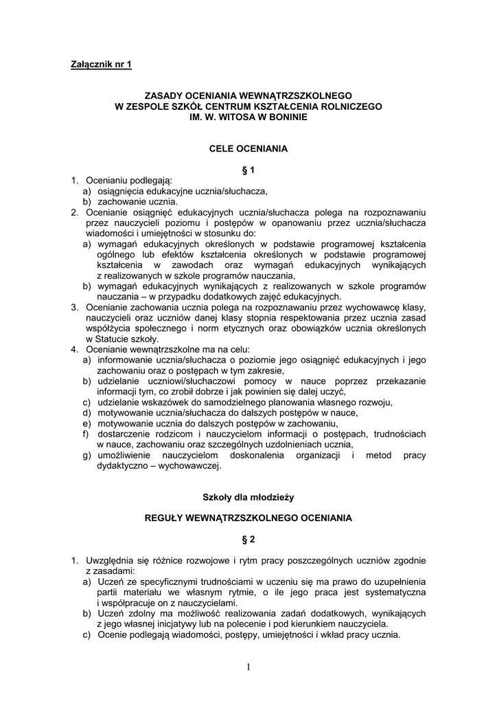 Załącznik nr 1 ZASADY OCENIANIA WEWNĄTRZSZKOLNEGO W ZESPOLE SZKÓŁ CENTRUM KSZTAŁCENIA ROLNICZEGO IM. W. WITOSA W BONINIE CELE OCENIANIA §1 1. Ocenianiu podlegają: a) osiągnięcia edukacyjne ucznia/słuchacza, b) zachowanie ucznia. 2. Ocenianie osiągnięć edukacyjnych ucznia/słuchacza polega na rozpoznawaniu przez nauczycieli poziomu i postępów w opanowaniu przez ucznia/słuchacza wiadomości i umiejętności w stosunku do: a) wymagań edukacyjnych określonych w podstawie programowej kształcenia ogólnego lub efektów kształcenia określonych w podstawie programowej kształcenia w zawodach oraz wymagań edukacyjnych wynikających z realizowanych w szkole programów nauczania, b) wymagań edukacyjnych wynikających z realizowanych w szkole programów nauczania – w przypadku dodatkowych zajęć edukacyjnych. 3. Ocenianie zachowania ucznia polega na rozpoznawaniu przez wychowawcę klasy, nauczycieli oraz uczniów danej klasy stopnia respektowania przez ucznia zasad współżycia społecznego i norm etycznych oraz obowiązków ucznia określonych w Statucie szkoły. 4. Ocenianie wewnątrzszkolne ma na celu: a) informowanie ucznia/słuchacza o poziomie jego osiągnięć edukacyjnych i jego zachowaniu oraz o postępach w tym zakresie, b) udzielanie uczniowi/słuchaczowi pomocy w nauce poprzez przekazanie informacji tym, co zrobił dobrze i jak powinien się dalej uczyć, c) udzielanie wskazówek do samodzielnego planowania własnego rozwoju, d) motywowanie ucznia/słuchacza do dalszych postępów w nauce, e) motywowanie ucznia do dalszych postępów w zachowaniu, f) dostarczenie rodzicom i nauczycielom informacji o postępach, trudnościach w nauce, zachowaniu oraz szczególnych uzdolnieniach ucznia, g) umożliwienie nauczycielom doskonalenia organizacji i metod pracy dydaktyczno – wychowawczej. Szkoły dla młodzieży REGUŁY WEWNĄTRZSZKOLNEGO OCENIANIA §2 1. Uwzględnia się różnice rozwojowe i rytm pracy poszczególnych uczniów zgodnie z zasadami: a) Uczeń ze specyficznymi trudnościami w uczeniu się ma prawo do uzupełnienia partii materiału we własnym rytmie, o ile jego praca jest systematyczna i współpracuje on z nauczycielami. b) Uczeń zdolny ma możliwość realizowania zadań dodatkowych, wynikających z jego własnej inicjatywy lub na polecenie i pod kierunkiem nauczyciela. c) Ocenie podlegają wiadomości, postępy, umiejętności i wkład pracy ucznia. 1 d) Ocena ma charakter informacyjny. e) Śródroczna i roczna ocena jest wypadkową ocen bieżących, co nie oznacza, że jest oceną średnią. 2. Ocenianie wewnątrzszkolne obejmuje: a) formułowanie przez nauczycieli wymagań edukacyjnych niezbędnych do uzyskania poszczególnych śródrocznych i rocznych ocen klasyfikacyjnych z obowiązkowych i dodatkowych zajęć edukacyjnych, b) ustalanie kryteriów oceniania zachowania, c) ustalanie ocen bieżących i śródrocznych ocen klasyfikacyjnych z obowiązkowych i dodatkowych zajęć edukacyjnych oraz śródrocznej oceny klasyfikacyjnej zachowania, d) przeprowadzanie egzaminów klasyfikacyjnych, e) ustalanie rocznych ocen klasyfikacyjnych z obowiązkowych i dodatkowych zajęć edukacyjnych oraz rocznej oceny klasyfikacyjnej zachowania, f) ustalanie warunków i trybu uzyskania wyższych niż przewidywane rocznych ocen klasyfikacyjnych z obowiązkowych i dodatkowych zajęć edukacyjnych oraz rocznej oceny klasyfikacyjnej zachowania, g) ustalanie warunków i sposobu przekazywania rodzicom informacji o postępach i trudnościach w nauce i zachowaniu ucznia oraz o szczególnych uzdolnieniach ucznia. 3. Każdy nauczyciel jest zobowiązany do opracowania wymagań edukacyjnych. 4. Nauczyciele na początku każdego roku szkolnego (do 30 września) informują uczniów i rodziców o: a) wymaganiach edukacyjnych niezbędnych do uzyskania poszczególnych śródrocznych i rocznych ocen klasyfikacyjnych z zajęć edukacyjnych wynikających z realizowanego przez siebie programu nauczania, b) sposobach sprawdzania i oceniania osiągnięć edukacyjnych, c) warunkach i trybie uzyskania wyższej niż przewidywana rocznej oceny klasyfikacyjnej z obowiązkowych i dodatkowych zajęć edukacyjnych. 5. Wychowawca klasy w tym samym terminie informuje uczniów oraz ich rodziców o zasadach i kryteriach oceniania zachowania oraz o warunkach i trybie uzyskania wyższej niż przewidywana rocznej oceny klasyfikacyjnej zachowania. 6. Wychowawca klasy podczas pierwszego w danym roku szkolnym zebrania z rodzicami zapoznaje rodziców z Zasadami Oceniania Wewnątrzszkolnego. Rodzice, podpisując listę obecności na zebraniu, potwierdzają, że zostali zapoznani z tymi zasadami. 7. Fakt zapoznania uczniów z wymaganiami edukacyjnymi i zasadami oceniania oraz kryteriami ocen z zachowania nauczyciel potwierdza zapisem w dzienniku lekcyjnym. 8. Każdy nauczyciel zobowiązany jest do oceniania i klasyfikowania uczniów wg skali i form przyjętych przez szkołę. 9. Nauczyciel jest obowiązany indywidualizować pracę z uczniem na zajęciach edukacyjnych odpowiednio do potrzeb rozwojowych i edukacyjnych oraz możliwości psychofizycznych ucznia. 10. Nauczyciel jest obowiązany dostosować wymagania edukacyjne, o których mowa w ust. 4 lit. a, do indywidualnych potrzeb rozwojowych i edukacyjnych oraz możliwości psychofizycznych ucznia. 11. Na wniosek ucznia lub jego rodziców wszelka dokumentacja dotycząca oceniania ucznia (np. dotycząca egzaminu klasyfikacyjnego i egzaminu poprawkowego) jest udostępniana uczniowi lub jego rodzicom do wglądu na terenie szkoły. 2 ZWOLNIENIE Z ZAJĘĆ §3 1. Dyrektor szkoły zwalnia ucznia z realizacji niektórych obowiązkowych zajęć edukacyjnych ze względu na stan zdrowia, specyficzne trudności w uczeniu się, niepełnosprawność, posiadane kwalifikacje lub zrealizowanie danych obowiązkowych zajęć edukacyjnych na wcześniejszym etapie edukacyjnym. 2. Dyrektor szkoły zwalnia ucznia z wykonywania określonych ćwiczeń fizycznych na zajęciach wy