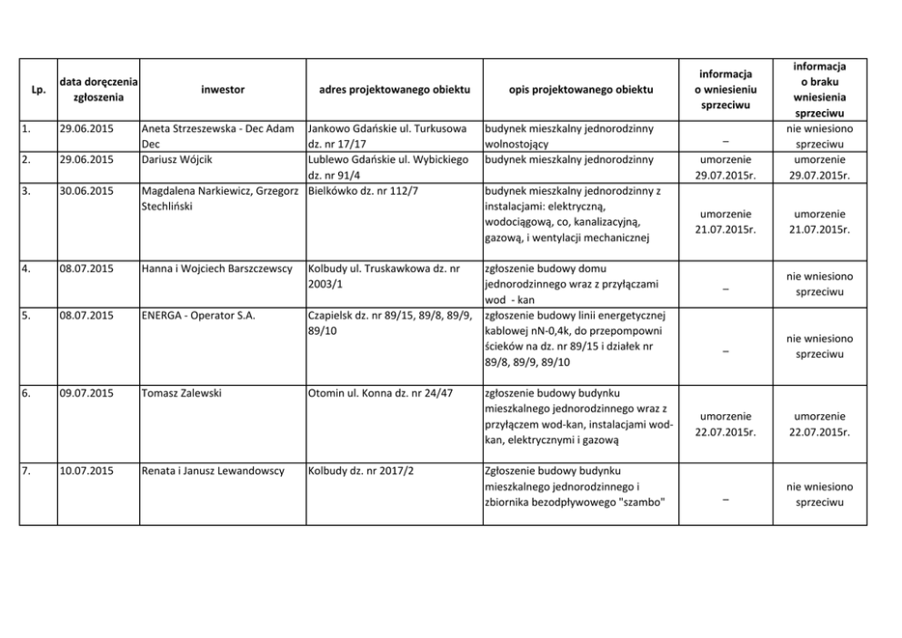 Lp. data doręczenia zgłoszenia 1. 29.06.2015 2. 29.06.2015 3. 30.06.2015 4. 5. 6. 7. 08.07.2015 08.07.2015 09.07.2015 10.07.2015 inwestor adres projektowanego obiektu opis projektowanego obiektu Jankowo Gdańskie ul. Turkusowa dz. nr 17/17 Lublewo Gdańskie ul. Wybickiego dz. nr 91/4 Magdalena Narkiewicz, Grzegorz Bielkówko dz. nr 112/7 Stechliński budynek mieszkalny jednorodzinny wolnostojący budynek mieszkalny jednorodzinny Aneta Strzeszewska - Dec Adam Dec Dariusz Wójcik Hanna i Wojciech Barszczewscy ENERGA - Operator S.A. Tomasz Zalewski Renata i Janusz Lewandowscy Kolbudy ul. Truskawkowa dz. nr 2003/1 Czapielsk dz. nr 89/15, 89/8, 89/9, 89/10 Otomin ul. Konna dz. nr 24/47 Kolbudy dz. nr 2017/2 budynek mieszkalny jednorodzinny z instalacjami: elektryczną, wodociągową, co, kanalizacyjną, gazową, i wentylacji mechanicznej zgłoszenie budowy domu jednorodzinnego wraz z przyłączami wod - kan zgłoszenie budowy linii energetycznej kablowej nN-0,4k, do przepompowni ścieków na dz. nr 89/15 i działek nr 89/8, 89/9, 89/10 zgłoszenie budowy budynku mieszkalnego jednorodzinnego wraz z przyłączem wod-kan, instalacjami wodkan, elektrycznymi i gazową Zgłoszenie budowy budynku mieszkalnego jednorodzinnego i zbiornika bezodpływowego "szambo" umorzenie 29.07.2015r. informacja o braku wniesienia sprzeciwu nie wniesiono sprzeciwu umorzenie 29.07.2015r. umorzenie 21.07.2015r. umorzenie 21.07.2015r. _ nie wniesiono sprzeciwu _ nie wniesiono sprzeciwu umorzenie 22.07.2015r. umorzenie 22.07.2015r. _ nie wniesiono sprzeciwu informacja o wniesieniu sprzeciwu _ 8. 9. 10. 11. 10.07.2015 10.07.2015 10.07.2015 15.07.2015 Agnieszka i Arkadiusz Klein Beata Przygoda BIALL - NET Sp. z o.o. ,,AM Projekt" Sp.zo.o Sp.k. Kolbudy dz. nr 703/7 Jankowo Gdańskie ul. Straszyńska dz. nr 32/6 Kolbudy dz. nr 85/1, Pręgowo Górne DZ. NR 410, 21/1, 24, 25/1, 30, 31/1, 45, 44, 186/5, 245, 246, 249/1, 163, 164, 164, 324, 250/4, 250/1, 184/9, 184/8, 184/6, 184/10, 184/4, 184/5, 189/1, 199, 210/28, 221, 222/18, 217/7, 318,319, 320, 321/1 Lublewo Gdańskie dz. nr 246/255, 246/256, 246/257, 246/258, 246/259, 246/237, 246/268 12. 17.07.2015 Krzysztof Zabłoński Kolbudy ul. Macierzanki dz. nr 983 13. 24.07.2015 BIALL - NET Sp. z o.o. Kolbudy dz. nr 105/7 14. 03.08.2015 Bartłomiej Bartłomiejczyk Bielkówko ul. Studzienna dz. nr 218/9, 214 Zgłoszenie budowy budynku mieszkalnego jednorodzinnego wraz z instalacjami wewnętrznymi: elektryczna, gazowa, kanalizacyjna, wodociagowa, centralnego ogrzewania wentylacyjna Zgłoszenie budowy budynku mieszkalnego jednorodzinnego, adaptacja projektu powtarzalnego "Flawia 2" Zgłoszenie budowy kabli światłowodowych dla potrzeb realizacji śwaitłowodowej sieci szerokopasmowej Biall-Net Zgłoszenie budowy sieci kanalizacji sanitarnej wraz z przyłączami wod-kan zgłoszenie budowy budynku mieszkalnego jednorodzinnego budowa kabli światłowodowych dla potrzeb realizacji światłowodowej sieci szerokopasmowej Biall-Net na terenie powiatu gdańskiego sieci i przyłączy wod kan do projektowanego domu mieszkalnego jednorodzinnego umorzenie 21.07.2015r. umorzenie 21.07.2015r. _ nie wniesiono sprzeciwu _ nie wniesiono sprzeciwu umorzenie 07.08.2015 r. umorzenie 07.08.2015 r. sprzeciw z dnia 27.07.2015 r. _ _ nie wniesiono sprzeciwu Umorzenie 19.08.2015r. Umorzenie 19.08.2015r. 15. 24.07.2015 BIALL - NET Sp. z o.o. (06.08.2015 przekazane wg właściwości) Lisewiec dz. nr 132/2, Czerniewo dz. nr 20, Błotnia dz. nr 39/4 budowa kablii światłowodowych dla potrzeb realizacji światłowodowej sieci szerokopasmowej Biall-Net na terenie powiatu gdańskiego 16. 11.08.2015 Jakub Pawłowski Kolbudy dz. nr 281/4, 281/5, 281/6, Sieć wodociagowa z przyłaczami oraz 281/9, 281/10 Obręb Kolbudy sieć kanalizacji sanitarnej z przyłaczami 335/6, 1024/1 Obręb Lublewo kanalizacyjnymi 17. 12.08.2015 Dariusz Wójcik Lublewo gm. Kolbudy dz. nr 91/4 18. 12.08.2015 Maciej Worach 19. 12.08.2015 BIALL - NET Sp. z o.o. 20. 13.08.2015 Witold Kaliński 21. 13.08.2015 AM Projekt Sp.zo.o. Sp.K Zgłoszenie budowy budynku mieszkalnego jednorodzinnego Kowale gm. Kolbudy dz. nr 73/107 Zgłoszenie budowy budynku mieszkalnego jednorodzinnego z dwoma lokalami oraz dwoma zbiornikami na ścieki Czapielsk gm. Kolbudy dz. nr 42/10, Zgłoszenie budowy kanalizacji kablowej 42/12, 42/3, 42/14, 42/13, 146/20, dla potrzeb realizacji światłowodowej 146/7, 47/9, 47/6, 48/2, 45, 29, sieci szerokopasmowej BIALL-NET 30/1, 30/2, 30/3, 134/2, 133/2, 133/1, 132/2, 131/3, 130/3, 129/4, obręb Jodłowno 129/1, 163/1162, 164, 171 obręb Czapiels gm. Kolbudy Bielkowo gm. Kolbudy dz. nr 331/192 Zgłoszenie budowy budynku mieszkalnego jednorodzinnego z instalacją gazu Lublewo Gdańskie ul. Wieczornych Zgłoszenie budowy sieci kanalizacji sanitarnej wraz z przyłączami wod-kan Mgieł dz. nr 246/255, 246/256, 246/257, 246/258, 246/259, 246/237, 246/268, 246/72 22. 18.08.2015 MK Invest Sp. z o. o. Jankowo Gdańskie gm. Kolbudy dz. Zgłoszenie budowy budynku nr 160/4, 36/32 mieszkalnego jednorodzinnego z dwoma lokalami z instalacją gazową 23. 19.08.2015 Urszula i Jerzy Browarczyk dz. nr 102/29, 102/4, 103, 102/25 Otomin gm. Kolbudy Zgłoszenie budowy sieci wodociągowej wraz z przyłączem do studni 24. 01.09.2015 ENERGA - Operator S.A. Kowale dz. nr 18/56 25. 02.09.2015 Jarosław Pieniążek Otomin ul. Polna 2 dz. nr 107/6 linia kablowa nn 0,4kV dla zasilania budynków mieszkalnych jednorodzinnych budynek mieszkalny jednorodzinny 26. 04.09.2015 Jerzy Śpiewak Buszkowy Górne dz. nr 1105/2 budynek mieszklalny jednorodzinny 27. 28. 29. 30. 31. 32. 33. 34. 35. 36. 37. 38. 39. 40. 41. 42. 43. 44.