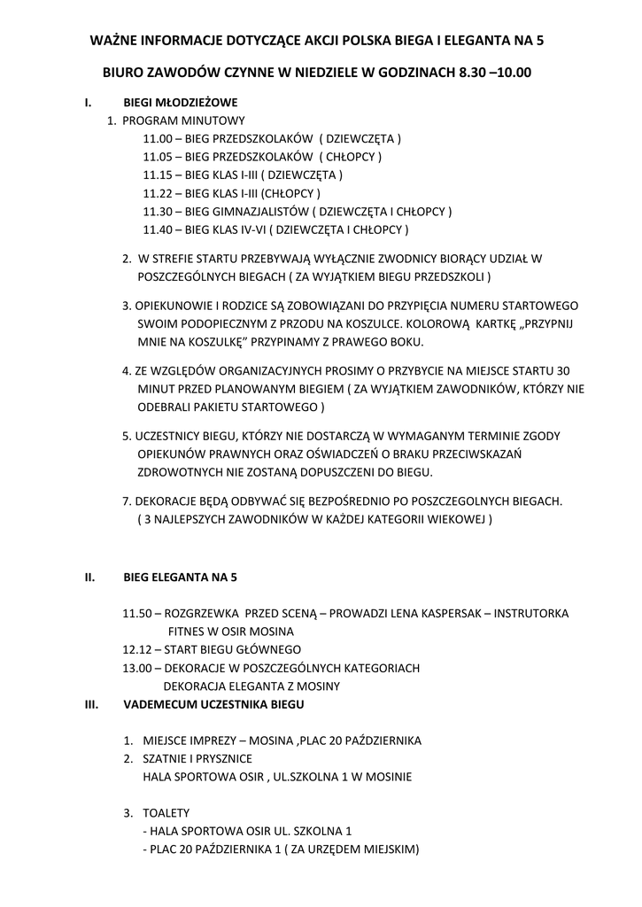 WAŻNE INFORMACJE DOTYCZĄCE AKCJI POLSKA BIEGA I ELEGANTA NA 5 BIURO ZAWODÓW CZYNNE W NIEDZIELE W GODZINACH 8.30 –10.00 I. BIEGI MŁODZIEŻOWE 1. PROGRAM MINUTOWY 11.00 – BIEG PRZEDSZKOLAKÓW ( DZIEWCZĘTA ) 11.05 – BIEG PRZEDSZKOLAKÓW ( CHŁOPCY ) 11.15 – BIEG KLAS I-III ( DZIEWCZĘTA ) 11.22 – BIEG KLAS I-III (CHŁOPCY ) 11.30 – BIEG GIMNAZJALISTÓW ( DZIEWCZĘTA I CHŁOPCY ) 11.40 – BIEG KLAS IV-VI ( DZIEWCZĘTA I CHŁOPCY ) 2. W STREFIE STARTU PRZEBYWAJĄ WYŁĄCZNIE ZWODNICY BIORĄCY UDZIAŁ W POSZCZEGÓLNYCH BIEGACH ( ZA WYJĄTKIEM BIEGU PRZEDSZKOLI ) 3. OPIEKUNOWIE I RODZICE SĄ ZOBOWIĄZANI DO PRZYPIĘCIA NUMERU STARTOWEGO SWOIM PODOPIECZNYM Z PRZODU NA KOSZULCE. KOLOROWĄ KARTKĘ „PRZYPNIJ MNIE NA KOSZULKĘ” PRZYPINAMY Z PRAWEGO BOKU. 4. ZE WZGLĘDÓW ORGANIZACYJNYCH PROSIMY O PRZYBYCIE NA MIEJSCE STARTU 30 MINUT PRZED PLANOWANYM BIEGIEM ( ZA WYJĄTKIEM ZAWODNIKÓW, KTÓRZY NIE ODEBRALI PAKIETU STARTOWEGO ) 5. UCZESTNICY BIEGU, KTÓRZY NIE DOSTARCZĄ W WYMAGANYM TERMINIE ZGODY OPIEKUNÓW PRAWNYCH ORAZ OŚWIADCZEŃ O BRAKU PRZECIWSKAZAŃ ZDROWOTNYCH NIE ZOSTANĄ DOPUSZCZENI DO BIEGU. 7. DEKORACJE BĘDĄ ODBYWAĆ SIĘ BEZPOŚREDNIO PO POSZCZEGOLNYCH BIEGACH. ( 3 NAJLEPSZYCH ZAWODNIKÓW W KAŻDEJ KATEGORII WIEKOWEJ ) II. BIEG ELEGANTA NA 5 III. 11.50 – ROZGRZEWKA PRZED SCENĄ – PROWADZI LENA KASPERSAK – INSTRUTORKA FITNES W OSIR MOSINA 12.12 – START BIEGU GŁÓWNEGO 13.00 – DEKORACJE W POSZCZEGÓLNYCH KATEGORIACH DEKORACJA ELEGANTA Z MOSINY VADEMECUM UCZESTNIKA BIEGU 1. MIEJSCE IMPREZY – MOSINA ,PLAC 20 PAŹDZIERNIKA 2. SZATNIE I PRYSZNICE HALA SPORTOWA OSIR , UL.SZKOLNA 1 W MOSINIE 3. TOALETY - HALA SPORTOWA OSIR UL. SZKOLNA 1 - PLAC 20 PAŹDZIERNIKA 1 ( ZA URZĘDEM MIEJSKIM) - TOALETY PRZENOŚNE – PRZY RONDZIE BUDZYŃ – DOJŚCIE Z PLACU 20 PAŹDZIERNIKA ULICĄ KROTOWSKIEGO – OK.100M. 4. PARKINGI - PRZY HALI SPORTOWEJ OSIR – UL.SZKOLNA 1 W MOSINIE - UL.RZECZNA W MOSINIE - UL.FARBIARSKA W MOSINIE 5. DEPOZYT PLAC 20 PAŹDZIERNIKA ( PRZY BIURZE ZAWODÓW ) 6. PUNKT Z WODA MINERLANĄ NA OK. 2,3 KM – REJON ZESPOŁU SZKÓŁ W KROŚNIE UL. KRASICKIEGO 16. 7. ORGANIZATORZY PROSZĄ O ZWRACANIE UWAGI NA INFORMACJE OD SPIKERÓW I DOSTOSOWANIE SIĘ DO POLECEŃ ORGANIZATORÓW, WOLONTARIUSZY ( UBRANYCH W ZIELONE I BŁĘKITNE KOSZULKI) ORAZ SŁUŻB MUNDUROWYCH.