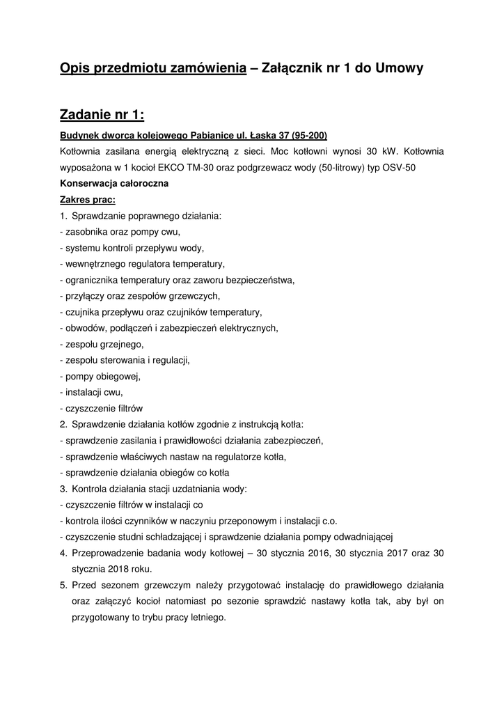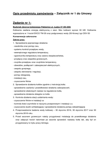Opis przedmiotu zamówienia – Załącznik nr 1 do Umowy Zadanie nr 1: Budynek dworca kolejowego Pabianice ul. Łaska 37 (95-200) Kotłownia zasilana energią elektryczną z sieci. Moc kotłowni wynosi 30 kW. Kotłownia wyposażona w 1 kocioł EKCO TM-30 oraz podgrzewacz wody (50-litrowy) typ OSV-50 Konserwacja całoroczna Zakres prac: 1. Sprawdzanie poprawnego działania: - zasobnika oraz pompy cwu, - systemu kontroli przepływu wody, - wewnętrznego regulatora temperatury, - ogranicznika temperatury oraz zaworu bezpieczeństwa, - przyłączy oraz zespołów grzewczych, - czujnika przepływu oraz czujników temperatury, - obwodów, podłączeń i zabezpieczeń elektrycznych, - zespołu grzejnego, - zespołu sterowania i regulacji, - pompy obiegowej, - instalacji cwu, - czyszczenie filtrów 2. Sprawdzenie działania kotłów zgodnie z instrukcją kotła: - sprawdzenie zasilania i prawidłowości działania zabezpieczeń, - sprawdzenie właściwych nastaw na regulatorze kotła, - sprawdzenie działania obiegów co kotła 3. Kontrola działania stacji uzdatniania wody: - czyszczenie filtrów w instalacji co - kontrola ilości czynników w naczyniu przeponowym i instalacji c.o. - czyszczenie studni schładzającej i sprawdzenie działania pompy odwadniającej 4. Przeprowadzenie badania wody kotłowej – 30 stycznia 2016, 30 stycznia 2017 oraz 30 stycznia 2018 roku. 5. Przed sezonem grzewczym należy przygotować instalację do prawidłowego działania oraz załączyć kocioł natomiast po sezonie sprawdzić nastawy kotła tak, aby był on przygotowany to trybu pracy letniego. 6. Sprawdzanie nastawy w regulatorze kotła po każdorazowym telefonicznym wezwaniu Wykonawcy przez administratora/zarządcę i ustawienia parametrów grzewczych w taki sposób, aby w całym obiekcie instalacja c.o. oraz c.w. działała poprawnie. 7. Przyjazd serwisanta, na wezwanie Zamawiającego, w celu spuszczenia wody z instalacji c.o., lub napełnienia instalacji, wynikającej z konieczności wykonania robót na instalacji grzewczej, 8. Utrzymanie czystości w pomieszczeniach kotłowni łącznie z usuwaniem skroplin z komina Budynek dworca kolejowego Zgierz ul. Kolejowa 3 (95-100) Kotłownia zasilana gazem z sieci. Moc kotłowni wynosi 28 kW. Kotłownia wyposażona w 1 kocioł gazowy dwufunkcyjny Saillanty VUI Pl 282-7 Konserwacja całoroczna Zakres prac: 1. Wykonanie przeglądu niezbędnego do prowadzenia prawidłowej eksploatacji kotła: - gruntowne czyszczenie kotła tj. komory spalania oraz kanałów spalinowych łącznie z kontrolą prawidłowego działania instalacji kotłowni - sprawdzenie stanu technicznego palnika z jego pełną regulacją i usunięciem usterek zgodnie z obowiązującą dla niego instrukcją, - sprawdzanie prawidłowości działania poszczególnych elementów automatyki, armatury zabezpieczającej oraz urządzeń współpracujących z kotłem - sprawdzenie parametrów spalania potwierdzone wydrukiem testu spalin załączony do książki eksploatacji kotłowni - uruchomienie kotłowni łącznie z regulacją kotła z taki sposób, aby temperatury w budynku były zgodnie z obowiązującymi normami - ewentualnie inne badania oceniające, jakość pracy kotłowni, taki jak: pomiar straty kominowej ciepła, pomiar wskaźnika sadzy 2. Stały dozór oraz obsługa techniczna urządzeń i armatury kotłowni w tym: - palników, instalacji paliwa, automatyki - stacji uzdatniania wody oraz urządzeń filtrujących, uzupełnienie środków uzdatniających wodę zgodnie z instrukcją eksploatacji, - odmulanie kotła, - przeprowadzenie badania wody kotłowej – 30 stycznia 2016, 30 stycznia 2017 oraz 30 stycznia 2018 roku. 3. Sprawdzania sprawności i drożności zaworów bezpieczeństwa, wyłączeniu kotła z ruchu, włączaniu kotła do ruchu. 4. Przyjazd serwisanta, na wezwanie Zamawiającego, w celu spuszczenia wody z instalacji c.o., lub napełnienia instalacji, wynikającej z konieczności wykonania robót na instalacji grzewczej, 5. Utrzymanie czystości w pomieszczeniach kotłowni łącznie z usuwaniem skroplin z komina Zadanie nr 2: Budynek dworca Ożarów Mazowiecki ul. Kolejowa 1 (05-850) Kotłownia zasilana gazem z sieci. Moc kotłowni 26 kW. Kotłownia wyposażona w 1 kocioł gazowy MOZG-BS Konserwacja w sezonie grzewczym Zakres prac: 1. Wykonanie przeglądu niezbędnego do prowadzenia prawidłowej eksploatacji kotła: - gruntowne czyszczenie kotła tj. komory spalania oraz kanałów spalinowych łącznie z kontrolą prawidłowego działania instalacji kotłowni - sprawdzenie stanu technicznego palnika z jego pełną regulacją i usunięciem usterek zgodnie z obowiązującą dla niego instrukcją, - sprawdzanie prawidłowości działania poszczególnych elementów automatyki, armatury zabezpieczającej oraz urządzeń współpracujących z kotłem - sprawdzenie parametrów spalania potwierdzone wydrukiem testu spalin załączony do książki eksploatacji kotłowni - uruchomienie kotłowni łącznie z regulacją kotła z taki sposób, aby temperatury w budynku były zgodnie z obowiązującymi normami - ewentualnie inne badania oceniające, jakość pracy kotłowni, taki jak: pomiar straty kominowej ciepła, pomiar wskaźnika sadzy 2. Stały dozór oraz obsługa techniczna urządzeń i armatury kotłowni w tym: - palników, instalacji paliwa, automatyki - stacji uzdatniania wody oraz urządzeń filtrujących, uzupełnienie środków uzdatniających wodę zgodnie z instrukcją eksploatacji, - odmulanie kotła, - przeprowadzenie badania wody kotłowej – 30 stycznia 2016, 30 stycznia 2017 oraz 30 stycznia 2018 roku. 3. Sprawdzania sprawności i drożności zaworów bezpieczeństwa, wyłączeniu kotła z ruchu, włączaniu kotła do ruchu. 4. Przyjazd serwisanta, na wezwanie Zamawiającego, w celu spuszczenia wody z instalacji c.o., lub napełnienia instalacji, wynikającej z konieczności wykonania robót na instalacji grzewczej, 5. Utrzymanie czystości w pomieszczeniach kotłowni łącznie