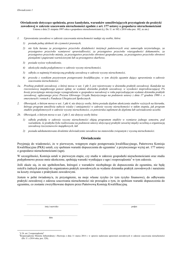 Oświadczenie 1 Oświadczenie dotyczące spełnienia, przez kandydata, warunków umożliwiających przystąpienie do praktyki zawodowej w zakresie szacowania nieruchomości zgodnie z art. 177 ustawy o gospodarce nieruchomościami Ustawa z dnia 21 sierpnia 1997 roku o gospodarce nieruchomościami (t.j. Dz. U. nr 102 z 2010 roku poz. 102, ze zm.) 1. Uprawnienia zawodowe w zakresie szacowania nieruchomości nadaje się osobie, która: 1) posiada pełną zdolność do czynności prawnych, 2) nie była karana za przestępstwo przeciwko działalności instytucji państwowych oraz samorządu terytorialnego, za przestępstwo przeciwko wymiarowi sprawiedliwości, za przestępstwo przeciwko wiarygodności dokumentów, za przestępstwo przeciwko mieniu, za przestępstwo przeciwko obrotowi gospodarczemu, za przestępstwo przeciwko obrotowi pieniędzmi i papierami wartościowymi lub za przestępstwo skarbowe, 3) posiada wyższe wykształcenie, 4) ukończyła studia podyplomowe w zakresie wyceny nieruchomości, 5) odbyła co najmniej 6-miesięczną praktykę zawodową w zakresie wyceny nieruchomości, 6) przeszła z wynikiem pozytywnym postępowanie kwalifikacyjne, w tym złożyła egzamin dający uprawnienia w zakresie szacowania nieruchomości. 1a. Przebieg praktyki zawodowej, o której mowa w ust. 1 pkt 5, jest rejestrowany w dzienniku praktyki zawodowej. Kandydat na rzeczoznawcę majątkowego ponosi opłatę za wydanie dziennika praktyki zawodowej, w wysokości nieprzekraczającej 3% kwoty przeciętnego miesięcznego wynagrodzenia w gospodarce narodowej w roku poprzedzającym wydanie dziennika praktyki zawodowej, ogłaszanego przez Prezesa Głównego Urzędu Statystycznego na podstawie ustawy z dnia 17 grudnia 1998 r. o emeryturach i rentach z Funduszu Ubezpieczeń Społecznych. 2. Obowiązek, o którym mowa w ust. 1 pkt 4, nie dotyczy osoby, która posiada dyplom ukończenia studiów wyższych na kierunku, którego program umożliwia nabycie wiedzy i umiejętności w zakresie wyceny nieruchomości w takim stopniu, jak program studiów podyplomowych w zakresie wyceny nieruchomości, co potwierdza suplement do dyplomu lub zaświadczenie uczelni. 2b. Obowiązek, o którym mowa w ust. 1 pkt 5, nie dotyczy osoby która: 1) odbyła praktykę w zakresie wyceny nieruchomości objętą programem studiów w wymiarze jednego semestru, pod warunkiem, że praktyka była realizowana na podstawie umowy dotyczącej praktyki zawartej między uczelnią a organizacją zawodową rzeczoznawców majątkowych, lub 2) posiada udokumentowane dwuletnie doświadczenie zawodowe na stanowisku związanym z wyceną nieruchomości. Oświadczenie Przyjmuję do wiadomości, że w pierwszym, wstępnym etapie postępowania kwalifikacyjnego, Państwowa Komisja Kwalifikacyjna (PKK) ustali, czy spełniam warunki dopuszczenia do egzaminu1 z przytoczonego wyżej art. 177 ustawy o gospodarce nieruchomościami (ugn). W szczególności, Komisja ustali w pierwszym etapie, czy studia w zakresie gospodarki nieruchomościami oraz studia podyplomowe przeze mnie ukończone, spełniają warunki wynikające z ugn i rozporządzenia2 w tym zakresie. Jeśli okaże się, że nie spełniłem/łam, któregoś z warunków niezbędnego do dopuszczenia do egzaminu, nie będę rościł/a żadnych pretensji do organizatora praktyk zawodowych za wydanie dziennika praktyk zawodowych i narażenie na koszty związane z praktykami zawodowymi. Jestem w pełni świadomy/a, że przystąpienie, na moje własne ryzyko (w tym ryzyko finansowe), do odbywania praktyki zawodowej z zakresu szacowania nieruchomości nie przesądza o tym, że spełniam warunki dopuszczenia do egzaminu, co zostanie zweryfikowane dopiero przez Państwową Komisję Kwalifikacyjną. ................................................................................................ imię i nazwisko .................................................................................................. podpis .................................................................................................... data 1 2 § 24. ust. 2 rozporządzenia2 Rozporządzenie Ministra Infrastruktury i Rozwoju z dnia 11 marca 2014 r. w sprawie nadawania uprawnień zawodowych w zakresie szacowania nieruchomości (Dz. U. z 2014 roku, poz. 328),