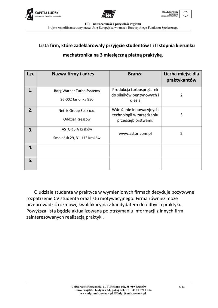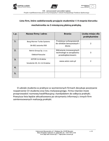 UR – nowoczesność i przyszłość regionu Projekt współfinansowany przez Unię Europejską w ramach Europejskiego Funduszu Społecznego Lista firm, które zadeklarowały przyjęcie studentów I i II stopnia kierunku mechatronika na 3 miesięczną płatną praktykę. L.p. 1. Nazwa firmy i adres Borg Warner Turbo Systems 36-002 Jasionka 950 2. Netrix Group Sp. z o.o. Oddział Rzeszów 3. Branża Liczba miejsc dla praktykantów Produkcja turbosprężarek do silników benzynowych i diesla 2 Wdrażanie innowacyjnych technologii w zarządzaniu przedsiębiorstwami. 3 www.astor.com.pl 2 ASTOR S.A Kraków Smoleńsk 29, 31-112 Kraków 4. 5. O udziale studenta w praktyce w wymienionych firmach decyduje pozytywne rozpatrzenie CV studenta oraz listu motywacyjnego. Firma również może przeprowadzić rozmowę kwalifikacyjną z kandydatem do odbycia praktyki. Powyższa lista będzie aktualizowana po otrzymaniu informacji z innych firm zainteresowanych realizacją praktyki. Uniwersytet Rzeszowski, al. T. Rejtana 16c, 35-959 Rzeszów Biuro Projektu: budynek A1, pokój 024, tel. + 48 17 872 11 84 www.nipr.univ.rzeszow.pl, [email protected] s. 1/1