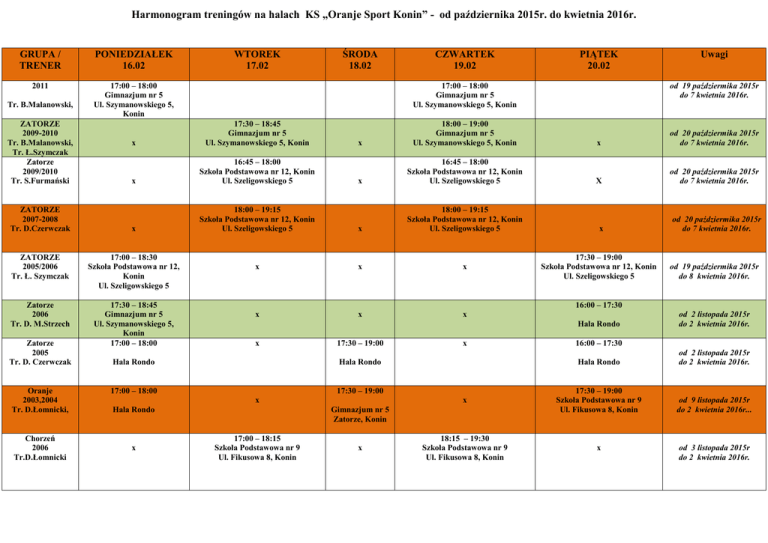 Harmonogram treningów na halach KS „Oranje Sport Konin” - od października 2015r. do kwietnia 2016r. GRUPA / TRENER PONIEDZIAŁEK 16.02 2011 17:00 – 18:00 Gimnazjum nr 5 Ul. Szymanowskiego 5, Konin Tr. B.Malanowski, ZATORZE 2009-2010 Tr. B.Malanowski, Tr. Ł.Szymczak Zatorze 2009/2010 Tr. S.Furmański ZATORZE 2007-2008 Tr. D.Czerwczak x x 18:00 – 19:15 Szkoła Podstawowa nr 12, Konin Ul. Szeligowskiego 5 x 18:00 – 19:15 Szkoła Podstawowa nr 12, Konin Ul. Szeligowskiego 5 x x x x x x 17:30 – 18:45 Gimnazjum nr 5 Ul. Szymanowskiego 5, Konin 17:00 – 18:00 Uwagi od 19 paździermika 2015r do 7 kwietnia 2016r. x 18:00 – 19:00 Gimnazjum nr 5 Ul. Szymanowskiego 5, Konin x od 20 paździermika 2015r do 7 kwietnia 2016r. x 16:45 – 18:00 Szkoła Podstawowa nr 12, Konin Ul. Szeligowskiego 5 X od 20 paździermika 2015r do 7 kwietnia 2016r. x od 20 paździermika 2015r do 7 kwietnia 2016r. 17:30 – 19:00 Szkoła Podstawowa nr 12, Konin Ul. Szeligowskiego 5 od 19 paździermika 2015r do 8 kwietnia 2016r. 16:00 – 17:30 Hala Rondo x Hala Rondo 17:30 – 19:00 x Hala Rondo x 17:30 – 19:00 Szkoła Podstawowa nr 9 Ul. Fikusowa 8, Konin od 9 listopada 2015r do 2 kwietnia 2016r... 18:15 – 19:30 Szkoła Podstawowa nr 9 Ul. Fikusowa 8, Konin x Gimnazjum nr 5 Zatorze, Konin 17:00 – 18:15 Szkoła Podstawowa nr 9 Ul. Fikusowa 8, Konin x 16:00 – 17:30 od 2 listopada 2015r do 2 kwietnia 2016r. 17:30 – 19:00 x od 2 listopada 2015r do 2 kwietnia 2016r. Hala Rondo Hala Rondo 17:00 – 18:00 x PIĄTEK 20.02 17:00 – 18:00 Gimnazjum nr 5 Ul. Szymanowskiego 5, Konin 16:45 – 18:00 Szkoła Podstawowa nr 12, Konin Ul. Szeligowskiego 5 Zatorze 2006 Tr. D. M.Strzech Chorzeń 2006 Tr.D.Łomnicki CZWARTEK 19.02 x 17:00 – 18:30 Szkoła Podstawowa nr 12, Konin Ul. Szeligowskiego 5 Oranje 2003,2004 Tr. D.Łomnicki, ŚRODA 18.02 17:30 – 18:45 Gimnazjum nr 5 Ul. Szymanowskiego 5, Konin ZATORZE 2005/2006 Tr. Ł. Szymczak Zatorze 2005 Tr. D. Czerwczak WTOREK 17.02 od 3 listopada 2015r do 2 kwietnia 2016r. Chorzeń 2008 Tr. M. Strzech x Stary Konin 2007 Tr. Przemysław Wełnicki 16:45 – 18:15 I Liceum w Koninie, Ul. A.Mickiewicza 14 x Stare Miasto 2009/2010 Tr.D.Dzwoniarski x 17:00 – 18:00 Szkoła Podstawowa w Starym Mieście V osiedle/SP 3 2007/2008 Tr. R. Antas 18:00 – 19:00 Hala Sportowa Morzysław Ul. KS.J.Popiełuszki 2a Szkółka Bramkarska x 18:15 – 19:30 Szkoła Podstawowa nr 9 Ul. Fikusowa 8, Konin x 16:45 – 18:15 I Liceum w Koninie, 17:00 – 18:15 Szkoła Podstawowa nr 9 Ul. Fikusowa 8, Konin x od 3 listopada 2015r do 2 kwietnia 2016r. x X od 19 paździermika 2015r do 2 kwietnia 2016r. 18:00 – 19:00 Szkoła Podstawowa w Starym Mieście X Od 13 października 2015r. do 2 kwietnia 2016r. 17:30 – 19:00 Hala Sportowa Morzysław Ul. KS.J.Popiełuszki 2a X od 2 listopada 2015r do 2 kwietnia 2016r. x 17:00 – 18:30 Sala SP 9, Chorzeń chłopcy rocznik 2003/04 od 4 listopada 2015r do 30 marca 2016r. Ul. A.Mickiewicza 14 x x x x 17:00 – 18:30 Sp nr 6 - Konin