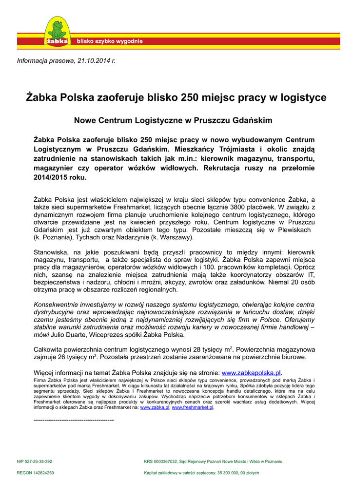 Informacja prasowa, 21.10.2014 r. Żabka Polska zaoferuje blisko 250 miejsc pracy w logistyce Nowe Centrum Logistyczne w Pruszczu Gdańskim Żabka Polska zaoferuje blisko 250 miejsc pracy w nowo wybudowanym Centrum Logistycznym w Pruszczu Gdańskim. Mieszkańcy Trójmiasta i okolic znajdą zatrudnienie na stanowiskach takich jak m.in.: kierownik magazynu, transportu, magazynier czy operator wózków widłowych. Rekrutacja ruszy na przełomie 2014/2015 roku. Żabka Polska jest właścicielem największej w kraju sieci sklepów typu convenience Żabka, a także sieci supermarketów Freshmarket, liczących obecnie łącznie 3800 placówek. W związku z dynamicznym rozwojem firma planuje uruchomienie kolejnego centrum logistycznego, którego otwarcie przewidziane jest na kwiecień przyszłego roku. Centrum logistyczne w Pruszczu Gdańskim jest już czwartym obiektem tego typu. Pozostałe mieszczą się w Plewiskach (k. Poznania), Tychach oraz Nadarzynie (k. Warszawy). Stanowiska, na jakie poszukiwani będą przyszli pracownicy to między innymi: kierownik magazynu, transportu, a także specjalista do spraw logistyki. Żabka Polska zapewni miejsca pracy dla magazynierów, operatorów wózków widłowych i 100. pracowników kompletacji. Oprócz nich, szansę na znalezienie miejsca zatrudnienia mają także koordynatorzy obszarów IT, bezpieczeństwa i nadzoru, chłodni i mroźni, akcyzy, zwrotów oraz załadunków. Niemal 20 osób otrzyma pracę w obszarze rozliczeń regionalnych. Konsekwentnie inwestujemy w rozwój naszego systemu logistycznego, otwierając kolejne centra dystrybucyjne oraz wprowadzając najnowocześniejsze rozwiązania w łańcuchu dostaw, dzięki czemu jesteśmy obecnie jedną z najdynamiczniej rozwijających się firm w Polsce. Oferujemy stabilne warunki zatrudnienia oraz możliwość rozwoju kariery w nowoczesnej firmie handlowej – mówi Julio Duarte, Wiceprezes spółki Żabka Polska. Całkowita powierzchnia centrum logistycznego wynosi 28 tysięcy m2. Powierzchnia magazynowa zajmuje 26 tysięcy m2. Pozostała przestrzeń zostanie zaaranżowana na powierzchnie biurowe. Więcej informacji na temat Żabka Polska znajduje się na stronie: www.zabkapolska.pl. Firma Żabka Polska jest właścicielem największej w Polsce sieci sklepów typu convenience, prowadzonych pod marką Żabka i supermarketów pod marką Freshmarket. W ciągu kilkunastu lat działalności na krajowym rynku, Spółka zdobyła pozycję lidera tego segmentu sprzedaży. Sieci sklepów Żabka i Freshmarket to nowoczesna koncepcja handlu detalicznego, która ma na celu zapewnienie klientom wygody w dokonywaniu zakupów. Wychodząc naprzeciw potrzebom konsumentów w sklepach Żabka i Freshmarket oferowane są najlepsze produkty w konkurencyjnych cenach oraz szeroki wachlarz usług dodatkowych. Więcej informacji o sklepach Żabka oraz Freshmarket na: www.zabka.pl; www.freshmarket.pl. ------------------------------------- NIP 527-26-38-392 KRS 0000367032, Sąd Rejonowy Poznań Nowe Miasto i Wilda w Poznaniu REGON 142624259 Kapitał zakładowy w całości zapłacony: 35 303 000, 00 złotych Żabka Polska sp. z o.o. 61-821 Poznań, ul. Ogrodowa 12, tel. +48 618 563 700, fax +48 618 525 313 www.zabka.pl Kontakt dla mediów: Jacek Spychała Dyrektor ds. Public Relations Tel. 61 85 63 751 Tel. kom. 695 884 076 Email. [email protected] Katarzyna Przewęzikowska Manager ds. Public Relations Tel. 61 85 63 913 kom. 663 496 167 email. [email protected] NIP 527-26-38-392 KRS 0000367032, Sąd Rejonowy Poznań Nowe Miasto i Wilda w Poznaniu REGON 142624259 Kapitał zakładowy w całości zapłacony: 35 303 000, 00 złotych