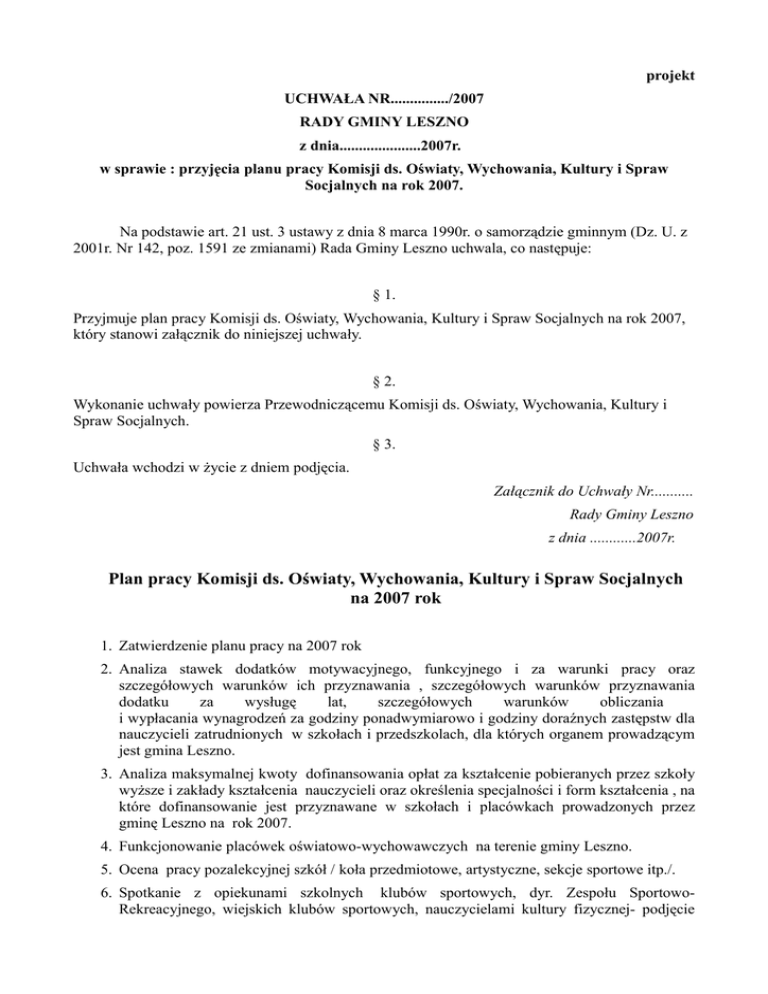 projekt UCHWAŁA NR.............../2007 RADY GMINY LESZNO z dnia.....................2007r. w sprawie : przyjęcia planu pracy Komisji ds. Oświaty, Wychowania, Kultury i Spraw Socjalnych na rok 2007. Na podstawie art. 21 ust. 3 ustawy z dnia 8 marca 1990r. o samorządzie gminnym (Dz. U. z 2001r. Nr 142, poz. 1591 ze zmianami) Rada Gminy Leszno uchwala, co następuje: § 1. Przyjmuje plan pracy Komisji ds. Oświaty, Wychowania, Kultury i Spraw Socjalnych na rok 2007, który stanowi załącznik do niniejszej uchwały. § 2. Wykonanie uchwały powierza Przewodniczącemu Komisji ds. Oświaty, Wychowania, Kultury i Spraw Socjalnych. § 3. Uchwała wchodzi w życie z dniem podjęcia. Załącznik do Uchwały Nr........... Rady Gminy Leszno z dnia ............2007r. Plan pracy Komisji ds. Oświaty, Wychowania, Kultury i Spraw Socjalnych na 2007 rok 1. Zatwierdzenie planu pracy na 2007 rok 2. Analiza stawek dodatków motywacyjnego, funkcyjnego i za warunki pracy oraz szczegółowych warunków ich przyznawania , szczegółowych warunków przyznawania dodatku za wysługę lat, szczegółowych warunków obliczania i wypłacania wynagrodzeń za godziny ponadwymiarowo i godziny doraźnych zastępstw dla nauczycieli zatrudnionych w szkołach i przedszkolach, dla których organem prowadzącym jest gmina Leszno. 3. Analiza maksymalnej kwoty dofinansowania opłat za kształcenie pobieranych przez szkoły wyższe i zakłady kształcenia nauczycieli oraz określenia specjalności i form kształcenia , na które dofinansowanie jest przyznawane w szkołach i placówkach prowadzonych przez gminę Leszno na rok 2007. 4. Funkcjonowanie placówek oświatowo-wychowawczych na terenie gminy Leszno. 5. Ocena pracy pozalekcyjnej szkół / koła przedmiotowe, artystyczne, sekcje sportowe itp./. 6. Spotkanie z opiekunami szkolnych klubów sportowych, dyr. Zespołu SportowoRekreacyjnego, wiejskich klubów sportowych, nauczycielami kultury fizycznej- podjęcie dyskusji na temat stworzenia systemu szkolenia i promocji utalentowanej sportowo młodzieży oraz wypracowania modelu funkcjonowania kultury fizycznej w gminie 7. Ocena realizacji zadań w zakresie opieki społecznej. 8. Informacja na temat bezrobocia w gminie. 9. Analiza arkuszy organizacyjnych szkół i przedszkoli na rok szkolny 2006/2007. 10.Wizyta w świetlicach gminnych , socjoterapeutycznych, bibliotekach działających na terenie gminy / komisja wyjazdowa/. 11.Informacja na temat funkcjonowania w okresie wakacji świetlic gminnych oraz klubów sportowych . 12.Informacja na temat planowanych remontów w placówkach oświatowo-wychowawczych w okresie wakacji. 13.Lustracja gminnych obiektów oświatowych - przygotowanie do rozpoczęcia nowego roku szkolnej2007/2008 14. Spotkanie członków komisji z przedstawicielami związków zawodowych działających w placówkach oświatowych na terenie gminy Leszno. 15.Uchwalenie planu pracy na 2008 rok 16.Spotkania doraźne z inicjatywy organu wykonawczego i ustawodawczego. 17.Opiniowanie projektów uchwał Rady Gminy w sprawach dotyczących oświaty, kultury, sportu i rekreacji. 18.Rozpoczęcie prac nad,, KALENDARZEM IMPREZ GMINY ESZNO’’ - na 2008 rok. Przewodnicząca Komisji ds. Oświaty Barbara Pszczółkowska