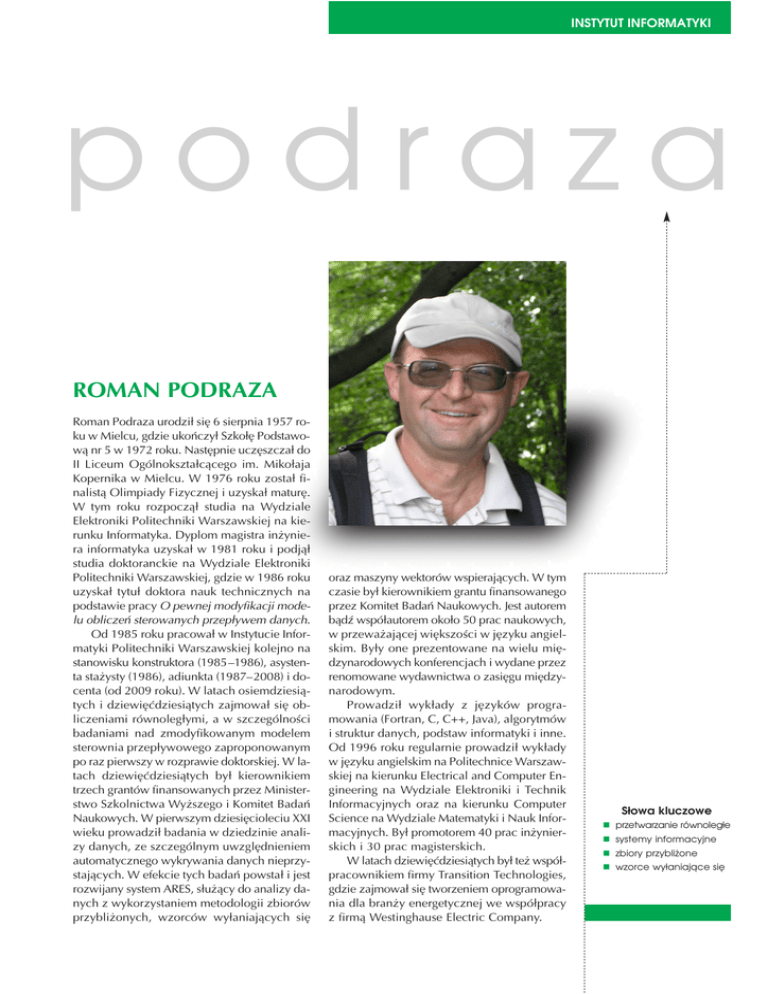 INSTYTUT INFORMATYKI podraza ROMAN PODRAZA Roman Podraza urodził się 6 sierpnia 1957 roku w Mielcu, gdzie ukończył Szkołę Podstawową nr 5 w 1972 roku. Następnie uczęszczał do II Liceum Ogólnokształcącego im. Mikołaja Kopernika w Mielcu. W 1976 roku został finalistą Olimpiady Fizycznej i uzyskał maturę. W tym roku rozpoczął studia na Wydziale Elektroniki Politechniki Warszawskiej na kierunku Informatyka. Dyplom magistra inżyniera informatyka uzyskał w 1981 roku i podjął studia doktoranckie na Wydziale Elektroniki Politechniki Warszawskiej, gdzie w 1986 roku uzyskał tytuł doktora nauk technicznych na podstawie pracy O pewnej modyfikacji modelu obliczeń sterowanych przepływem danych. Od 1985 roku pracował w Instytucie Informatyki Politechniki Warszawskiej kolejno na stanowisku konstruktora (1985–1986), asystenta stażysty (1986), adiunkta (1987–2008) i docenta (od 2009 roku). W latach osiemdziesiątych i dziewięćdziesiątych zajmował się obliczeniami równoległymi, a w szczególności badaniami nad zmodyfikowanym modelem sterownia przepływowego zaproponowanym po raz pierwszy w rozprawie doktorskiej. W latach dziewięćdziesiątych był kierownikiem trzech grantów finansowanych przez Ministerstwo Szkolnictwa Wyższego i Komitet Badań Naukowych. W pierwszym dziesięcioleciu XXI wieku prowadził badania w dziedzinie analizy danych, ze szczególnym uwzględnieniem automatycznego wykrywania danych nieprzystających. W efekcie tych badań powstał i jest rozwijany system ARES, służący do analizy danych z wykorzystaniem metodologii zbiorów przybliżonych, wzorców wyłaniających się oraz maszyny wektorów wspierających. W tym czasie był kierownikiem grantu finansowanego przez Komitet Badań Naukowych. Jest autorem bądź współautorem około 50 prac naukowych, w przeważającej większości w języku angielskim. Były one prezentowane na wielu międzynarodowych konferencjach i wydane przez renomowane wydawnictwa o zasięgu międzynarodowym. Prowadził wykłady z języków programowania (Fortran, C, C++, Java), algorytmów i struktur danych, podstaw informatyki i inne. Od 1996 roku regularnie prowadził wykłady w języku angielskim na Politechnice Warszawskiej na kierunku Electrical and Computer Engineering na Wydziale Elektroniki i Technik Informacyjnych oraz na kierunku Computer Science na Wydziale Matematyki i Nauk Informacyjnych. Był promotorem 40 prac inżynierskich i 30 prac magisterskich. W latach dziewięćdziesiątych był też współpracownikiem firmy Transition Technologies, gdzie zajmował się tworzeniem oprogramowania dla branży energetycznej we współpracy z firmą Westinghause Electric Company. Słowa kluczowe n przetwarzanie równoległe n systemy informacyjne n zbiory przybliżone n wzorce wyłaniające się INSTYTUT INFORMATYKI P Od początku pracy był zaangażowany w działalność organizacyjną wydziału. Był pełnomocnikiem Instytutu Informatyki ds. Praktyk Studenckich, członkiem Komisji Organizacyjnej, członkiem Komisji Kształcenia. Od 1994 roku pełnił nieprzerwanie funkcję pełnomocnika Dziekana ds. studiów w języku angielskim i w ramach tej funkcji organizował wprowadzenie na Wydziale studiów w języku angielskim, a następie sprawował pieczę na ich przebiegiem od strony organizacyjnej. W tym czasie był też członkiem różnych komisji opracowujących programy oraz ramy organizacyjne studiów w języku angielskim. W latach 2009 –2010 był kierownikiem zadania 47 Programu Rozwojowego Politechniki Warszawskiej „Modernizacja”, finansowanego z Programu Operacyjnego „Kapitał Ludzki”. W 1986 roku otrzymał Brązową Odznakę „Zasłużony dla Politechniki Warszawskiej”, a w 2010 roku zespołową Nagrodę Rektora Politechniki Warszawskiej I stopnia za osiągnięcia dydaktyczne za rok 2009. Jest żonaty, ma dwie córki. Interesuję się muzyką, teatrem i sportem. W latach 1976 – –1986 był członkiem sekcji tanecznej Zespołu Pieśni i Tańca Politechniki Warszawskiej.