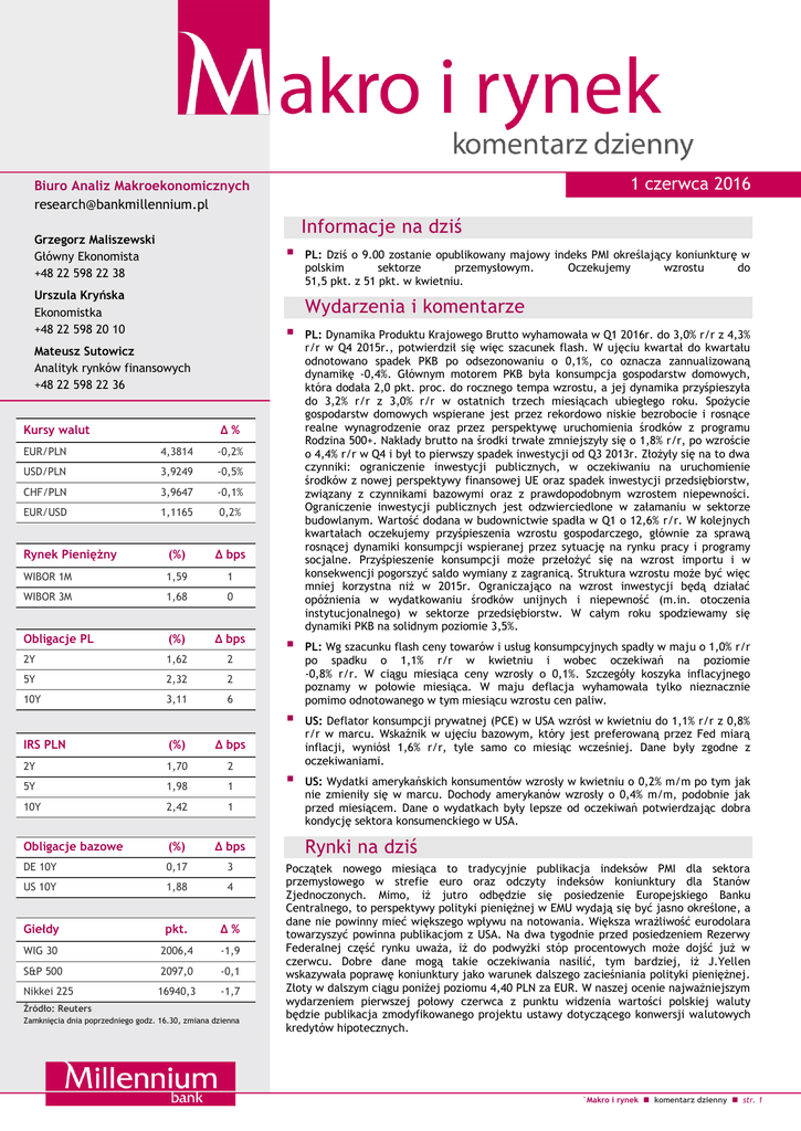 1 czerwca 2016 Biuro Analiz Makroekonomicznych [email protected] Informacje na dziś Grzegorz Maliszewski Główny Ekonomista +48 22 598 22 38 Urszula Kryńska Ekonomistka +48 22 598 20 10 PL: Dziś o 9.00 zostanie opublikowany majowy indeks PMI określający koniunkturę w polskim sektorze przemysłowym. Oczekujemy wzrostu do 51,5 pkt. z 51 pkt. w kwietniu. Wydarzenia i komentarze Mateusz Sutowicz Analityk rynków finansowych +48 22 598 22 36 Kursy walut Δ% EUR/PLN 4,3814 -0,2% USD/PLN 3,9249 -0,5% CHF/PLN 3,9647 -0,1% EUR/USD 1,1165 0,2% Rynek Pieniężny (%) Δ bps WIBOR 1M 1,59 1 WIBOR 3M 1,68 0 Obligacje PL (%) Δ bps 2Y 1,62 2 5Y 2,32 2 10Y 3,11 6 IRS PLN (%) Δ bps 2Y 1,70 2 5Y 1,98 1 10Y 2,42 1 Obligacje bazowe (%) Δ bps DE 10Y 0,17 3 US 10Y 1,88 4 Giełdy pkt. Δ% WIG 30 2006,4 -1,9 S&P 500 2097,0 -0,1 Nikkei 225 16940,3 -1,7 Źródło: Reuters Zamknięcia dnia poprzedniego godz. 16.30, zmiana dzienna PL: Dynamika Produktu Krajowego Brutto wyhamowała w Q1 2016r. do 3,0% r/r z 4,3% r/r w Q4 2015r., potwierdził się więc szacunek flash. W ujęciu kwartał do kwartału odnotowano spadek PKB po odsezonowaniu o 0,1%, co oznacza zannualizowaną dynamikę -0,4%. Głównym motorem PKB była konsumpcja gospodarstw domowych, która dodała 2,0 pkt. proc. do rocznego tempa wzrostu, a jej dynamika przyśpieszyła do 3,2% r/r z 3,0% r/r w ostatnich trzech miesiącach ubiegłego roku. Spożycie gospodarstw domowych wspierane jest przez rekordowo niskie bezrobocie i rosnące realne wynagrodzenie oraz przez perspektywę uruchomienia środków z programu Rodzina 500+. Nakłady brutto na środki trwałe zmniejszyły się o 1,8% r/r, po wzroście o 4,4% r/r w Q4 i był to pierwszy spadek inwestycji od Q3 2013r. Złożyły się na to dwa czynniki: ograniczenie inwestycji publicznych, w oczekiwaniu na uruchomienie środków z nowej perspektywy finansowej UE oraz spadek inwestycji przedsiębiorstw, związany z czynnikami bazowymi oraz z prawdopodobnym wzrostem niepewności. Ograniczenie inwestycji publicznych jest odzwierciedlone w załamaniu w sektorze budowlanym. Wartość dodana w budownictwie spadła w Q1 o 12,6% r/r. W kolejnych kwartałach oczekujemy przyśpieszenia wzrostu gospodarczego, głównie za sprawą rosnącej dynamiki konsumpcji wspieranej przez sytuację na rynku pracy i programy socjalne. Przyśpieszenie konsumpcji może przełożyć się na wzrost importu i w konsekwencji pogorszyć saldo wymiany z zagranicą. Struktura wzrostu może być więc mniej korzystna niż w 2015r. Ograniczająco na wzrost inwestycji będą działać opóźnienia w wydatkowaniu środków unijnych i niepewność (m.in. otoczenia instytucjonalnego) w sektorze przedsiębiorstw. W całym roku spodziewamy się dynamiki PKB na solidnym poziomie 3,5%. PL: Wg szacunku flash ceny towarów i usług konsumpcyjnych spadły w maju o 1,0% r/r po spadku o 1,1% r/r w kwietniu i wobec oczekiwań na poziomie -0,8% r/r. W ciągu miesiąca ceny wzrosły o 0,1%. Szczegóły koszyka inflacyjnego poznamy w połowie miesiąca. W maju deflacja wyhamowała tylko nieznacznie pomimo odnotowanego w tym miesiącu wzrostu cen paliw. US: Deflator konsumpcji prywatnej (PCE) w USA wzrósł w kwietniu do 1,1% r/r z 0,8% r/r w marcu. Wskaźnik w ujęciu bazowym, który jest preferowaną przez Fed miarą inflacji, wyniósł 1,6% r/r, tyle samo co miesiąc wcześniej. Dane były zgodne z oczekiwaniami. US: Wydatki amerykańskich konsumentów wzrosły w kwietniu o 0,2% m/m po tym jak nie zmieniły się w marcu. Dochody amerykanów wzrosły o 0,4% m/m, podobnie jak przed miesiącem. Dane o wydatkach były lepsze od oczekiwań potwierdzając dobra kondycję sektora konsumenckiego w USA. Rynki na dziś Początek nowego miesiąca to tradycyjnie publikacja indeksów PMI dla sektora przemysłowego w strefie euro oraz odczyty indeksów koniunktury dla Stanów Zjednoczonych. Mimo, iż jutro odbędzie się posiedzenie Europejskiego Banku Centralnego, to perspektywy polityki pieniężnej w EMU wydają się być jasno określone, a dane nie powinny mieć większego wpływu na notowania. Większa wrażliwość eurodolara towarzyszyć powinna publikacjom z USA. Na dwa tygodnie przed posiedzeniem Rezerwy Federalnej część rynku uważa, iż do podwyżki stóp procentowych może dojść już w czerwcu. Dobre dane mogą takie oczekiwania nasilić, tym bardziej, iż J.Yellen wskazywała poprawę koniunktury jako warunek dalszego zacieśniania polityki pieniężnej. Złoty w dalszym ciągu poniżej poziomu 4,40 PLN za EUR. W naszej ocenie najważniejszym wydarzeniem pierwszej połowy czerwca z punktu widzenia wartości polskiej waluty będzie publikacja zmodyfikowanego projektu ustawy dotyczącego konwersji walutowych kredytów hipotecznych. `Makro i rynek komentarz dzienny str. 1 Rynek krajowy Kursy walutowe EUR/PLN i EUR/USD 4,50 1,16 4,45 1,14 4,40 1,12 4,35 1,10 4,30 4,25 1,08 4,20 1,06 EURPLN EURUSD /prawa skala/ Źródło: Reuters Rentowności polskich obligacji [%] 3,4 3,0 2,6 2,2 1,8 1,4 Tak jak oczekiwaliśmy powrót inwestorów amerykańskich i brytyjskich, wyłączonych z poniedziałkowego handlu, skutkował wzrostem płynności rynku złotego, a także podwyższoną zmiennością. Wahania kursu EUR/PLN na poziomie 2,5-groszy nie zmieniły jednak dotychczasowego obrazu notowań tej pary. Złoty, po poniedziałkowym osłabieniu, kontynuował trend aprecjacyjny zainaugurowany przed tygodniem. Ciekawie prezentowały się również wczorajsze notowania krajowego długu. Wydarzeniem dnia była informacja Ministerstwa Finansów na temat planu podaży w czerwcu. Zgodnie z nim resort finansów na przetargu 9 czerwca zaoferuje obligacje OK1018 oraz DS0726 łącznie za 3-6 mld PLN. Na przetargu zamiany natomiast tj. 27 czerwca resort zamierza odkupić obligacje OK0716, IZ0816 oraz PS1016. Wybór sprzedawanych papierów zależeć będzie od sytuacji rynkowej, bez obligacji oferowanych 9 czerwca, czyli OK1018 i DS0726. Resort podał, że przetargi sprzedaż