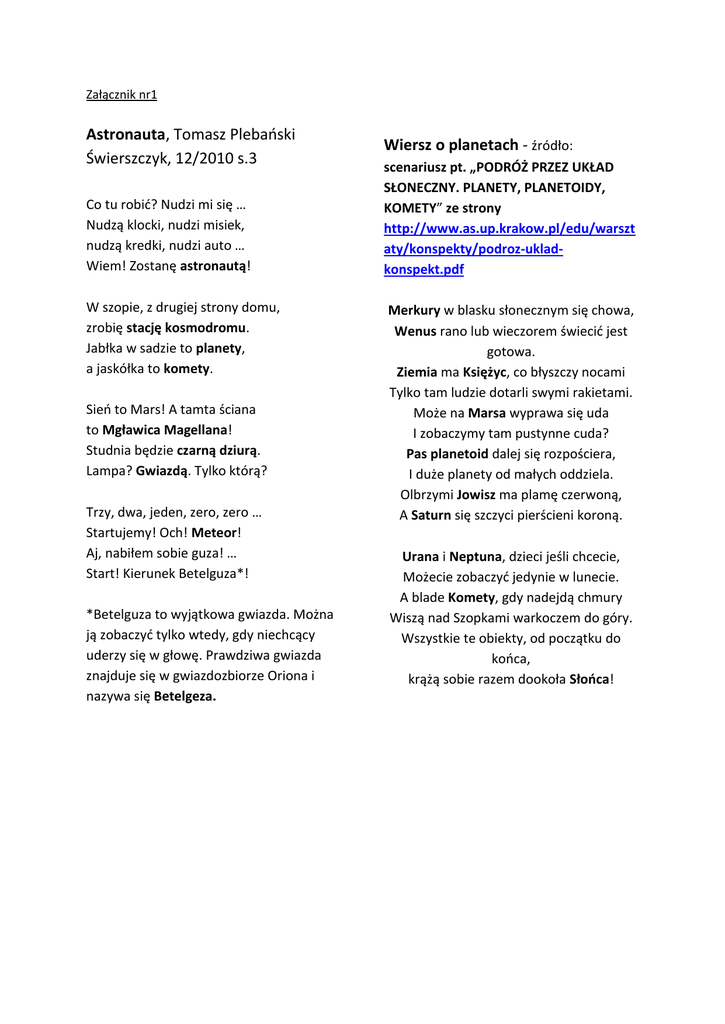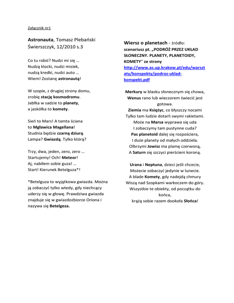 Załącznik nr1 Astronauta, Tomasz Plebański Świerszczyk, 12/2010 s.3 Co tu robić? Nudzi mi się … Nudzą klocki, nudzi misiek, nudzą kredki, nudzi auto … Wiem! Zostanę astronautą! W szopie, z drugiej strony domu, zrobię stację kosmodromu. Jabłka w sadzie to planety, a jaskółka to komety. Sień to Mars! A tamta ściana to Mgławica Magellana! Studnia będzie czarną dziurą. Lampa? Gwiazdą. Tylko którą? Trzy, dwa, jeden, zero, zero … Startujemy! Och! Meteor! Aj, nabiłem sobie guza! … Start! Kierunek Betelguza*! *Betelguza to wyjątkowa gwiazda. Można ją zobaczyć tylko wtedy, gdy niechcący uderzy się w głowę. Prawdziwa gwiazda znajduje się w gwiazdozbiorze Oriona i nazywa się Betelgeza. Wiersz o planetach - źródło: scenariusz pt. „PODRÓŻ PRZEZ UKŁAD SŁONECZNY. PLANETY, PLANETOIDY, KOMETY” ze strony http://www.as.up.krakow.pl/edu/warszt aty/konspekty/podroz-ukladkonspekt.pdf Merkury w blasku słonecznym się chowa, Wenus rano lub wieczorem świecić jest gotowa. Ziemia ma Księżyc, co błyszczy nocami Tylko tam ludzie dotarli swymi rakietami. Może na Marsa wyprawa się uda I zobaczymy tam pustynne cuda? Pas planetoid dalej się rozpościera, I duże planety od małych oddziela. Olbrzymi Jowisz ma plamę czerwoną, A Saturn się szczyci pierścieni koroną. Urana i Neptuna, dzieci jeśli chcecie, Możecie zobaczyć jedynie w lunecie. A blade Komety, gdy nadejdą chmury Wiszą nad Szopkami warkoczem do góry. Wszystkie te obiekty, od początku do końca, krążą sobie razem dookoła Słońca!