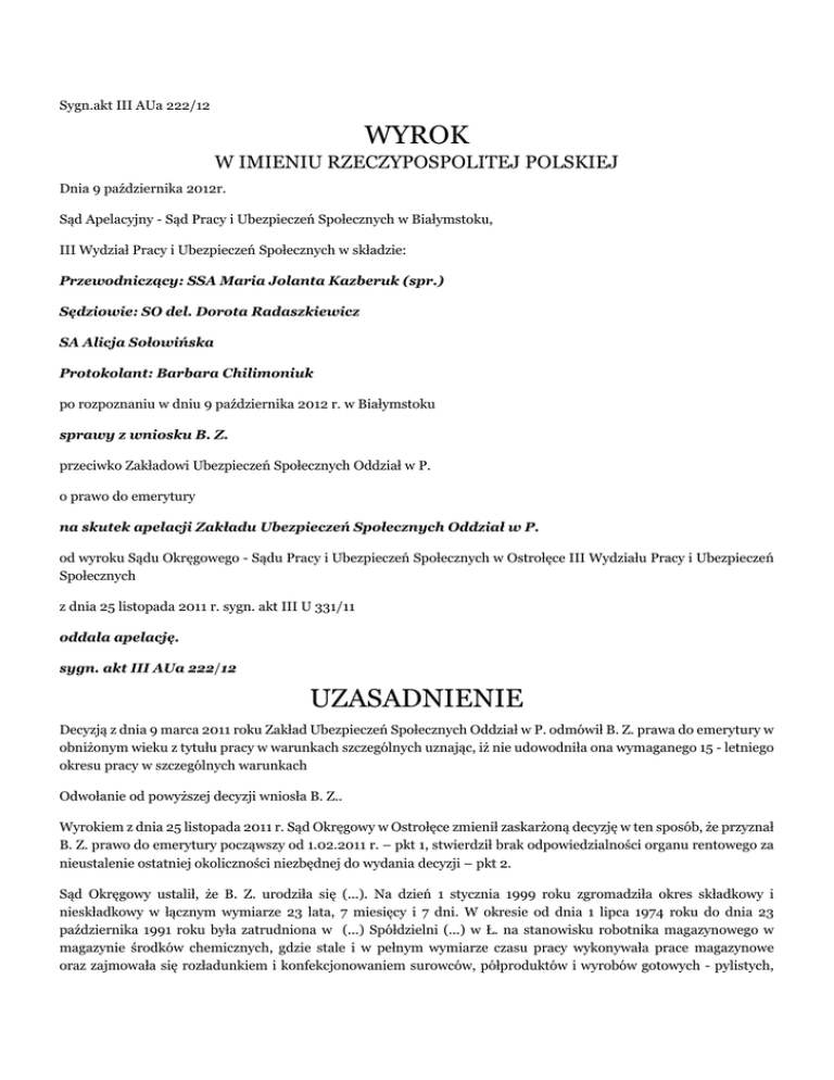 Sygn.akt III AUa 222/12 WYROK W IMIENIU RZECZYPOSPOLITEJ POLSKIEJ Dnia 9 października 2012r. Sąd Apelacyjny - Sąd Pracy i Ubezpieczeń Społecznych w Białymstoku, III Wydział Pracy i Ubezpieczeń Społecznych w składzie: Przewodniczący: SSA Maria Jolanta Kazberuk (spr.) Sędziowie: SO del. Dorota Radaszkiewicz SA Alicja Sołowińska Protokolant: Barbara Chilimoniuk po rozpoznaniu w dniu 9 października 2012 r. w Białymstoku sprawy z wniosku B. Z. przeciwko Zakładowi Ubezpieczeń Społecznych Oddział w P. o prawo do emerytury na skutek apelacji Zakładu Ubezpieczeń Społecznych Oddział w P. od wyroku Sądu Okręgowego - Sądu Pracy i Ubezpieczeń Społecznych w Ostrołęce III Wydziału Pracy i Ubezpieczeń Społecznych z dnia 25 listopada 2011 r. sygn. akt III U 331/11 oddala apelację. sygn. akt III AUa 222/12 UZASADNIENIE Decyzją z dnia 9 marca 2011 roku Zakład Ubezpieczeń Społecznych Oddział w P. odmówił B. Z. prawa do emerytury w obniżonym wieku z tytułu pracy w warunkach szczególnych uznając, iż nie udowodniła ona wymaganego 15 - letniego okresu pracy w szczególnych warunkach Odwołanie od powyższej decyzji wniosła B. Z.. Wyrokiem z dnia 25 listopada 2011 r. Sąd Okręgowy w Ostrołęce zmienił zaskarżoną decyzję w ten sposób, że przyznał B. Z. prawo do emerytury począwszy od 1.02.2011 r. – pkt 1, stwierdził brak odpowiedzialności organu rentowego za nieustalenie ostatniej okoliczności niezbędnej do wydania decyzji – pkt 2. Sąd Okręgowy ustalił, że B. Z. urodziła się (...). Na dzień 1 stycznia 1999 roku zgromadziła okres składkowy i nieskładkowy w łącznym wymiarze 23 lata, 7 miesięcy i 7 dni. W okresie od dnia 1 lipca 1974 roku do dnia 23 października 1991 roku była zatrudniona w (...) Spółdzielni (...) w Ł. na stanowisku robotnika magazynowego w magazynie środków chemicznych, gdzie stale i w pełnym wymiarze czasu pracy wykonywała prace magazynowe oraz zajmowała się rozładunkiem i konfekcjonowaniem surowców, półproduktów i wyrobów gotowych - pylistych, toksycznych, żrących, parzących i wybuchowych. B. Z. nie jest członkiem OFE. Przed wystąpieniem do ZUS z wnioskiem o wcześniejszą emeryturę nie pozostawała w stosunku pracy. Przystępując do rozważań prawnych Sąd przytoczył treść art. 184 ustawy o emeryturach i rentach z Funduszu Ubezpieczeń Społecznych. Przywołał też § 4 oraz § 2 ust. 1 rozporządzenia Rady Ministrów z dnia 7.02.1983 r. w sprawie wieku emerytalnego pracowników zatrudnionych w szczególnych warunkach lub w szczególnym charakterze. Wskazał, że wobec zakwestionowania przez organ rentowy z przyczyn formalnych przedstawionego przez odwołującą świadectwa wykonywania pracy w szczególnych warunkach z dnia 25 października 1999 roku z tytułu zatrudnienia w (...) Spółdzielni (...) w Ł., tj. braku wskazania w tymże świadectwie prawidłowej podstawy prawnej, zasadniczą kwestią wymagającą rozstrzygnięcia było to, czy odwołująca posiada 15 lat pracy w szczególnych warunkach. Na powyższą okoliczność Sąd przesłuchał świadków oraz odwołującą w charakterze strony, przeprowadził też dowód z dokumentów z akt emerytalnych. Na podstawie zeznań świadków H. K. i M. Z., jak też na podstawie zeznań samej odwołującej Sąd wywiódł, że odwołująca w okresie od dnia 1 lipca 1974 roku do 23 października 1991 roku - tj. 17 lat, 3 miesiące i 23 dni była zatrudniona na stanowisku robotnika magazynowego w magazynie środków chemicznych, gdzie stale i w pełnym wymiarze czasu pracy wykonywała prace magazynowe oraz zajmowała się załadunkiem i konfekcjonowaniem surowców, półproduktów i wyrobów gotowych - pylistych, toksycznych, żrących, parzących i wybuchowych. Prace te są wymienione w wykazie Dziale IV poz. 40 rozporządzenia Rady Ministrów z dnia 7 lutego 1983 roku. Zostały też wyszczególnione w Wykazie A dziale IV pozycji 40 Uchwały nr 16/83 Zarządu Centralnego Związku Spółdzielni (...) z dnia 27 czerwca 1983 r. w sprawie stanowisk pracy, na których są wykonywane prace w szczególnych warunkach w spółdzielni mleczarskiej. Uznając, że B. Z. spełniła wszystkie przesłanki warunkujące nabycie uprawnień do wcześniejszej emerytury wynikające z art. 184 ustawy o emeryturach i rentach z FUS w oparciu o art. 47714§2 kpc Sąd Okręgowy zmienił zaskarżoną decyzję i przyznał B. Z. prawo do emerytury począwszy od dnia 1 lutego 2011 roku, stosownie do treści art.129 ust. 1 ustawy z dnia o emeryturach i rentach z FUS. Uzasadniając rozstrzygnięcie zawarte w pkt 2 wyroku, odwołując się do treści art. 118 ust. 1 ustawy o emeryturach i rentach z FUS Sąd Okręgowy doszedł do wniosku, że w sprawie brak było podstaw do obciążenia organu rentowego odpowiedzialnością za nieustalenie wszystkich okoliczności niezbędnych do wydania decyzji o przyznaniu odwołującej prawa do wcześniejszej emerytury. ZUS nie dysponował bowiem niezbędnymi i wystarczającymi dowodami zezwalającymi na uznanie pracy odwołującej w spornym okresie jako pracy wykonywanej w szczególnych warunkach. Apelację od powyższego wyroku wniósł organ retnowy zaskarżając go w pkt 1 i zarzucając: - naruszenie art. 32 ust. 1 ustawy z dnia 17 grudnia 1998 r. o emeryturach i rentach z FUS w zw. z § 1 ust. 1 i ust. 2 oraz § 2 ust. 2 rozporządzenia rady Ministrów z dnia 7.02.1983 r. w sprawie wieku emerytalnego pracowników zatrudnionych w szczególnych warunkach lub w szczególnym charakterze, - błąd w ustaleniach faktycznych przyjętych za podstawę wyroku poprzez uznanie, że praca świadczona przez B. Z. w (...) Spółdzielni (...) w Ł. w okresie od 1.07.1974 r. – 23.10.1991 r. była pracą w warunkach szczególnych, - naruszenie art. 233 § 1 kpc poprzez niezachowanie wymogu wszechstronnego rozważenia zebranego materiału dowodowego, co doprowadziło do wadliwych ustaleń faktycznych, a w konsekwencji do przyznania odwołującej prawa