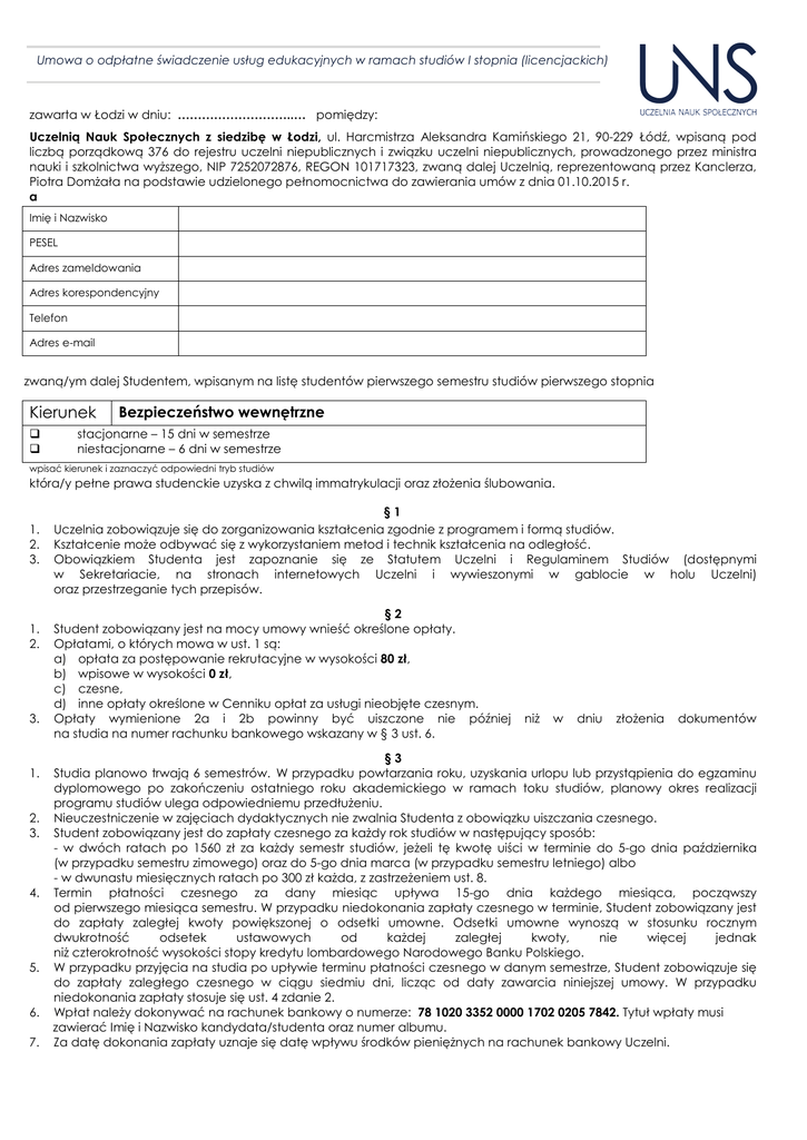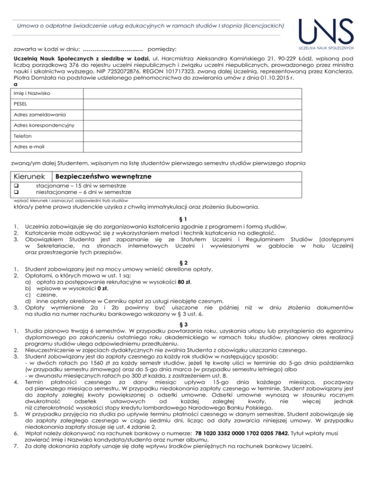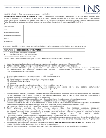 Umowa o odpłatne świadczenie usług edukacyjnych w ramach studiów I stopnia (licencjackich) zawarta w Łodzi w dniu: ………………………..… pomiędzy: Uczelnią Nauk Społecznych z siedzibę w Łodzi, ul. Harcmistrza Aleksandra Kamińskiego 21, 90-229 Łódź, wpisaną pod liczbą porządkową 376 do rejestru uczelni niepublicznych i związku uczelni niepublicznych, prowadzonego przez ministra nauki i szkolnictwa wyższego, NIP 7252072876, REGON 101717323, zwaną dalej Uczelnią, reprezentowaną przez Kanclerza, Piotra Domżała na podstawie udzielonego pełnomocnictwa do zawierania umów z dnia 01.10.2015 r. a Imię i Nazwisko PESEL Adres zameldowania Adres korespondencyjny Telefon Adres e-mail zwaną/ym dalej Studentem, wpisanym na listę studentów pierwszego semestru studiów pierwszego stopnia Kierunek Bezpieczeństwo wewnętrzne stacjonarne – 15 dni w semestrze niestacjonarne – 6 dni w semestrze wpisać kierunek i zaznaczyć odpowiedni tryb studiów która/y pełne prawa studenckie uzyska z chwilą immatrykulacji oraz złożenia ślubowania. 1. 2. 3. 1. 2. 3. 1. 2. 3. 4. 5. 6. 7. §1 Uczelnia zobowiązuje się do zorganizowania kształcenia zgodnie z programem i formą studiów. Kształcenie może odbywać się z wykorzystaniem metod i technik kształcenia na odległość. Obowiązkiem Studenta jest zapoznanie się ze Statutem Uczelni i Regulaminem Studiów (dostępnymi w Sekretariacie, na stronach internetowych Uczelni i wywieszonymi w gablocie w holu Uczelni) oraz przestrzeganie tych przepisów. §2 Student zobowiązany jest na mocy umowy wnieść określone opłaty. Opłatami, o których mowa w ust. 1 są: a) opłata za postępowanie rekrutacyjne w wysokości 80 zł, b) wpisowe w wysokości 0 zł, c) czesne, d) inne opłaty określone w Cenniku opłat za usługi nieobjęte czesnym. Opłaty wymienione 2a i 2b powinny być uiszczone nie później na studia na numer rachunku bankowego wskazany w § 3 ust. 6. niż w dniu złożenia dokumentów §3 Studia planowo trwają 6 semestrów. W przypadku powtarzania roku, uzyskania urlopu lub przystąpienia do egzaminu dyplomowego po zakończeniu ostatniego roku akademickiego w ramach toku studiów, planowy okres realizacji programu studiów ulega odpowiedniemu przedłużeniu. Nieuczestniczenie w zajęciach dydaktycznych nie zwalnia Studenta z obowiązku uiszczania czesnego. Student zobowiązany jest do zapłaty czesnego za każdy rok studiów w następujący sposób: - w dwóch ratach po 1560 zł za każdy semestr studiów, jeżeli tę kwotę uiści w terminie do 5-go dnia października (w przypadku semestru zimowego) oraz do 5-go dnia marca (w przypadku semestru letniego) albo - w dwunastu miesięcznych ratach po 300 zł każda, z zastrzeżeniem ust. 8. Termin płatności czesnego za dany miesiąc upływa 15-go dnia każdego miesiąca, począwszy od pierwszego miesiąca semestru. W przypadku niedokonania zapłaty czesnego w terminie, Student zobowiązany jest do zapłaty zaległej kwoty powiększonej o odsetki umowne. Odsetki umowne wynoszą w stosunku rocznym dwukrotność odsetek ustawowych od każdej zaległej kwoty, nie więcej jednak niż czterokrotność wysokości stopy kredytu lombardowego Narodowego Banku Polskiego. W przypadku przyjęcia na studia po upływie terminu płatności czesnego w danym semestrze, Student zobowiązuje się do zapłaty zaległego czesnego w ciągu siedmiu dni, licząc od daty zawarcia niniejszej umowy. W przypadku niedokonania zapłaty stosuje się ust. 4 zdanie 2. Wpłat należy dokonywać na rachunek bankowy o numerze: 78 1020 3352 0000 1702 0205 7842. Tytuł wpłaty musi zawierać Imię i Nazwisko kandydata/studenta oraz numer albumu. Za datę dokonania zapłaty uznaje się datę wpływu środków pieniężnych na rachunek bankowy Uczelni. 8. 1. 2. 3. 4. 5. 6. 1. 2. 1. 2. Student może zapłacić ratę czesnego za dany miesiąc: - w wysokości 260 zł, pod warunkiem jej wpłaty do 5-go dnia miesiąca. §4 Strony umowy zgodnie postanawiają, że Uczelnia może dokonać, nie później niż na 14 dni przed rozpoczęciem kolejnego semestru, zmiany wysokości czesnego (waloryzacja umowna), przy czym każda zmiana wysokości czesnego nie może przekroczyć kwoty uzyskanej z przemnożenia wysokości czesnego wskazanej w § 3 ust. 3 i 8 przez wskaźnik inflacji za ubiegły rok liczony do miesiąca poprzedzającego zmianę wysokości czesnego ogłaszany przez Prezesa Głównego Urzędu Statystycznego powiększony o 10 % wysokości czesnego wskazanej w § 3 ust. 3 i 8. Zmiana wysokości czesnego wymaga wydania stosownego Zarządzenia Kanclerza Uczelni, przekazania jego treści Studentowi co najmniej na podany przez Studenta adres poczty elektronicznej oraz ogłoszenia treści Zarządzenia w gablocie w holu Uczelni, z zastrzeżeniem ust.2. Student, który nie wyraża zgody na zmianę czesnego, ma prawo w ciągu 7 dni od powzięcia wiadomości o zmianie wysokości czesnego rozwiązać niniejszą umowę. W takim przypadku umowa rozwiązuje się z ostatnim dniem semestru poprzedzającego nowy semestr, którego dotyczy zmiana wysokości czesnego. Oświadczenie Studenta o rozwiązaniu umowy powinno być złożone w formie pisemnej w Sekretariacie Uczelni. W przypadku niezachowania przez Studenta formy oraz terminu złożenia oświadczenia o rozwiązaniu umowy przyjmuje się, że Student wyraża zgodę na zmianę wysokości czesnego. Uczelnia może dokonać w oznaczonym okresie obniżenia wysokości czesnego określonego w § 3 ust. 3 i 8. Obniżenie wysokości czesnego dokonane będzie na podstawie Zarządzenia Kanclerza Uczelni, przekazania jego treści Studentowi co najmniej na podany przez Studenta adres poczty elektronicznej oraz ogłoszenia treści Zarządzenia w gablocie w holu Uczelni, co będzie skutkować zmianą treści umowy bez potrzeby podpisania aneksu. W przypadku zwiększania innych opłat, o których stanowi § 2 ust. 2 lit. d umowy, stosuje się ust. 1 i 2 powyżej, z tym że podstaw