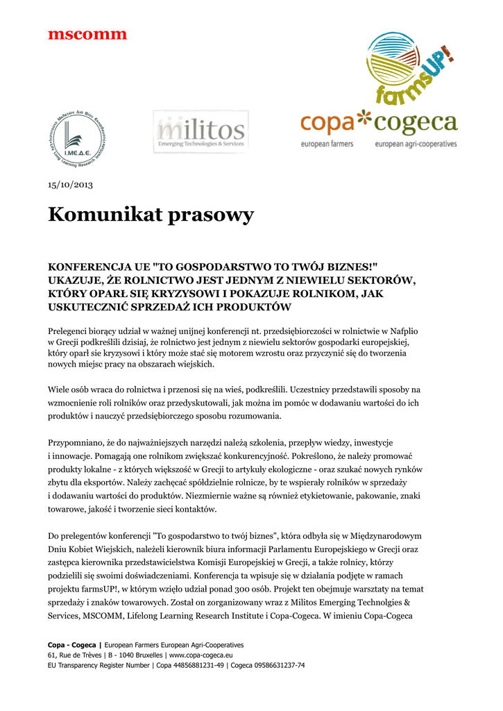 mscomm 15/10/2013 Komunikat prasowy KONFERENCJA UE "TO GOSPODARSTWO TO TWÓJ BIZNES!" UKAZUJE, ŻE ROLNICTWO JEST JEDNYM Z NIEWIELU SEKTORÓW, KTÓRY OPARŁ SIĘ KRYZYSOWI I POKAZUJE ROLNIKOM, JAK USKUTECZNIĆ SPRZEDAŻ ICH PRODUKTÓW Prelegenci biorący udział w ważnej unijnej konferencji nt. przedsiębiorczości w rolnictwie w Nafplio w Grecji podkreślili dzisiaj, że rolnictwo jest jednym z niewielu sektorów gospodarki europejskiej, który oparł sie kryzysowi i który może stać się motorem wzrostu oraz przyczynić się do tworzenia nowych miejsc pracy na obszarach wiejskich. Wiele osób wraca do rolnictwa i przenosi się na wieś, podkreślili. Uczestnicy przedstawili sposoby na wzmocnienie roli rolników oraz przedyskutowali, jak można im pomóc w dodawaniu wartości do ich produktów i nauczyć przedsiębiorczego sposobu rozumowania. Przypomniano, że do najważniejszych narzędzi należą szkolenia, przepływ wiedzy, inwestycje i innowacje. Pomagają one rolnikom zwiększać konkurencyjność. Pokreślono, że należy promować produkty lokalne - z których większość w Grecji to artykuły ekologiczne - oraz szukać nowych rynków zbytu dla eksportów. Należy zachęcać spółdzielnie rolnicze, by te wspierały rolników w sprzedaży i dodawaniu wartości do produktów. Niezmiernie ważne są również etykietowanie, pakowanie, znaki towarowe, jakość i tworzenie sieci kontaktów. Do prelegentów konferencji "To gospodarstwo to twój biznes", która odbyła się w Międzynarodowym Dniu Kobiet Wiejskich, należeli kierownik biura informacji Parlamentu Europejskiego w Grecji oraz zastępca kierownika przedstawicielstwa Komisji Europejskiej w Grecji, a także rolnicy, którzy podzielili się swoimi doświadczeniami. Konferencja ta wpisuje się w działania podjęte w ramach projektu farmsUP!, w którym wzięło udział ponad 300 osób. Projekt ten obejmuje warsztaty na temat sprzedaży i znaków towarowych. Został on zorganizowany wraz z Militos Emerging Technolgies & Services, MSCOMM, Lifelong Learning Research Institute i Copa-Cogeca. W imieniu Copa-Cogeca Copa - Cogeca | European Farmers European Agri-Cooperatives 61, Rue de Trèves | B - 1040 Bruxelles | www.copa-cogeca.eu EU Transparency Register Number | Copa 44856881231-49 | Cogeca 09586631237-74 występowała grecka organizacja członkowska Paseges. Projekt farmsUP! jest finansowany z funduszy Komisji Europejskiej i programu Uczenie się przez całe życie. Program ten zachęca rolników do przyjmowania przedsiębiorczego sposobu myślenia, wzmacnia ich umiejętności biznesowe oraz kompetencje, dzięki szkoleniom i materiałom edukacyjnym z 22 unijnych projektów Uczenie się przez całe życie. Dzięki temu projektowi rolnicy mogą wykorzystać dostępne materiały oraz zdobyć wiedzę i fachowe umiejętności dotyczące tworzenia marek i sprzedaży produktów wysokiej jakości, co pozwala na zwiększenie sprzedaży, a co za tym idzie, zysków. Projekt obejmuje portal wertykalny (wortal) farmsUP, który pozwala rolnikom na znalezienie projektów odpowiadających ich potrzebom. Na stronie farmsUP! znajduje się interaktywna gra, dzięki której dowiesz się, czy jesteś przedsiębiorcą. Dalsze szczegóły na stronie: www.farmsup.eu. Dalszych informacji udzielają: Pekka Pesonen Sekretarz Generalny Tel.: +32 2 287 2711 [email protected] CDP(13)7964:2 Amanda Cheesley Rzecznik prasowy Tel. kom. + 32 474 840 836 [email protected]