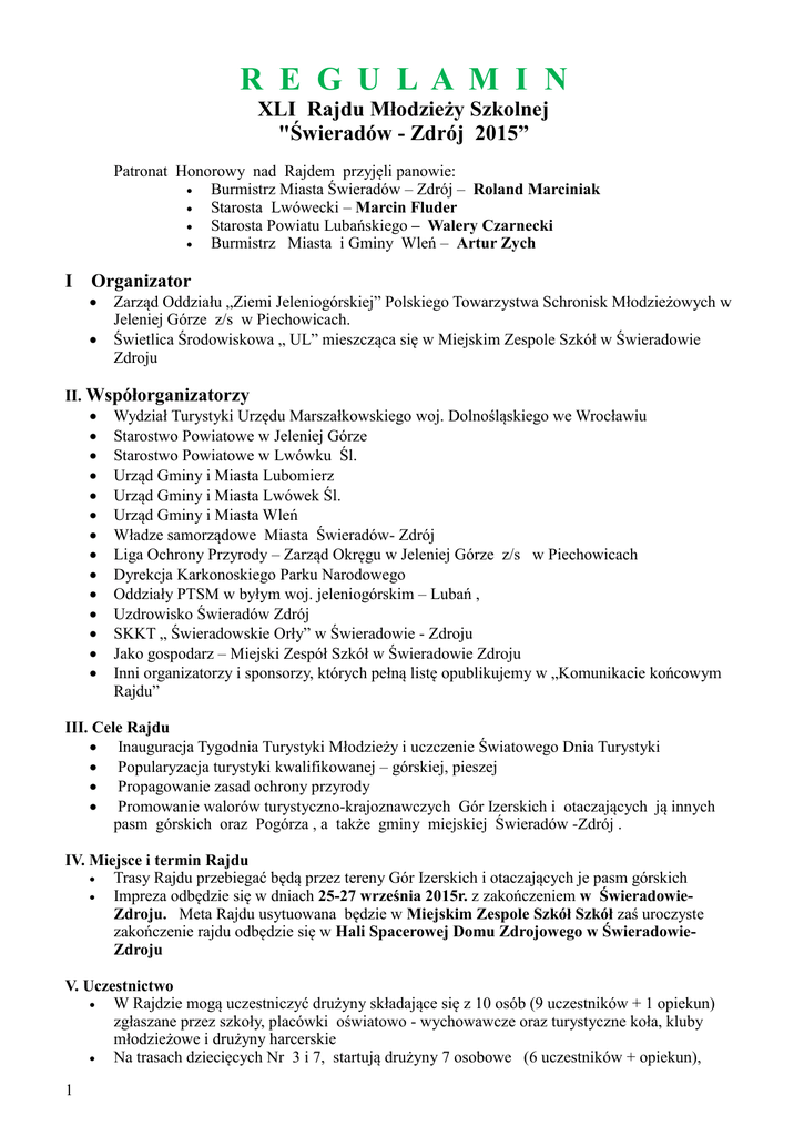 R E G U LA M I N XLI Rajdu Młodzieży Szkolnej "Świeradów - Zdrój 2015” Patronat Honorowy nad Rajdem przyjęli panowie: Burmistrz Miasta Świeradów – Zdrój – Roland Marciniak Starosta Lwówecki – Marcin Fluder Starosta Powiatu Lubańskiego – Walery Czarnecki Burmistrz Miasta i Gminy Wleń – Artur Zych I Organizator Zarząd Oddziału „Ziemi Jeleniogórskiej” Polskiego Towarzystwa Schronisk Młodzieżowych w Jeleniej Górze z/s w Piechowicach. Świetlica Środowiskowa „ UL” mieszcząca się w Miejskim Zespole Szkół w Świeradowie Zdroju II. Współorganizatorzy Wydział Turystyki Urzędu Marszałkowskiego woj. Dolnośląskiego we Wrocławiu Starostwo Powiatowe w Jeleniej Górze Starostwo Powiatowe w Lwówku Śl. Urząd Gminy i Miasta Lubomierz Urząd Gminy i Miasta Lwówek Śl. Urząd Gminy i Miasta Wleń Władze samorządowe Miasta Świeradów- Zdrój Liga Ochrony Przyrody – Zarząd Okręgu w Jeleniej Górze z/s w Piechowicach Dyrekcja Karkonoskiego Parku Narodowego Oddziały PTSM w byłym woj. jeleniogórskim – Lubań , Uzdrowisko Świeradów Zdrój SKKT „ Świeradowskie Orły” w Świeradowie - Zdroju Jako gospodarz – Miejski Zespół Szkół w Świeradowie Zdroju Inni organizatorzy i sponsorzy, których pełną listę opublikujemy w „Komunikacie końcowym Rajdu” III. Cele Rajdu Inauguracja Tygodnia Turystyki Młodzieży i uczczenie Światowego Dnia Turystyki Popularyzacja turystyki kwalifikowanej – górskiej, pieszej Propagowanie zasad ochrony przyrody Promowanie walorów turystyczno-krajoznawczych Gór Izerskich i otaczających ją innych pasm górskich oraz Pogórza , a także gminy miejskiej Świeradów -Zdrój . IV. Miejsce i termin Rajdu Trasy Rajdu przebiegać będą przez tereny Gór Izerskich i otaczających je pasm górskich Impreza odbędzie się w dniach 25-27 września 2015r. z zakończeniem w ŚwieradowieZdroju. Meta Rajdu usytuowana będzie w Miejskim Zespole Szkół Szkół zaś uroczyste zakończenie rajdu odbędzie się w Hali Spacerowej Domu Zdrojowego w ŚwieradowieZdroju V. Uczestnictwo W Rajdzie mogą uczestniczyć drużyny składające się z 10 osób (9 uczestników + 1 opiekun) zgłaszane przez szkoły, placówki oświatowo - wychowawcze oraz turystyczne koła, kluby młodzieżowe i drużyny harcerskie Na trasach dziecięcych Nr 3 i 7, startują drużyny 7 osobowe (6 uczestników + opiekun), 1 Szkoła , koło, klub z tej samej miejscowości mogą zgłosić na daną trasę maksymalnie tylko 2 drużyny dodatkowe drużyny będzie można zgłosić i zostaną przyjęte tylko w przypadku wolnych miejsc na trasie W imprezie uczestniczą uczniowie szkół podstawowych, gimnazjów, szkół ponadgimnazjalnych (bez policealnych i średnich dla dorosłych) oraz dzieci przedszkolne. Na trasach dziecięcych startują uczniowie kl. II-VI szkół podstawowych. Drużyny bez opiekuna nie będą przyjęte na Rajd Rajd jest imprezą Turystyki kwalifikowanej i dlatego do składu drużyny należy dobrać opiekunów i uczestników z doświadczeniem turystycznym. Ubezpieczenie w ramach powszechnego ubezpieczenia szkolnego. VI. Współzawodnictwo rajdowe W czasie Rajdu punktuje się: A. Wyposażenie indywidualne i zespołowe B. Postawę na Rajdzie C. Program ogniskowy D. Konkurs krajoznawczy E. Konkurs o ochronie przyrody (trasa ochrony przyrody) F. Konkurs udzielania I pomocy G. Konkurs drużynowe przygotowanie posiłku H. Konkurs „Czyste góry” – wszystkie trasy I . Konkursy na trasie dla przedszkolaków VII. Regulaminy (skrócone) poszczególnych konkursów Wyposażenie indywidualne i zespołowe (łącznie z opiekunem) 1. Strój turystyczny członka drużyny (nakrycie głowy, 2 zmiany obuwia, okrycie przeciwdeszczowe, sweter in.) - 20 pkt. 2. Apteczka (1 na drużynę) - 8 pkt. 3. Latarka (2 na drużynę) - Nie będzie się liczyć latarka w telefonie - 4 pkt. 4. Busola (1 na drużynę ) - 3 pkt. 5. Mapa turystyczna ( 2 na drużynę) Nie będą się liczyć mapy w telefonach - 4 pkt. 6. Garnuszek i niezbędnik (każdy) - 9 pkt. 7. Plecak (każdy) - 9 pkt. 8. Śpiwór bieliźniany wzgl. 2 prześcieradła (poszwa na kołdrę) i powłoczka na poduszkę (każdy) (za wyjątkiem trasy nr. 5) - 9 pkt. 9. Książeczka odznak turystycznych celem dokonania wpisu: GOT, OTP, MOK, TP ,ROK, Przyjaciel Schronisk Młodzieżowych - 9 pkt. Razem 75 pkt. Bardzo mile będzie widziany jednolity , estetyczny i praktyczny strój drużyny. Postawa turystyczna Zachowanie na trasie zgodnie z etyką turystyczną i stosowanie się do poleceń kierownika trasy (Rajdu) Zachowanie się w miejscu noclegu (kultura zachowania się , aktywność w organizowaniu życia towarzyskiego, drobne prace na rzecz schroniska) Razem 50 pkt C. Program ogniskowy Drużyna przygotowuje według swojego uznania różne części programu (piosenka, legenda, skecz, wiersz, gawęda, inscenizacja). Mogą być piosenki i teksty własne zwłaszcza okolicznościowe. Chętnie widziane będą próby wciągania pozostałych drużyn do wspólnej zabawy. Czas prezentacji nie dłuższy niż 15 minut. Oceniany będzie poziom wykonania, treść krajoznawczo - turystyczna, zaangażowanie zespołu. Nie dotyczy przedszkoli. Ocena uznaniowa jury - do 25 pkt 2 D. Konkurs krajoznawczy Tematycznie konkurs obejmuje wiedzę nt: o własnej trasie wędrówki Świeradowie- Zdroju i Górach Izerskich Konkurs rozgrywany będzie podczas wieczornic w dn. 26 IX (sobota) a drużyny reprezentują 3osobowe zespoły występujące jako całość. Punktacja: I miejsce – 50 pkt II – 45 pkt III – 40 pkt IV – 35 V – 30 VI – 25 Literatura: Mapy turystyczne wraz z tekstem na odwrocie, przewodniki dotyczące Sudetów Zachodnich. Przydatne też bywają ekspozycje krajoznawcze w schroniskach. E. Konkurs o ochronie przyrody (tylko na trasie Nr 5) Rozgrywany będzie podczas sobotniej wieczornicy 26 .IX. Drużyny reprezentują 3 osoby ( bez uczestników konkursu krajoznawczego) Tematyka: Zwierzęta i rośliny chronione, gł