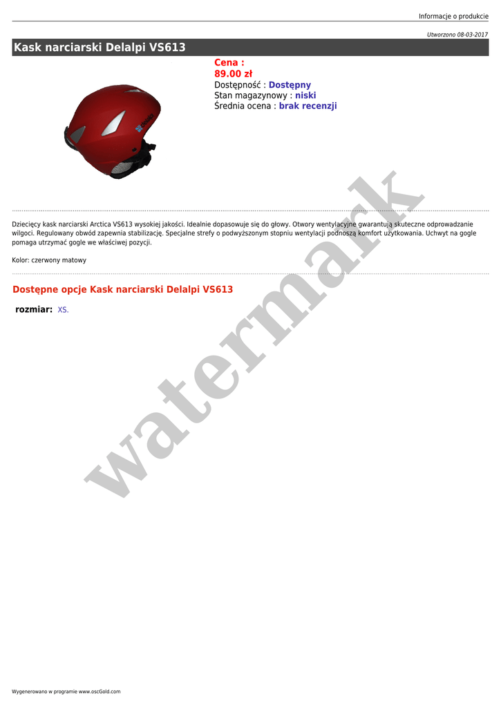 Informacje o produkcie Utworzono 08-03-2017 Kask narciarski Delalpi VS613 Cena : 89.00 zł er m ar k Dostępność : Dostępny Stan magazynowy : niski Średnia ocena : brak recenzji Dziecięcy kask narciarski Arctica VS613 wysokiej jakości. Idealnie dopasowuje się do głowy. Otwory wentylacyjne gwarantują skuteczne odprowadzanie wilgoci. Regulowany obwód zapewnia stabilizację. Specjalne strefy o podwyższonym stopniu wentylacji podnoszą komfort użytkowania. Uchwyt na gogle pomaga utrzymać gogle we właściwej pozycji. Kolor: czerwony matowy Dostępne opcje Kask narciarski Delalpi VS613 w at rozmiar: XS. Wygenerowano w programie www.oscGold.com