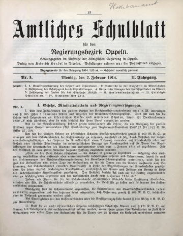 M t l i d p S d i n l b l n t t für ben Kegierungsbezirft Oppeln. üerausgegeben im Suffrage ber königlichen R egierung in Dppeln. V erlag non k e tn r id ) k a n b e l in (Breslau. (Beffellungen nehmen n u r bie ’Pofianffalten entgegen. B e z u g s p r e i s für bert 3 at)rgang 1914 1,8 0 ^ . — <Xr|cf)eint monatlich sroeimal. 2tr» 3» fJHonfag, ben 2. gebruar 1914. II. Oafyrgatig» „XuHalt: I. 1. k r a n f e n o e r f id j e r u n g b e r S e ljre r u n b ß e h r e r tn n c n . 2. U n te rric h t in b e r k u r j f c b r i f t in üDiittclfdjuIen. 3. © e fn h r b u n g b e r S ch u lju g etib burrfj S d ja u fte H u n g e n . 4. k ö rp e r lic h e Ü b u n g e n b e r ÜXolfSfcfjulfinbcr im SBinter. 5. g e f tfe ß u n g b e r S e r i e n f ü r b a 8 S c h u l j a h r 1914/ 15. — II. t ß c r f o u a l n n c h r i c h t e n . — III. © r l e b i g t e © d j u l f t e l l e n . — IV. N i c h t a m t l i c h e r % e i l . 9Zr. l . f ($efe^e, äH in tfte rio le rla ffe m tb ^ e g ie ru ttg ^ u e rfiig u ttg e it. I. üttit bem g n f r a f t t r e t e n beS zm eiten 93uclje8 b er SReidj 8oerficherung 8 o r b n u n g a m 1 . b. 2R. u n te rlie g e n nad) § 1 6 5 g if fe r 5 f ä m t l i d h e S e ljre r u n b E r z ie h e r b e r k r a n f e n o e r f id ) e r u n g 8 pflicht. D i e 8 gilt auch f ü r bie 8 ef|re r u n b S e h r e r in n e n a n ö f f e n t l i c h e n 3 3 o l£ 8 = u n b m i t t l e r e n ( s c h u l e n , fomeit ih r D ie n f tc in f o m m e n 2 5 0 0 J t nicht überfteigt, o b er fie nicht lebiglich f ü r i h r e n 33eruf a u 8 gebilbct m erb en. 9118 in b er 5 3 eru fa u 8 6 ilb u n g ftehenb gelten in öbefo n b e re alle S e h r e r , bie u o r 9 lülegun g b er zmeiten P r ü f u n g gegen S n t g e l t u n t e r r i ^ t e n ( $ g l . S o n b e r b e il a g e zum SRegierung8=9lmt8blatt S t ü c f 2 7 f ü r 1 9 1 2 <5. 3 0 , S if f e r 2 7 , 29). U m f ü r bie ü b rig e n S e h r e r a n öffentlichen S d j u l e n 33erftd)erung8freiheit geinäfe § 1 6 9 SR. 33. 0 . §u er la n g e n u n b ben S c h u lo e rb ä n b e n bie k affe n b e iträ g e 31t e r f p a r e n , em pfieh lt e 8 fich, burch 33efd)luh b er S chul« un te rh a ltu n g ö p flic h tig e n ben S e h r c r n im k r a n f h e i t ß f a l l einen 91nfprudj en tm eb e r a u f k r a n f e n lj ilf e ober au f (Gehalt o b er ähnliche D ienftb e zü g e im an berthalbfachen b e t r a g e be 6 k r a n f e n g e lb e S a u f bie (D au er b e r SRegel« leiftu ngen b e r k r a n f e n f a f f e n (2 6 SBodjen) m it rü cfio irfe n b e r k r a f t 00 m 1. J a n u a r 1 9 1 4 ab 3U3ufiehern, g i t r ben ®efchhtfi ift oont $ e r r n ÜRinifter folgenbe g a f f u n g em pfo hlen m o rb e n : „(Den an b e r (ben) S c h u le (S c h u len ) — bie S c h u le ift g e n a u zu be 3eiihnen — e n b g ü ltig ober einft« m eilig angeftetlten o b e r au ftragß « o b er o ertretu n g ö m eife befdgiftigten S e h r e r n u n b S e h r e ti n n e n , fomeit fie nach ben S e f tim m u n g e n b e r SReich§oerfid)erung 8o r b n u n g b e r k ra tife n u erfid )e ru n g § p flic h t u n te rlie g e n , toirb f ü r ben g a d b e r © r f r a n f u n g oont erften D a g e b er @ rfra ttfu n g ab f ü r bie D a u e r oo n 2 6 Sßochen mof)lroeife nach $ e= ftlm m u n g be§ S d ) u to e r b a n b e 8 etttiueber k ra n £ e n l)ilfe in $ ö l) e b e r SRegelleiftungen b e r k r a n f e n f a f f e n g e m ä h r t ob er f ü r jeben ärztlich befdjeinigten k r a n f f j e itß t a g einfchtiefelid) b e r S o n n « u n b g e f tta g e ein 33etra g in # ö l) e beß anb erthalb fach en k r a n f e n g e lb e ß zugefidjert. D e r ®efd)luf 3 bezieht fid) auch " » f bie fü n ftig an zuftetlenben ob er z« befchäftigenben S e h r f r ä f te u n b f)at rü c fm irfe n b e k r a f t 00 m 1 . g a t t u a r 1 9 1 4 a b ." gn b en t m ir 3 h nen fü r bie S chu loerbän be erforberlidjen 9lbbrücte biefer V erfü g u n g überfenben, erfudjen m ir S i e , bie S d ju loerb än b e alßbalb 3» oeran laffen, bie 33efdjlüffe zu faffen unb fie fobnttn ben kaffen« oorftänben m itzuteilen. (Gleichzeitig finb bie Schuloerbän be anzuraeifen, bie Seljtp erfon en ben kranfen faffen oorftän b en f o f o r t o o r l ä u f i g attzum elben unb ben lepteren babei m itzu teilen, baj) B e fre iu n g gemäj) § 1 6 9 SR. 33. 0 . befdjloffen ober in 9lnfprud) genom m en merben roirb. ® e i S tr e itig fe ite n m it ben kaffenoorftänben über bie 33erfid)erung8pflid)t fomrnt § 4 0 5 91bfap 2 SR. 33. D . Zur 9tnm enbung. II. 9Iudj bie a n n i d f t ö f f e n t l i c h e n S c h u le n befdjäftigten S e h r f r ä f te tö n n e n nach § 1 71 SR. 33. D . au f 9 tn tr a g bc 8 9 lrbeitg eb er8 a l 8 o erfid je ru n g ß fre i e r f l ä r t m e rb e n , toen n ih n e n gegen ih re 9 lrb eitg eb e r im g a l l ih r e r ( S rfra n fttn g oont erften D o g e b e r ( Ś r fr n n f u n g f ü r bie D a u e r oon 2 6 Söodjen ein 9ln fprud) m inbeftenß en tm eb er 14 a u f Stvnnfcnlfitfe in .föölje bev SRegelleiftungen b er S hranfentnffen (§ 179 SR. V . O .) ober f ü r bie gleiche ^ e i t auf © e lja lt, SRuljegelb, S Ja rte g e lb ober ähnlidje V eßüg e im a n b e rth a lb fa d je n 'B etra g e beß SfranEengelbeß (§ 182) geiuührleiftet m irb , o b er roenn fie (ebiglid) f ü r ih re n V e r u f ouß gebilbet loerben. O ie b er oberften V erro a ltu n g ß « bewürbe o o rb e h a lte n e E ntfd fe ib u n g ü b e r foldje E in träg e ift oon ifjr g em äh § 1 1 0 SR. V . O . u n ß ü b e r tr a g e n roorben, fofern bie betreffenben S c h u le n u n t e r e r 9luffid)t u n te rfte lje n ; foioeit bie S c h u le n bem Sßrooinßialfchul« fo ß e g iu m u nte rfte flt finb, ift biefem bie (Sntfdjeibung ü b e r tr a g e n roorben. d e r a r t i g e Einträge finb u n ß burch 3 b * e £)aiib einßureid)en. O n b e i ift oon bem nnterljaltun gßp flicbtigen A r tig e r b er S e ljra n fta lt in 