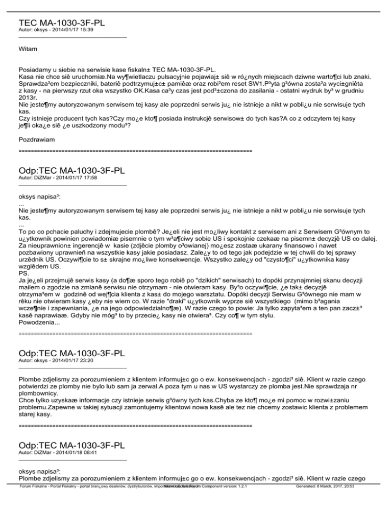 TEC MA-1030-3F-PL Autor: oksys - 2014/01/17 15:39 _____________________________________ Witam Posiadamy u siebie na serwisie kase fiskaln± TEC MA-1030-3F-PL. Kasa nie chce siê uruchomiæ.Na wy¶wietlaczu pulsacyjnie pojawiaj± siê w ró¿nych miejscach dziwne warto¶ci lub znaki. Sprawdza³em bezpieczniki, bateriê podtrzymuj±c± pamiêæ oraz robi³em reset SW1.P³yta g³ówna zosta³a wyci±gniêta z kasy - na pierwszy rzut oka wszystko OK.Kasa ca³y czas jest pod³±czona do zasilania - ostatni wydruk by³ w grudniu 2013r. Nie jeste¶my autoryzowanym serwisem tej kasy ale poprzedni serwis ju¿ nie istnieje a nikt w pobli¿u nie serwisuje tych kas. Czy istnieje producent tych kas?Czy mo¿e kto¶ posiada instrukcjê serwisow± do tych kas?A co z odczytem tej kasy je¶li oka¿e siê ¿e uszkodzony modu³? Pozdrawiam ============================================================================ Odp:TEC MA-1030-3F-PL Autor: DiZMar - 2014/01/17 17:58 _____________________________________ oksys napisa³: ... Nie jeste¶my autoryzowanym serwisem tej kasy ale poprzedni serwis ju¿ nie istnieje a nikt w pobli¿u nie serwisuje tych kas. ... To po co pchacie paluchy i zdejmujecie plombê? Je¿eli nie jest mo¿liwy kontakt z serwisem ani z Serwisem G³ównym to u¿ytkownik powinien powiadomiæ pisemnie o tym w³a¶ciwy sobie US i spokojnie czekaæ na pisemn± decyzjê US co dalej. Za nieuprawnion± ingerencjê w kasie (zdjêcie plomby o³owianej) mo¿esz zostaæ ukarany finansowo i nawet pozbawiony uprawnieñ na wszystkie kasy jakie posiadasz. Zale¿y to od tego jak podejdzie w tej chwili do tej sprawy urzêdnik US. Oczywi¶cie to s± skrajne mo¿liwe konsekwencje. Wszystko zale¿y od "czysto¶ci" u¿ytkownika kasy wzglêdem US. PS. Ja je¿eli przejmujê serwis kasy (a do¶æ sporo tego robiê po "dzikich" serwisach) to dopóki przynajmniej skanu decyzji mailem o zgodzie na zmianê serwisu nie otrzymam - nie otwieram kasy. By³o oczywi¶cie, ¿e tak± decyzjê otrzyma³em w godzinê od wej¶cia klienta z kas± do mojego warsztatu. Dopóki decyzji Serwisu G³ównego nie mam w rêku nie otwieram kasy ¿eby nie wiem co. W razie "draki" u¿ytkownik wyprze siê wszystkiego (mimo b³agania wcze¶nie i zapewniania, ¿e na jego odpowiedzialno¶æ). W razie czego to powie: Ja tylko zapyta³em a ten pan zacz±³ kasê naprawiaæ. Gdyby nie móg³ to by przecie¿ kasy nie otwiera³. Czy co¶ w tym stylu. Powodzenia... ============================================================================ Odp:TEC MA-1030-3F-PL Autor: oksys - 2014/01/17 23:20 _____________________________________ Plombe zdjelismy za porozumieniem z klientem informuj±c go o ew. konsekwencjach - zgodzi³ siê. Klient w razie czego potwierdzi ze plomby nie bylo lub sam ja zerwal.A poza tym u nas w US wystarczy ze plomba jest.Nie sprawdzaja nr plombownicy. Chce tylko uzyskaæ informacje czy istnieje serwis g³ówny tych kas.Chyba ze kto¶ mo¿e mi pomoc w rozwi±zaniu problemu.Zapewne w takiej sytuacji zamontujemy klientowi nowa kasê ale tez nie chcemy zostawic klienta z problemem starej kasy. ============================================================================ Odp:TEC MA-1030-3F-PL Autor: DiZMar - 2014/01/18 08:41 _____________________________________ oksys napisa³: Plombe zdjelismy za porozumieniem z klientem informuj±c go o ew. konsekwencjach - zgodzi³ siê. Klient w razie czego Forum Fiskalne - Portal Fiskalny - portal bran¿owy dealerów, dystrybutorów, importerów MamboBoard kas fiskalnych Forum Component version: 1.2.1 Generated: 8 March, 2017, 20:53 potwierdzi ze plomby nie bylo lub sam ja zerwal.A poza tym u nas w US wystarczy ze plomba jest.Nie sprawdzaja nr plombownicy. ... U mnie jeszcze urzêdnik US w ogóle nie sprawdza³ plomby. Raz urzêdniczka kiedy¶ (ok.roku 2000) zapyta³a mnie czy jest plomba. Ja z lekk± ironi± odpowiedzia³em pytaniem: A czyja ta plomba powinna byæ? Odpowiedzia³a: Pana i by³o po rozmowie. W Twoim przypadku potwierdza siê mój scenariusz. Klient godzi siê na ewentualne konsekwencje. Gdyby "przypadkiem" US zrobi³ z tego "aferê" to": Po pierwsze: jak wspomina³em wy¿ej klient wszystkiego wyprze siê. Po drugie: gdyby nawet potwierdzi³ to nie upowa¿nia Ciebie do zdjêcia plomb. Po trzecie: zamiast pomóc klientowi (poradziæ aby o zaistnia³ej sytuacji powiadomiæ "swój" US) skomplikowa³e¶ mu i sobie sytuacjê. Zrobi³e¶ mu nied¼wiedzi± przys³ugê. Po czwarte: je¿eli znajdzie siê autoryzowany serwis tej kasy (lub inny który podejmie siê naprawy i odczytu tej kasy) i otrzyma pozwolenie na interwencjê od Serwisu G³ównego lub MF (tak to nie pomy³ka, od Ministerstwa Finansów - tak jest w przypadku kas DataProcess przy braku Serwisu G³ównego; patrz Pismo MF podpisane przez Dyrektora Departamentu, nr PT7/8183136/498/JDI/13/RD-78161/2013 z lipca 2013 roku.) to te¿ mo¿e zrobiæ "aferê" chc±c wyja¶niæ dlaczego w kasie brak plomby serwisanta wpisanego do ksi±¿ki kasy. Oj mo¿e byæ smród o mo¿e. Je¿eli sprawa trafi do urzêdnika US chc±cego wykazaæ siê czujno¶ci± to mo¿e byæ nie weso³o dla Ciebie i u¿ytkownika kasy. Oby rozesz³o siê Wam to po ko¶ciach. ============================================================================ Odp:TEC MA-1030-3F-PL Autor: zetde - 2014/01/18 12:47 _____________________________________ Niech ten w±tek bêdzie przestrog± dla u¿ytkowników kas - którzy tu równie¿ zagl±daj±. Kupuj±c kasy wynalazki, wprowadzone na rynek przez jaki¶ cudaków zawsze ryzykuje siê takie k³opoty. Oszczêdno¶æ przy zakupie taniej kasy zwykle koñczy siê w koñcowym rachunku wiêkszymi wydatkami na serwis (o ile w ogóle bêdzie serwis dostêpny) oraz niepotrzebn± bieganin± i nerwami. I to wszystko dla 200-300 z³ oszczêdno¶ci przy zakupie. Starzy ludzie nie bez powodu mawiali - "nie staæ mnie na tanie rzeczy"... ============================================================================ Odp:TEC MA-1030-3F-PL Autor: DiZMar 