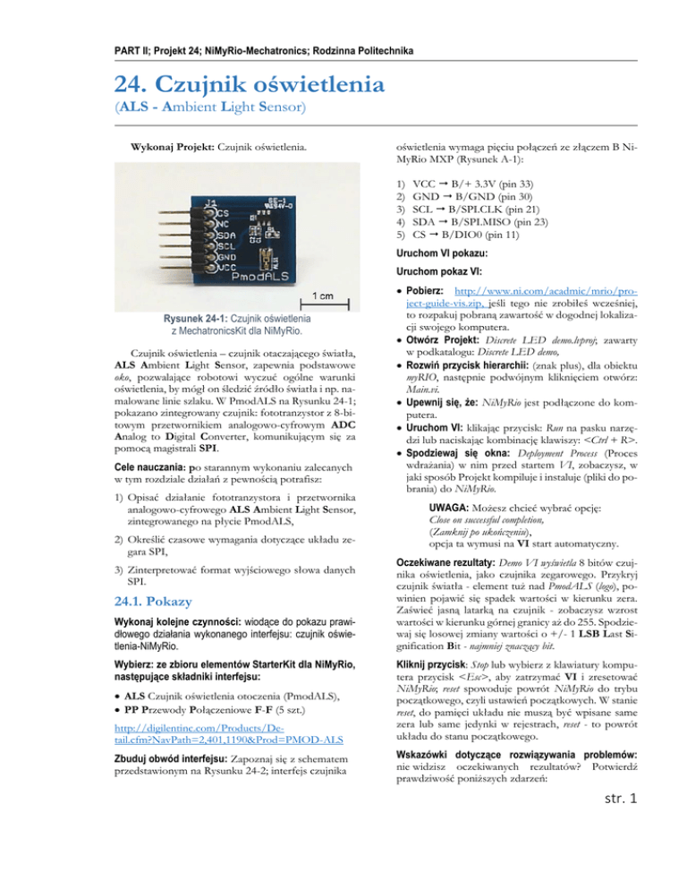 PART II; Projekt 24; NiMyRio-Mechatronics; Rodzinna Politechnika 24. Czujnik oświetlenia (ALS - Ambient Light Sensor) Wykonaj Projekt: Czujnik oświetlenia. oświetlenia wymaga pięciu połączeń ze złączem B NiMyRio MXP (Rysunek A-1): 1) 2) 3) 4) 5) VCC B/+ 3.3V (pin 33) GND B/GND (pin 30) SCL B/SPI.CLK (pin 21) SDA B/SPI.MISO (pin 23) CS B/DIO0 (pin 11) Uruchom VI pokazu: Uruchom pokaz VI: Rysunek 24-1: Czujnik oświetlenia z MechatronicsKit dla NiMyRio. Czujnik oświetlenia – czujnik otaczającego światła, ALS Ambient Light Sensor, zapewnia podstawowe oko, pozwalające robotowi wyczuć ogólne warunki oświetlenia, by mógł on śledzić źródło światła i np. namalowane linie szlaku. W PmodALS na Rysunku 24-1; pokazano zintegrowany czujnik: fototranzystor z 8-bitowym przetwornikiem analogowo-cyfrowym ADC Analog to Digital Converter, komunikującym się za pomocą magistrali SPI. Cele nauczania: po starannym wykonaniu zalecanych w tym rozdziale działań z pewnością potrafisz: 1) Opisać działanie fototranzystora i przetwornika analogowo-cyfrowego ALS Ambient Light Sensor, zintegrowanego na płycie PmodALS, 2) Określić czasowe wymagania dotyczące układu zegara SPI, 3) Zinterpretować format wyjściowego słowa danych SPI. 24.1. Pokazy Wykonaj kolejne czynności: wiodące do pokazu prawidłowego działania wykonanego interfejsu: czujnik oświetlenia-NiMyRio. Wybierz: ze zbioru elementów StarterKit dla NiMyRio, następujące składniki interfejsu: ALS Czujnik oświetlenia otoczenia (PmodALS), PP Przewody Połączeniowe F-F (5 szt.) http://digilentinc.com/Products/Detail.cfm?NavPath=2,401,1190&Prod=PMOD-ALS Zbuduj obwód interfejsu: Zapoznaj się z schematem przedstawionym na Rysunku 24-2; interfejs czujnika Pobierz: http://www.ni.com/acadmic/mrio/project-guide-vis.zip, jeśli tego nie zrobiłeś wcześniej, to rozpakuj pobraną zawartość w dogodnej lokalizacji swojego komputera. Otwórz Projekt: Discrete LED demo.lvproj; zawarty w podkatalogu: Discrete LED demo, Rozwiń przycisk hierarchii: (znak plus), dla obiektu myRIO, następnie podwójnym kliknięciem otwórz: Main.vi. Upewnij się, że: NiMyRio jest podłączone do komputera. Uruchom VI: klikając przycisk: Run na pasku narzędzi lub naciskając kombinację klawiszy: <Ctrl + R>. Spodziewaj się okna: Deployment Process (Proces wdrażania) w nim przed startem VI, zobaczysz, w jaki sposób Projekt kompiluje i instaluje (pliki do pobrania) do NiMyRio. UWAGA: Możesz chcieć wybrać opcję: Close on successful completion, (Zamknij po ukończeniu), opcja ta wymusi na VI start automatyczny. Oczekiwane rezultaty: Demo VI wyświetla 8 bitów czujnika oświetlenia, jako czujnika zegarowego. Przykryj czujnik światła - element tuż nad PmodALS (logo), powinien pojawić się spadek wartości w kierunku zera. Zaświeć jasną latarką na czujnik - zobaczysz wzrost wartości w kierunku górnej granicy aż do 255. Spodziewaj się losowej zmiany wartości o +/- 1 LSB Last Signification Bit - najmniej znaczący bit. Kliknij przycisk: Stop lub wybierz z klawiatury komputera przycisk <Esc>, aby zatrzymać VI i zresetować NiMyRio; reset spowoduje powrót NiMyRio do trybu początkowego, czyli ustawień początkowych. W stanie reset, do pamięci układu nie muszą być wpisane same zera lub same jedynki w rejestrach, reset - to powrót układu do stanu początkowego. Wskazówki dotyczące rozwiązywania problemów: nie widzisz oczekiwanych rezultatów? Potwierdź prawdziwość poniższych zdarzeń: str. 1 LED wskazująca poprawność zasilania w NiMyRio świeci jaskrawym światłem, Przycisk Run, na pasku narzędzi jest czarny, co oznacza, że VI jest w RunMode - trybie pracy, Wybór styków złącza B NiMyRioMXP, Dwukrotnie i dokładnie! Popraw kontakty zacisków złącza SPI, sprawdź połączenia i upewnij się, że urządzenie jest podłączone do MISO wejścia SPI wyjściowe z fototranzystora na cyfrowe sygnały w formacie słów 8-bitowych i przesyła je, jako wartości pomiarowe poprzez SPI Serial Peripheral Interface. Uważnie przestudiuj wideo: Ambient Light Sensor Interfacing Theory (07:37) http://youtu.be/zKnn1SskqRQ Rysunek 24-2: Układ pokazowy czujnika oświetlenia, schemat ideowy, proponowane połączenia do złącza B NiMyRio_Mxp. NiMyRio i do czujnika światła otoczenia SDA, wyjścia i wyjścia cyfrowego DIO0 wyboru układu, 24.2. Teoria interfejsu Obwód interfejsu: Płyta Digilent PmodALS łączy fototranzystor i TEMT6000X01 Vishay Semiconductors z przetwornikiem analogowo-cyfrowym ADC Texas Instruments ADC081S021. ADC przetwarza napięcie NiMyRio Project Essential Guide Ambient Light sensor - Digilent PmodALS - Functionality and features - SPI and chip select timing Dowiesz się jak działają czujniki oświetlenia, poznasz teorię magistrali SPI, sposoby i postulaty przy wyborze str. 2 czasów i odpowiedniej konfiguracji SPI Express VI do odczytu pomiarów z czujników, 3) Przetwórz stałą Wait do sterowania z FrontPanel, eksperymentuj z różnymi czasami pętli. Uważnie przestudiuj wideo: SPI Serial Communication (07:01) 24.4. Pomysły integracji Projektu http://youtu.be/GaXtDamw5As NiMyRio Project Essential Guide SPI Serial Communication - SPI express VI options - Terminology - Signaling waveforms Zrozumiesz, jak opcje konfiguracyjne SPI Express VI wpływają na przebiegi sygnałów pomiędzy nadajnikami i odbiornikami SPI. W szczególności, (patrz omówienie czas: 04: 29), zrozumiesz SPI Express VI Advanced Options - opcje zaawansowane dla fazy zegara i polaryzacji; układ ADC081S021 wymaga HighTrailing fazy zegara zbocza impulsu i polaryzacji. Programowanie LabView: Uważnie przestudiuj wideo: „SPI” Express VI(05:50) http://youtu.be/S7KkTeMfmc8 NiMyRio Project Essential Guide SPI Express VI - Transmit and receive integer arrays and charcter strings Wiesz, jak stosować czujnik poziomu światła otaczającego, możesz rozważyć integrację z innymi urządzeniami w celu stworzenia kompletnego sys