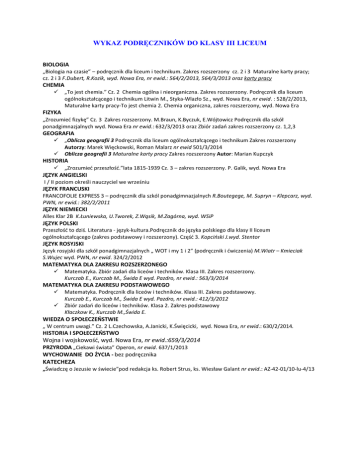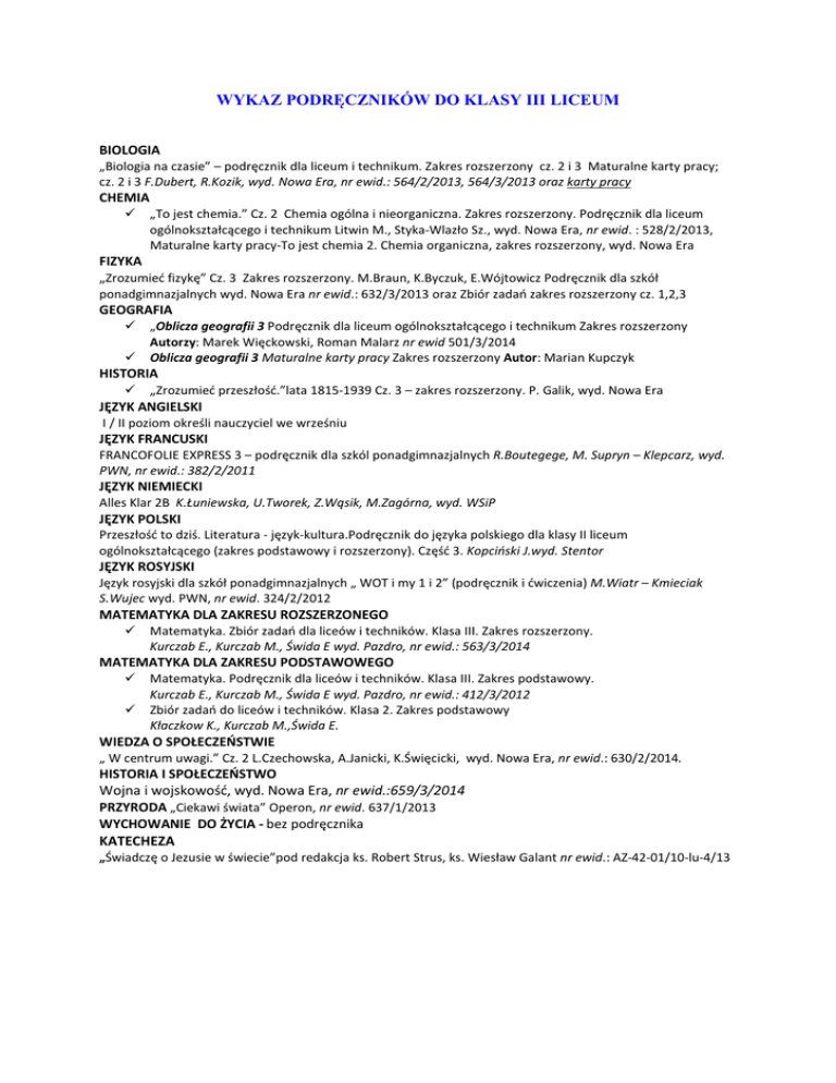WYKAZ PODRĘCZNIKÓW DO KLASY III LICEUM BIOLOGIA „Biologia na czasie” – podręcznik dla liceum i technikum. Zakres rozszerzony cz. 2 i 3 Maturalne karty pracy; cz. 2 i 3 F.Dubert, R.Kozik, wyd. Nowa Era, nr ewid.: 564/2/2013, 564/3/2013 oraz karty pracy CHEMIA „To jest chemia.” Cz. 2 Chemia ogólna i nieorganiczna. Zakres rozszerzony. Podręcznik dla liceum ogólnokształcącego i technikum Litwin M., Styka-Wlazło Sz., wyd. Nowa Era, nr ewid. : 528/2/2013, Maturalne karty pracy-To jest chemia 2. Chemia organiczna, zakres rozszerzony, wyd. Nowa Era FIZYKA „Zrozumieć fizykę” Cz. 3 Zakres rozszerzony. M.Braun, K.Byczuk, E.Wójtowicz Podręcznik dla szkół ponadgimnazjalnych wyd. Nowa Era nr ewid.: 632/3/2013 oraz Zbiór zadań zakres rozszerzony cz. 1,2,3 GEOGRAFIA „Oblicza geografii 3 Podręcznik dla liceum ogólnokształcącego i technikum Zakres rozszerzony Autorzy: Marek Więckowski, Roman Malarz nr ewid 501/3/2014 Oblicza geografii 3 Maturalne karty pracy Zakres rozszerzony Autor: Marian Kupczyk HISTORIA „Zrozumieć przeszłość.”lata 1815-1939 Cz. 3 – zakres rozszerzony. P. Galik, wyd. Nowa Era JĘZYK ANGIELSKI I / II poziom określi nauczyciel we wrześniu JĘZYK FRANCUSKI FRANCOFOLIE EXPRESS 3 – podręcznik dla szkól ponadgimnazjalnych R.Boutegege, M. Supryn – Klepcarz, wyd. PWN, nr ewid.: 382/2/2011 JĘZYK NIEMIECKI Alles Klar 2B K.Łuniewska, U.Tworek, Z.Wąsik, M.Zagórna, wyd. WSiP JĘZYK POLSKI Przeszłość to dziś. Literatura - język-kultura.Podręcznik do języka polskiego dla klasy II liceum ogólnokształcącego (zakres podstawowy i rozszerzony). Część 3. Kopciński J.wyd. Stentor JĘZYK ROSYJSKI Język rosyjski dla szkół ponadgimnazjalnych „ WOT i my 1 i 2” (podręcznik i ćwiczenia) M.Wiatr – Kmieciak S.Wujec wyd. PWN, nr ewid. 324/2/2012 MATEMATYKA DLA ZAKRESU ROZSZERZONEGO Matematyka. Zbiór zadań dla liceów i techników. Klasa III. Zakres rozszerzony. Kurczab E., Kurczab M., Świda E wyd. Pazdro, nr ewid.: 563/3/2014 MATEMATYKA DLA ZAKRESU PODSTAWOWEGO Matematyka. Podręcznik dla liceów i techników. Klasa III. Zakres podstawowy. Kurczab E., Kurczab M., Świda E wyd. Pazdro, nr ewid.: 412/3/2012 Zbiór zadań do liceów i techników. Klasa 2. Zakres podstawowy Kłaczkow K., Kurczab M.,Świda E. WIEDZA O SPOŁECZEŃSTWIE „ W centrum uwagi.” Cz. 2 L.Czechowska, A.Janicki, K.Święcicki, wyd. Nowa Era, nr ewid.: 630/2/2014. HISTORIA I SPOŁECZEŃSTWO Wojna i wojskowość, wyd. Nowa Era, nr ewid.:659/3/2014 PRZYRODA „Ciekawi świata” Operon, nr ewid. 637/1/2013 WYCHOWANIE DO ŻYCIA - bez podręcznika KATECHEZA „Świadczę o Jezusie w świecie”pod redakcja ks. Robert Strus, ks. Wiesław Galant nr ewid.: AZ-42-01/10-lu-4/13