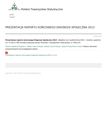 Polskie Towarzystwo Statystyczne AAA English PREZENTACJA RAPORTU KOŃCOWEGO DIAGNOZA SPOŁECZNA 2013 30.09.2013 Prezentacja raportu końcowego Diagnoza Społeczna 2013 odbędzie się 2 października 2013 r. (środa) o godzinie 14.00 w sali nr 305 (III piętro),Wyższej Szkoły Finansów i Zarządzania w Warszawie, ul. Pawia 55. Pobierz Adobe® Reader® Pobierz Word Viewer Pobierz Excel Viewer Pobierz PowerPoint Viewer Pobierz darmowe oprogramowanie do przeglądania plików: Prezentacja raportu końcowego Diagnoza Społeczna 2013 0.02 MB Do góry Copyright © 2017 Polskie Towarzystwo Statystyczne