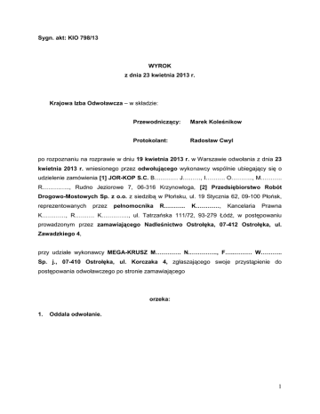 Sygn. akt: KIO 798/13 WYROK z dnia 23 kwietnia 2013 r. Krajowa Izba Odwoławcza – w składzie: Przewodniczący: Marek Koleśnikow Protokolant: Radosław Cwyl po rozpoznaniu na rozprawie w dniu 19 kwietnia 2013 r. w Warszawie odwołania z dnia 23 kwietnia 2013 r. wniesionego przez odwołującego wykonawcy wspólnie ubiegający się o udzielenie zamówienia [1] JOR-KOP S.C. B………… J………, I………. O……….., M……….. R………….., Rudno Jeziorowe 7, 06-316 Krzynowłoga, [2] Przedsiębiorstwo Robót Drogowo-Mostowych Sp. z o.o. z siedzibą w Płońsku, ul. 19 Stycznia 62, 09-100 Płońsk, reprezentowanych przez pełnomocnika R……….. K…………, Kancelaria Prawna K…………, R………. K………….., ul. Tatrzańska 111/72, 93-279 Łódź, w postępowaniu prowadzonym przez zamawiającego Nadleśnictwo Ostrołęka, 07-412 Ostrołęka, ul. Zawadzkiego 4, przy udziale wykonawcy MEGA-KRUSZ M…………. N.………….., F…..……… W……….. Sp. j., 07-410 Ostrołęka, ul. Korczaka 4, zgłaszającego swoje przystąpienie do postępowania odwoławczego po stronie zamawiającego orzeka: 1. Oddala odwołanie. 1 2. Kosztami postępowania obciąŜa odwołującego wykonawcy wspólnie ubiegający się o udzielenie zamówienia [1] JOR-KOP S.C. B……….. J…………, I………… O………., M……….. R…………., Rudno Jeziorowe 7, 06-316 Krzynowłoga, [2] Przedsiębiorstwo Robót Drogowo-Mostowych Sp. z o.o. z siedzibą w Płońsku, ul. 19 Stycznia 62, 09-100 Płońsk, reprezentowanych przez pełnomocnika R……….. K………….., Kancelaria Prawna K…………., R…………. K…………., ul. Tatrzańska 111/72, 93-279 Łódź i: 1) zalicza w poczet kosztów postępowania odwoławczego kwotę 10 000 zł 00 gr (słownie: dziesięć tysięcy złotych zero groszy) uiszczoną przez odwołującego wykonawcy wspólnie ubiegający się o udzielenie zamówienia [1] JOR-KOP S.C. B……….. Jeziorowe J…………., 7, I………. 06-316 O…………, Krzynowłoga, M………… [2] R………….., Przedsiębiorstwo Rudno Robót Drogowo-Mostowych Sp. z o.o. z siedzibą w Płońsku, ul. 19 Stycznia 62, 09-100 Płońsk, reprezentowanych przez pełnomocnika R……….. K……….., Kancelaria Prawna K………….., R……….. K……………, ul. Tatrzańska 111/72, 93-279 Łódź tytułem wpisu od odwołania. Stosownie do art. 198a i 198b ustawy z dnia 29 stycznia 2004 r. – Prawo zamówień publicznych (Dz. U. z 2010 r. Nr 113, poz. 759, Nr 161, poz. 1078 i Nr 182, poz. 1228, z 2011 r. Nr 5, poz. 13, Nr 28, poz. 143, Nr 87, poz. 484, Nr 234, poz. 1386 i Nr 240, poz. 1429 oraz z 2012 r. poz. 769, poz. 951, poz. 1101 i 1529) na niniejszy wyrok – w terminie 7 dni od dnia jego doręczenia – przysługuje skarga za pośrednictwem Prezesa Krajowej Izby Odwoławczej do Sądu Okręgowego w Ostrołęce. Przewodniczący: ……………………………… Sygn. akt: KIO 798/13 Uzasadnienie Zamawiający Państwowe Gospodarstwo Leśne Lasy Państwowe Nadleśnictwo Ostrołęka, ul. Zawadzkiego 4, 07-412 Ostrołęka wszczął postępowanie w trybie przetargu nieograniczonego pod nazwą »Przebudowa leśnych dróg poŜarowych na terenie Nadleśnictwa Ostrołęka«. Zamawiający zamieścił ogłoszenie o zamówieniu w Biuletynie Zamówień Publicznych 19.02.2013 r. poz. 69116. Postępowanie jest prowadzone zgodnie z przepisami ustawy z dnia 29 stycznia 2004 r. – Prawo zamówień publicznych (Dz. U. z 2010 r. Nr 113, poz. 759, Nr 161, poz. 1078 i Nr 182, poz. 1228, z 2011 r. Nr 5, poz. 13, Nr 28, poz. 143, Nr 87, poz. 484, Nr 234, poz. 1386 i Nr 240, poz. 1429 oraz z 2012 r. poz. 769, poz. 951, poz. 1101 i 1529) zwanej dalej w skrócie Pzp lub ustawą bez bliŜszego określenia. Zamawiający zawiadomił 02.04.2013 r. o: 1) wyborze najkorzystniejszej oferty wykonawcy Mega-Krusz M………… N……………, F……….. W…………… sp.j. ul. Korczaka 4, 07-410 Ostrołęka; 2) odrzuceniu oferty wykonawców wspólnie ubiegających się o udzielenie zamówienia [1] JOR-KOP S.C. B……….. J…………, I……….. O…………, M………. R……………, Rudno Jeziorowe 7, 06-316 Krzynowłoga, [2] Przedsiębiorstwo Robót Drogowo-Mostowych Sp. z o.o. z siedzibą w Płońsku, ul. 19 Stycznia 62, 09-100 Płońsk, reprezentowanych przez pełnomocnika R…………. K…………, Kancelaria Prawna K…………, R………… K…………, ul. Tatrzańska 111/72, 93-279 Łódź, gdyŜ: a) treść oferty nie odpowiada treści specyfikacji – art. 89 ust. 1 pkt 2 Pzp – wykonawca zaoferował do górnej warstwy ilości materiałów na grubość 7 cm zamiast na 10 cm, b) złoŜenie oferty stanowi czyn nieuczciwej konkurencji – art. 89 ust. 1 pkt 3 Pzp – wykonawca zaoferował zastosowanie mniejszej ilości materiałów i robocizny, co spowodowało zaniŜenie ceny o 300 000 zł, bo zamawiający uznał, Ŝe nierzetelne wyliczenie ceny ofertowej jest sprzeczne z zasadami współŜycia społecznego. Wykonawcy wspólnie ubiegający się o udzielenie zamówienia [1] JOR-KOP S.C. B……….. J…………., I……….. O……….., M……….. R…………., Rudno Jeziorowe 7, 06316 Krzynowłoga, [2] Przedsiębiorstwo Robót Drogowo-Mostowych Sp. z o.o. z siedzibą w Płońsku, ul. 19 Stycznia 62, 09-100 Płońsk, reprezentowanych przez pełnomocnika R………… K…………, Kancelaria Prawna K…………, R………. K…………, ul. Tatrzańska 111/72, 93-279 Łódź, zgodnie z art. 182 ust. 1 pkt 2 Pzp, wnieśli 08.04.2013 r. (poniedziałek) do Prezesa KIO odwołanie na: 1) dokonanie czynności wyboru, jako najkorzystniejszej, oferty wykonawcy MEG-KRUSZ M………… N…………., F……….. W………….. Spółka Jawna; 2) odrzucenie oferty odwołującego i zaniechanie wyboru, jako najkorzystniejszej oferty odwołującego. Zdaniem odwołującego zamawiający naruszył: 1) art. 7 ust. 1 i 3 Pzp; 2) art. 89 ust. 1 pkt 