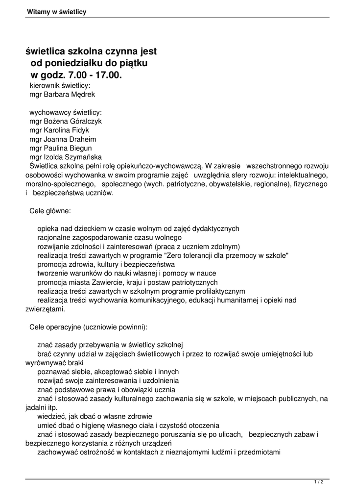 Witamy w świetlicy świetlica szkolna czynna jest od poniedziałku do piątku w godz. 7.00 - 17.00. kierownik świetlicy: mgr Barbara Mędrek wychowawcy świetlicy: mgr Bożena Góralczyk mgr Karolina Fidyk mgr Joanna Draheim mgr Paulina Biegun mgr Izolda Szymańska Świetlica szkolna pełni rolę opiekuńczo-wychowawczą. W zakresie wszechstronnego rozwoju osobowości wychowanka w swoim programie zajęć uwzględnia sfery rozwoju: intelektualnego, moralno-społecznego, społecznego (wych. patriotyczne, obywatelskie, regionalne), fizycznego i bezpieczeństwa uczniów. Cele główne: opieka nad dzieckiem w czasie wolnym od zajęć dydaktycznych racjonalne zagospodarowanie czasu wolnego rozwijanie zdolności i zainteresowań (praca z uczniem zdolnym) realizacja treści zawartych w programie "Zero tolerancji dla przemocy w szkole" promocja zdrowia, kultury i bezpieczeństwa tworzenie warunków do nauki własnej i pomocy w nauce promocja miasta Zawiercie, kraju i postaw patriotycznych realizacja treści zawartych w szkolnym programie profilaktycznym realizacja treści wychowania komunikacyjnego, edukacji humanitarnej i opieki nad zwierzętami. Cele operacyjne (uczniowie powinni): znać zasady przebywania w świetlicy szkolnej brać czynny udział w zajęciach świetlicowych i przez to rozwijać swoje umiejętności lub wyrównywać braki poznawać siebie, akceptować siebie i innych rozwijać swoje zainteresowania i uzdolnienia znać podstawowe prawa i obowiązki ucznia znać i stosować zasady kulturalnego zachowania się w szkole, w miejscach publicznych, na jadalni itp. wiedzieć, jak dbać o własne zdrowie umieć dbać o higienę własnego ciała i czystość otoczenia znać i stosować zasady bezpiecznego poruszania się po ulicach, bezpiecznych zabaw i bezpiecznego korzystania z różnych urządzeń zachowywać ostrożność w kontaktach z nieznajomymi ludźmi i przedmiotami 1/2 Witamy w świetlicy umieć racjonalnie wykorzystywać czas wolny od nauki pomagać innym kolegom, szczególnie słabszym i mniej sprawnym umieć bawić się i pracować w grupie, postępować wg zasady "fair play" być wrażliwym na potrzeby innych ludzi, wiedzieć co znaczy tolerancja rozwijać umiejętności manualne umieć prezentować siebie i swoją twórczość szanować pracę własną i innych odnosić się z szacunkiem do starszych, szanować rodziców i nauczycieli. Cele i zadania są realizowane poprzez: gry i zabawy dydaktyczne mini dramę spotkania w kręgu zajęcia plastyczno - techniczne zajęcia muzyczne zajęcia rekreacyjno - sportowe zajęcia relaksacyjne wycieczki i spacery konkursy świetlicowe (warcabowy, plastyczne, kulturalnego zachowania się na jadalni i w świetlicy) imprezy świetlicowe (andrzejki, mikołajki) współpracę ze Stowarzyszeniem Ochrony Zwierząt KOALA, z Policją, ze Służbą Ochrony Kolei, ze Strażą Miejską, z lekarzem weterynarii, z pedagogiem szkolnym, z pielęgniarką szkolną. Formy pracy: praca w zespołach zadaniowych, w małych grupach i indywidualna. 2/2