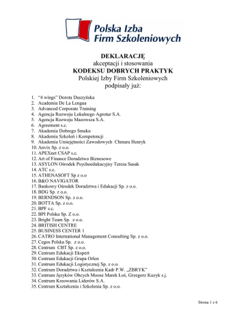 DEKLARACJĘ akceptacji i stosowania KODEKSU DOBRYCH PRAKTYK Polskiej Izby Firm Szkoleniowych podpisały już: 1. “4 wings” Dorota Duszyńska 2. Academia De La Lengua 3. Advanced Corporate Training 4. Agencja Rozwoju Lokalnego Agrotur S.A. 5. Agencja Rozwoju Mazowsza S.A. 6. Agreement s.c. 7. Akademia Dobrego Smaku 8. Akademia Szkoleń i Kompetencji 9. Akademia Umiejętności Zawodowych Chmara Henryk 10. Anvix Sp. z o.o. 11. APEXnet CSAP s.c. 12. Art of Finance Doradztwo Biznesowe 13. ASYLON Ośrodek Psychoedukacyjny Teresa Sasak 14. ATC s.c. 15. ATHENASOFT Sp z o.o 16. B&O NAVIGATOR 17. Bankowy Ośrodek Doradztwa i Edukacji Sp. z o.o. 18. BDG Sp. z o.o. 19. BERNDSON Sp. z o.o. 20. BOTTA Sp. z o.o. 21. BPF s.c. 22. BPI Polska Sp. Z o.o. 23. Bright Team Sp. z o.o. 24. BRITISH CENTRE 25. BUSINESS CENTER 1 26. CATRO International Management Consulting Sp. z o.o. 27. Cegos Polska Sp. z o.o. 28. Centrum CBT Sp. z o.o. 29. Centrum Edukacji Ekspert 30. Centrum Edukacji Grupa Orlen 31. Centrum Edukacji Logistycznej Sp. z o.o. 32. Centrum Doradztwa i Kształcenia Kadr P.W. „ZBRYK” 33. Centrum Języków Obcych Moose Marek Łoś, Grzegorz Kuzyk s.j. 34. Centrum Kreowania Liderów S.A. 35. Centrum Kształcenia i Szkolenia Sp. z o.o. Strona 1 z 6 36. Centrum Rozwiązań Menedżerskich S.A. 37. Centrum Rozwoju Biznesu i Administracji Grupy ITC (ITC CS Sp. z o.o.) 38. Centrum Szkolenia Zawodowego Sp. z o.o. 39. Centrum Szkoleń i Promocji KORA 40. Centrum Szkolenia i Promocji „Prestige” 41. Certes Sp. z o.o. 42. Certus Centrum Szkolenia i Doradztwa Sp. z o.o. 43. Coaching Center 44. Comartin 45. Communication Design Group 46. Communication One Consulting Sp. z o.o. 47. Conart Sp. z o.o. 48. C.L. Consulting i Logistyka Sp. z o. o. 49. CS Szkolenie I Doradztwo Sp. z o.o. 50. CE2 Centrum Edukacji M. Dziewa, E. Tarnas-Szwed Sp.j. 51. Dom szkoleń i doradztwa Mykowska Aleksandra 52. DOOR POLAND Sp. z o.o. 53. Edustacja.pl Sp. z o.o. 54. EFFECT GROUP Sp. z o.o. 55. Ego Centrum Edukacji i Doradztwa 56. Ekologus Sp. z o.o. 57. ENGLISH UNLIMITED 58. Europejska Grupa Konsultingowa 59. Europejski Instytut Psychologii Biznesu sp.j. 60. Europejskie Stowarzyszenie Badań i Rozwoju Inżynierii Informacji, Psychocybernetyki i NLP "COGITATE" 61. EUROPOINT 62. EXBIS EKSPERCI BIZNESMENON - Siewierski, Szopa i Szóstak sp. j. 63. Firma Szkoleniowa Agnieszka Wiśniewska - Woźniak 64. Firma Szkoleniowo Doradcza Anna Szywała s.c. 65. FIRMA 2000 Sp. z o.o. 66. Fokus Grupa doradczo – szkoleniowa 67. FPL Sp. z o.o. 68. Fundacja Edukacja Bez Granic 69. Fundacja Nauki Języków Obcych „Linguae Mundi” 70. Fundacja Promocji Europejskiej 71. Fundacja Rozwoju Bankowości Spółdzielczej we Wrocławiu 72. Fundacja Rozwoju Przedsiębiorczości 73. Fundacja „Wałbrzych 2000” 74. Fundacja Warszawski Instytut Bankowości 75. GB Resources Polska Sp. z o.o. 76. G.B. Management s.c. 77. Grupaconstans.pl 78. Grupa EK’s Polska 79. Grupa OSB s.c. 80. Grupa Tempo s.c. 81. GSI GROUP 82. HEIDTMAN&PIASECKI 83. Heuresis Sp. z o.o. Strona 2 z 6 84. Hoffmann Consulting Sp. z o.o. 85. HOUSE OF SKILLS 86. HPR Group Sp. z o.o. 87. HRP s.c. 88. HUMAN CHANGES FACTORY Sp. z o.o. 89. Human Partner 90. Human Solutions 91. IDES Consultants Polska Sp. z o.o. 92. IMPACT POLSKA Sp. z o.o. 93. Impuls BTL Sp. z o.o. 94. InfoAudit Sp. z o.o. 95. Inprogress Michał Pacyna 96. Inspiris Szkolenia Doradztwo Katarzyna Zych 97. Instytut Badań i Rozwoju Gospodarki 98. INTEGRA – Ośrodek Treningów i Konsultacji 99. Inventi Consulting s.c. 100. Invictus Sp. z o.o. 101. IRP Inwestycje-Rozwój-Personel Jarosław Niemczyk 102. J.G. Training Jadwiga Gwóźdź 103. KDK INFO Sp. z o.o. 104. Konsultacje i Szkolenia TROP Sp. z o.o. 105. Kontekst HR Sp. z o.o. 106. Kontrakt OSH 107. Kreator Premium 108. KSK Bezpieczeństwo Sp. z o.o. 109. KWIECIŃSCY Biuro Usług BHP I PPOŻ Dawid Kwieciński 110. K&K Katarzyna Łukaszuk 111. Laboratorium Psychoedukacji – Szkolenia i Doradztwo Sp. z o.o. 112. LEBIEDŹ CONSULTING Tomasz Lebiedź 113. Management Consulting Sp. z o.o. 114. Mazowieckie Centrum Szkoleń Sp. z o.o. 115. Meditor Ośrodek Kształcenia Ustawicznego 116. MEDIATOR Ośrodek Szkoleń i Doradztwa Gospodarczego Krzysztof Wierzęć 117. MEDVICE Katarzyna Krzesińska 118. MIĘDZYNARDOWA SZKOŁA BANKOWOŚCI I FINANSÓW Sp. z o.o. 119. MindLab Sp. z o.o. 120. MODERATOR s.c. 121. MPM prodAction Sp. z o.o. 122. MTD Marek Dziduszko 123. Nowe Horyzonty Świat Sukcesu Jolanta Poźniak 124. Nowe Motywacje Sp. z o.o. 125. OSI CompuTrain SA 126. Ośrodek Doradztwa i Treningu Kierowniczego 127. Ośrodek Kształcenia Zawodowego „Elpro” Sp. z o.o. 128. Ośrodek Nowych Technologii i Bezpieczeństwa Informatycznego Sp. z o.o. 129. Ośrodek Pomocy i Edukacji Psychologicznej INTRA 130. Ośrodek Studiów i Przedsiębiorczości Event Group Sp. z o.o. 131. O.K. Centrum Języków Obcych Sp. z o.o. 132. PDC Consensus Strona 3 z 6 133. 134. 135. 136. 137. 138. 139. 140. 141. 142. 143. 144. 145. 146. 147. 148. 149. 150. 151. 152. 153. 154. 155. 156. 157. 158. 159. 160. 161. 162. 163. 164. 165. 166. 167. 168. 169. 170. 171. 172. 173. 174. 175. 176. 177. 178. 179. 180. 181. Personel Profit Sp. z o.o. Perspektywa Tomasz Tynderenda P.H.U. „QT SYSTEM” PIOMAR HOUSE Piotr Dzikowski PM – Doradztwo Gospodarcze Sp. z o.o. POLANGLO Szkoła Języków Obcych Sp. z o. o. Polska Akademia Rachunkowości S.A. Polska Izba Przemysłu Farmaceutycznego i Wyrobów Medycznych „POLFARMED” Polskie Centrum Certyfikacji Sp. z o.o. Pomorska Akademia Kształcenia Zawodowego w Słupsku Sp. z o.o. Praxis s.c. PRO Consulting Group Inspiracje dla rozwoju Sp. z o.o. Profes Professional Business Law Medicine PROFESSIONAL Gracjan Grela Profirma Sp. z o.o. ProKadra Proqual Management Institute PROSPERA Consulting Renata Kaczyńska - Maciejowska PROSPERO BUSINESS TRAINING s.c. PRYMUS Sp. z o.o. Prywatne Przedsiębiorstwo Obsługi Regionów Zdzisław Kochanowicz Przedsiębiorstwo Naukowo-Badawczo-Usł